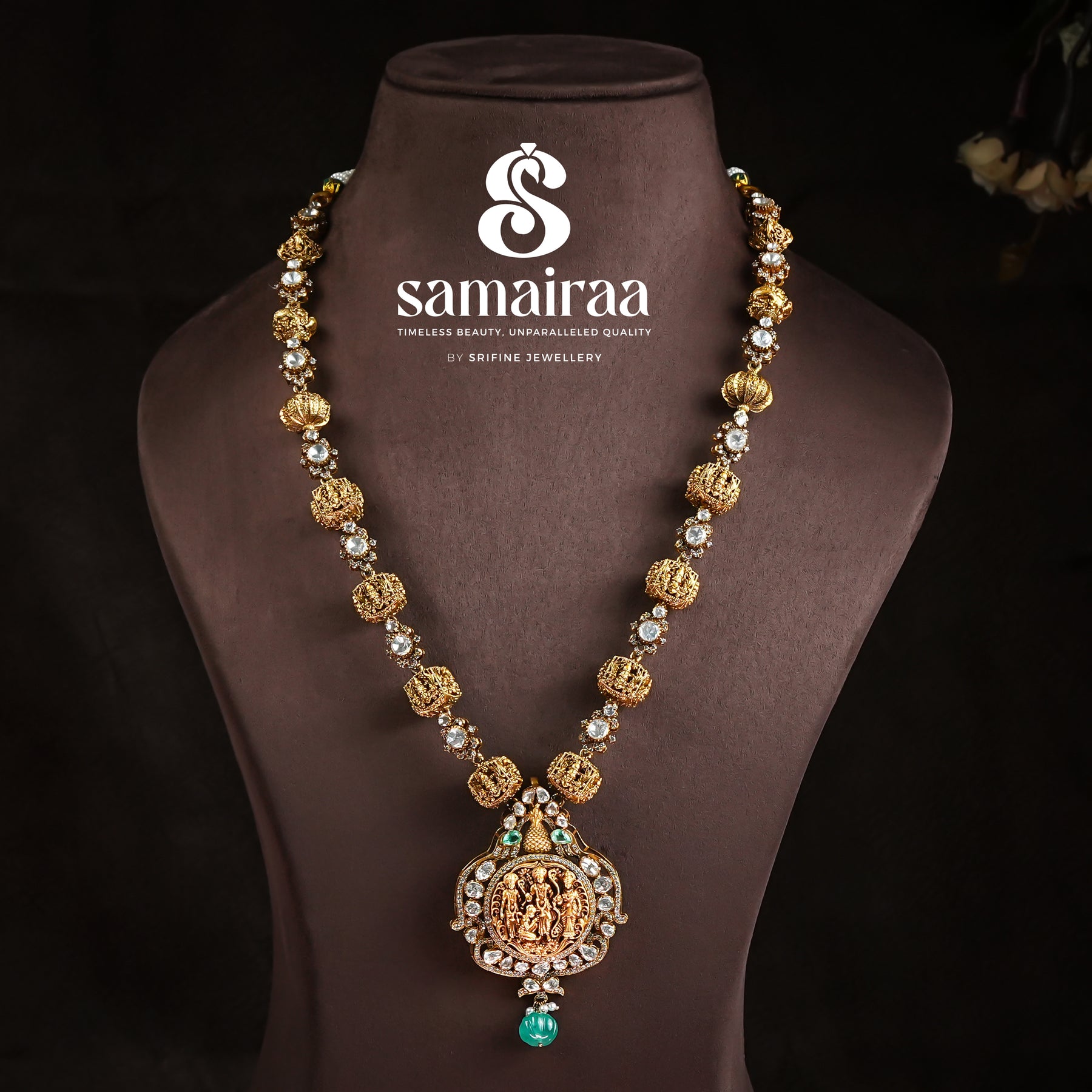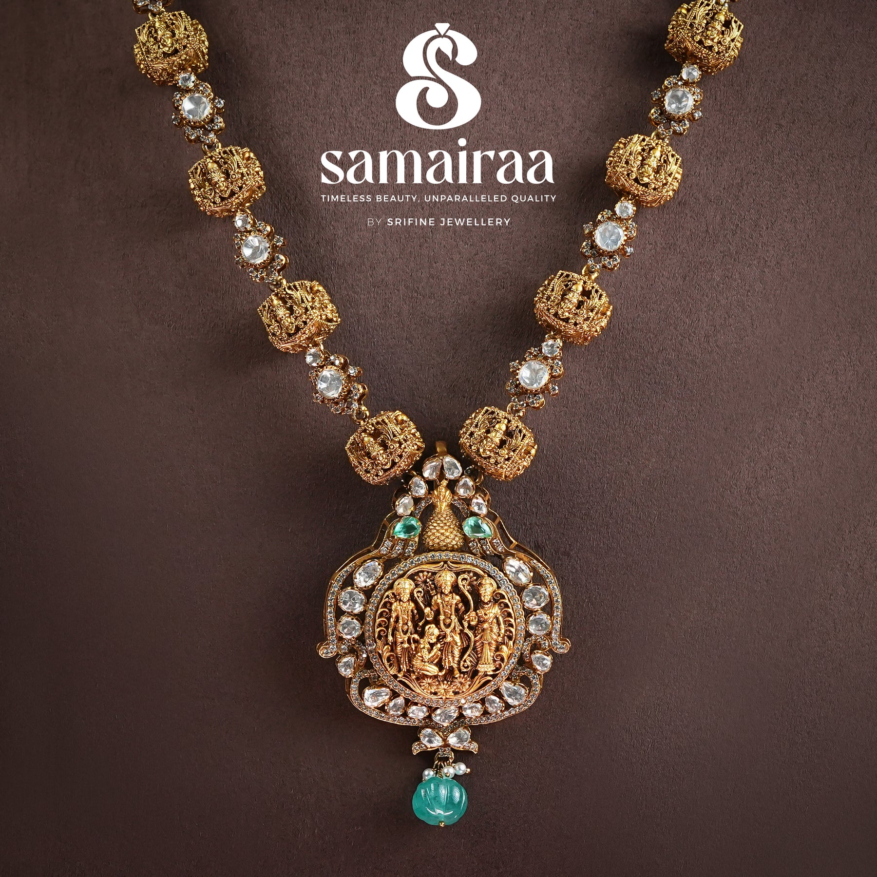 Exquisitely handcrafted 925 silver Temple Moissanite Necklace featuring a distinctive Lord Ram parivar pendant adorned with moissanites and semi-precious stones. This traditional nakshi necklace delivers an authentic gold appearance while offering exceptional value. Each piece is meticulously handmade, ensuring a one-of-a-kind heirloom that celebrates India's rich cultural heritage with uncompromising craftsmanship.