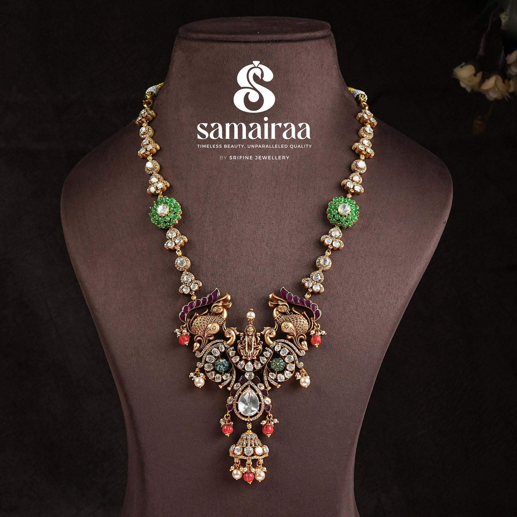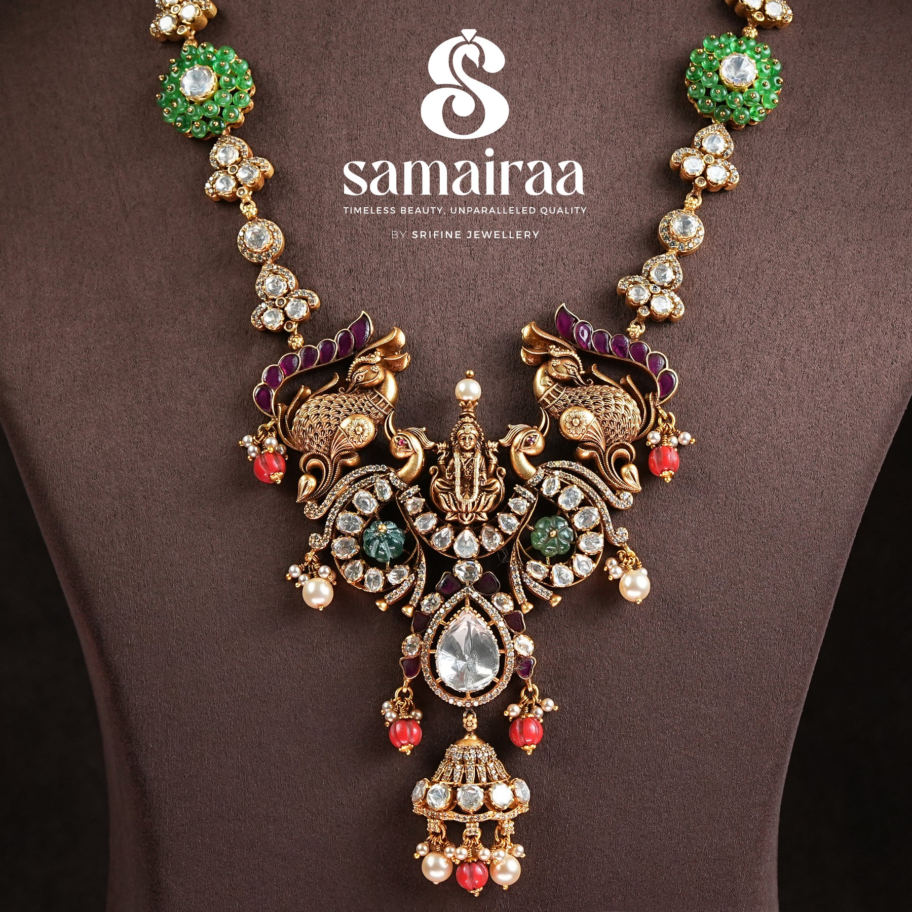 Exquisitely handcrafted 925 silver Temple Nakshi necklace featuring brilliant moissanites and semi-precious stones. This traditional piece delivers the opulent appearance of real gold while showcasing intricate temple-inspired nakshi work. Each necklace is meticulously handmade, ensuring a one-of-a-kind heirloom that honors ancient craftsmanship with contemporary luxury.