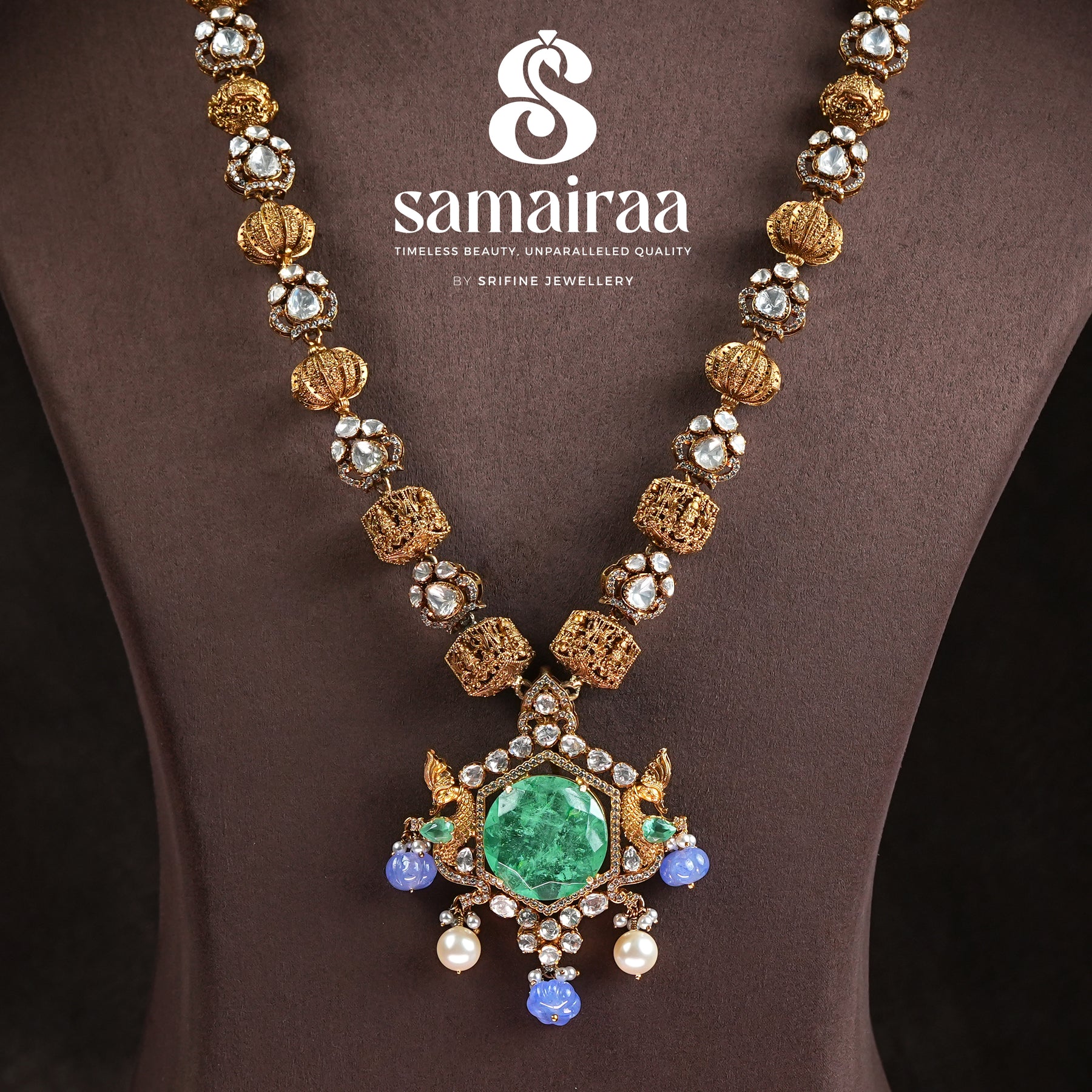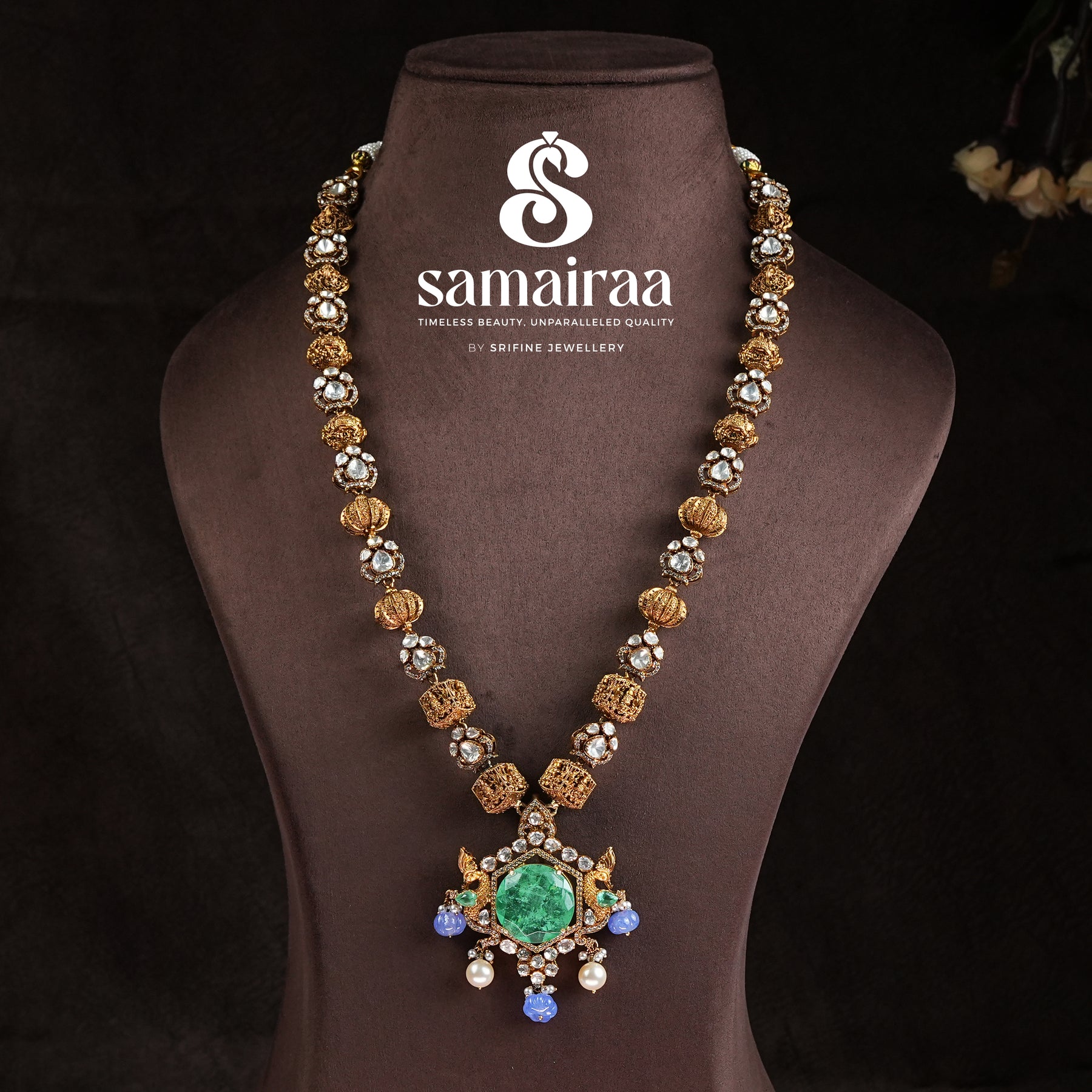 Exquisitely handcrafted 925 silver Temple Nakshi necklace featuring brilliant moissanites and semi-precious stones. This traditional piece delivers the opulent appearance of real gold while showcasing intricate temple-inspired design elements. Each necklace is meticulously handmade, ensuring a one-of-a-kind heirloom that honors classical Indian craftsmanship with contemporary luxury.