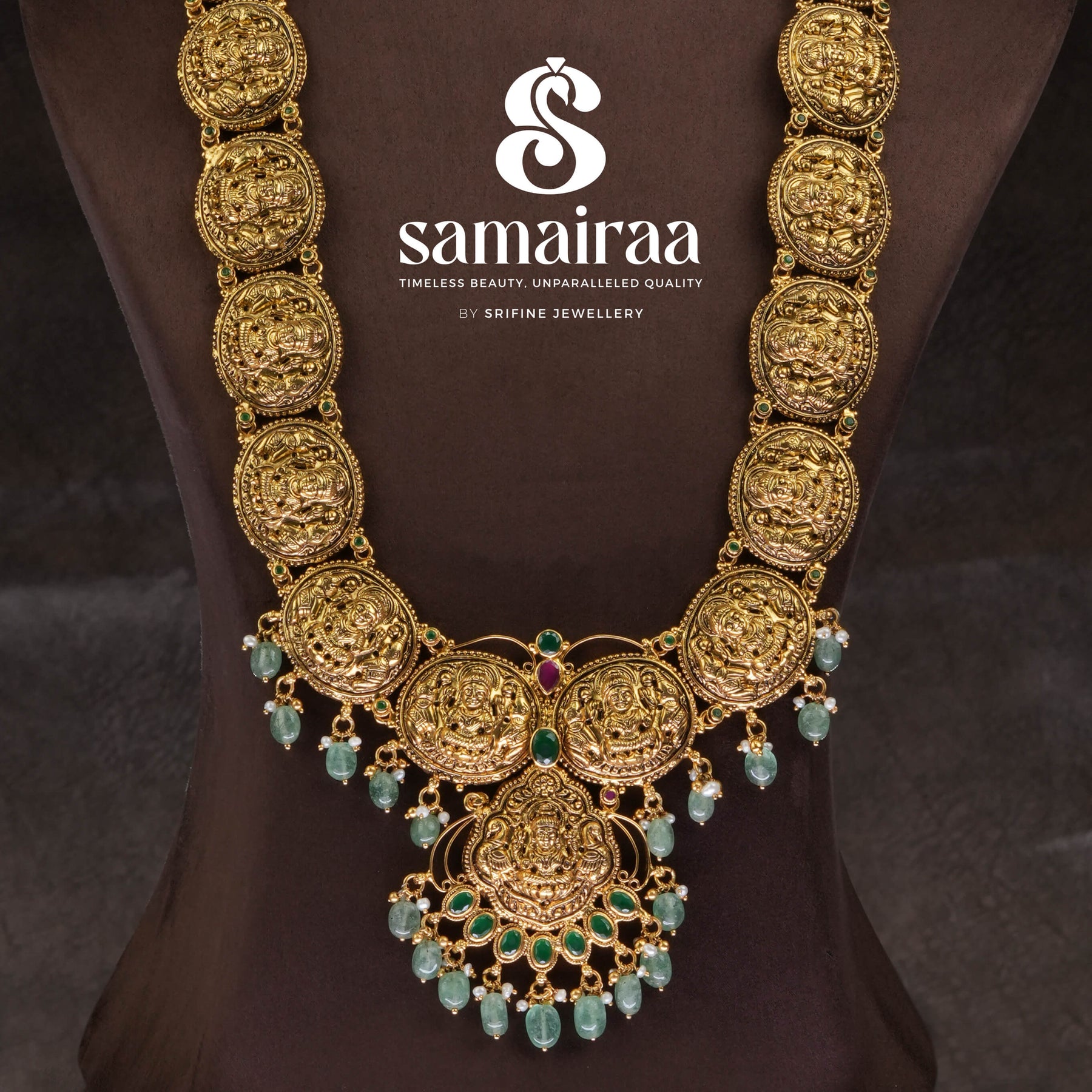 Crafted from 92.5% pure silver, this Temple Nakshi Necklace embodies Indian heritage with its intricate, handcrafted design that mimics the rich look of gold. Its traditional motifs and one-of-a-kind artistry make it a timeless piece, perfect for those who appreciate authentic craftsmanship and cultural elegance.