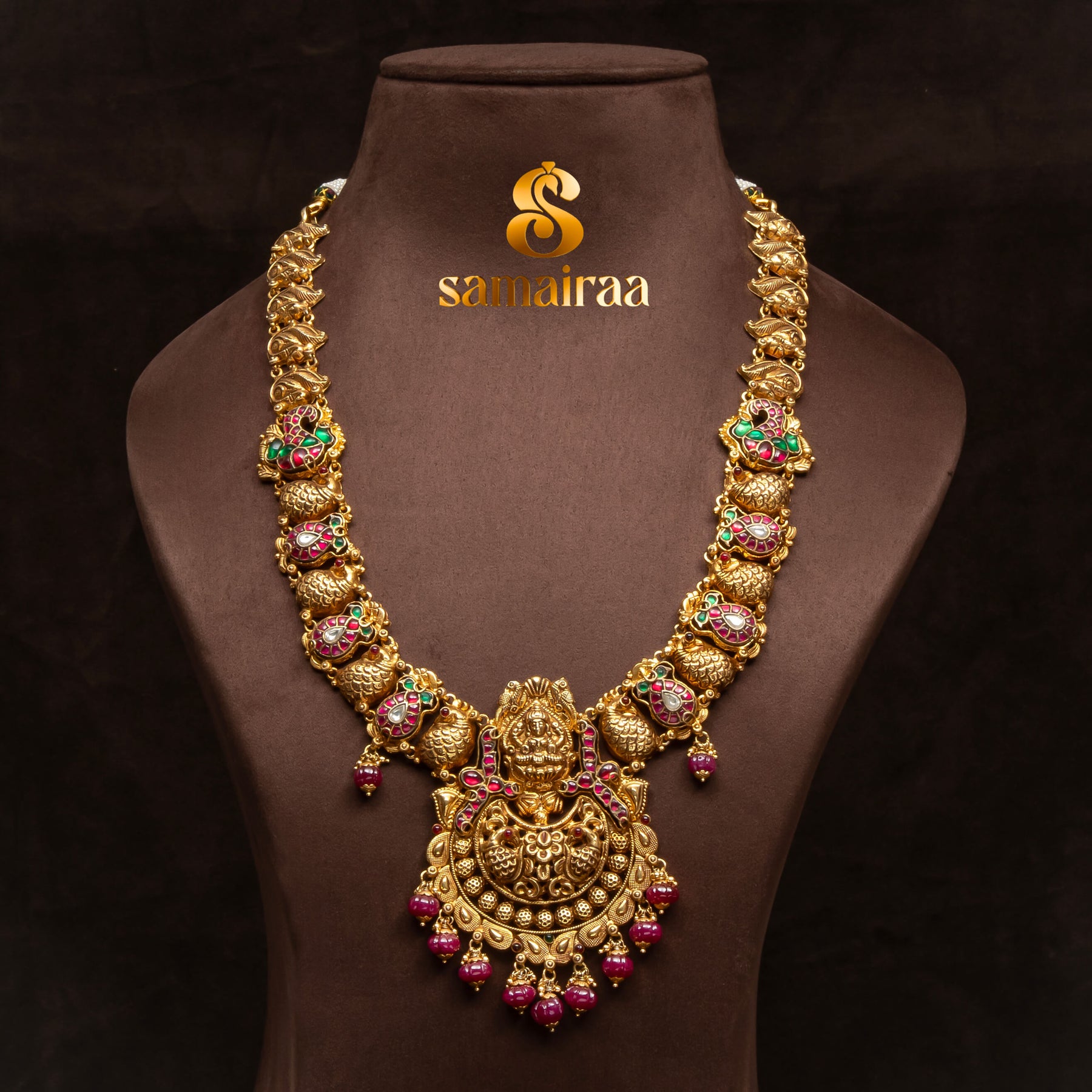 Crafted from 92.5% pure silver, the Temple Nakshi Necklace embodies Indian heritage with its intricate, handcrafted design. Featuring kundan stones that mimic the elegance of gold, this traditional piece offers a one-of-a-kind statement that honors timeless craftsmanship and cultural artistry. Perfect for those seeking authentic, expert-quality jewelry with a rich legacy.