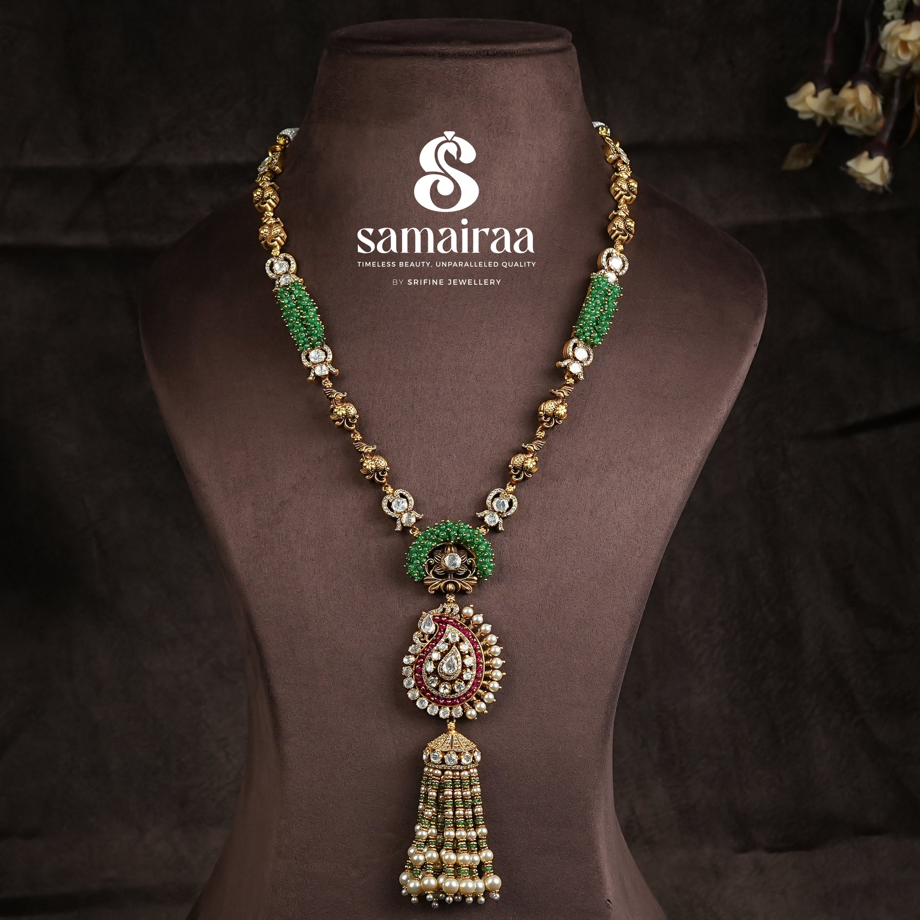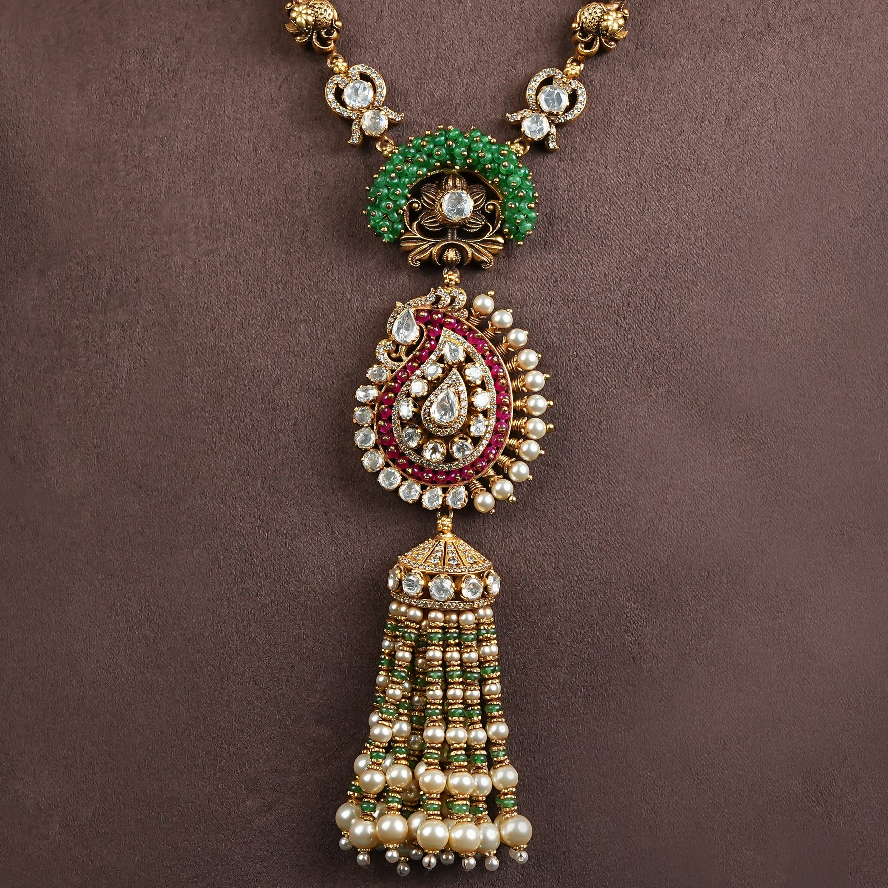 Expertly handcrafted temple nakshi necklace featuring brilliant moissanites and semi-precious stones. This traditional piece is meticulously made with 925 silver and finished with an authentic gold appearance. The intricate design showcases exceptional artisanship, making it a one-of-a-kind statement piece that honors traditional craftsmanship while providing timeless elegance.
