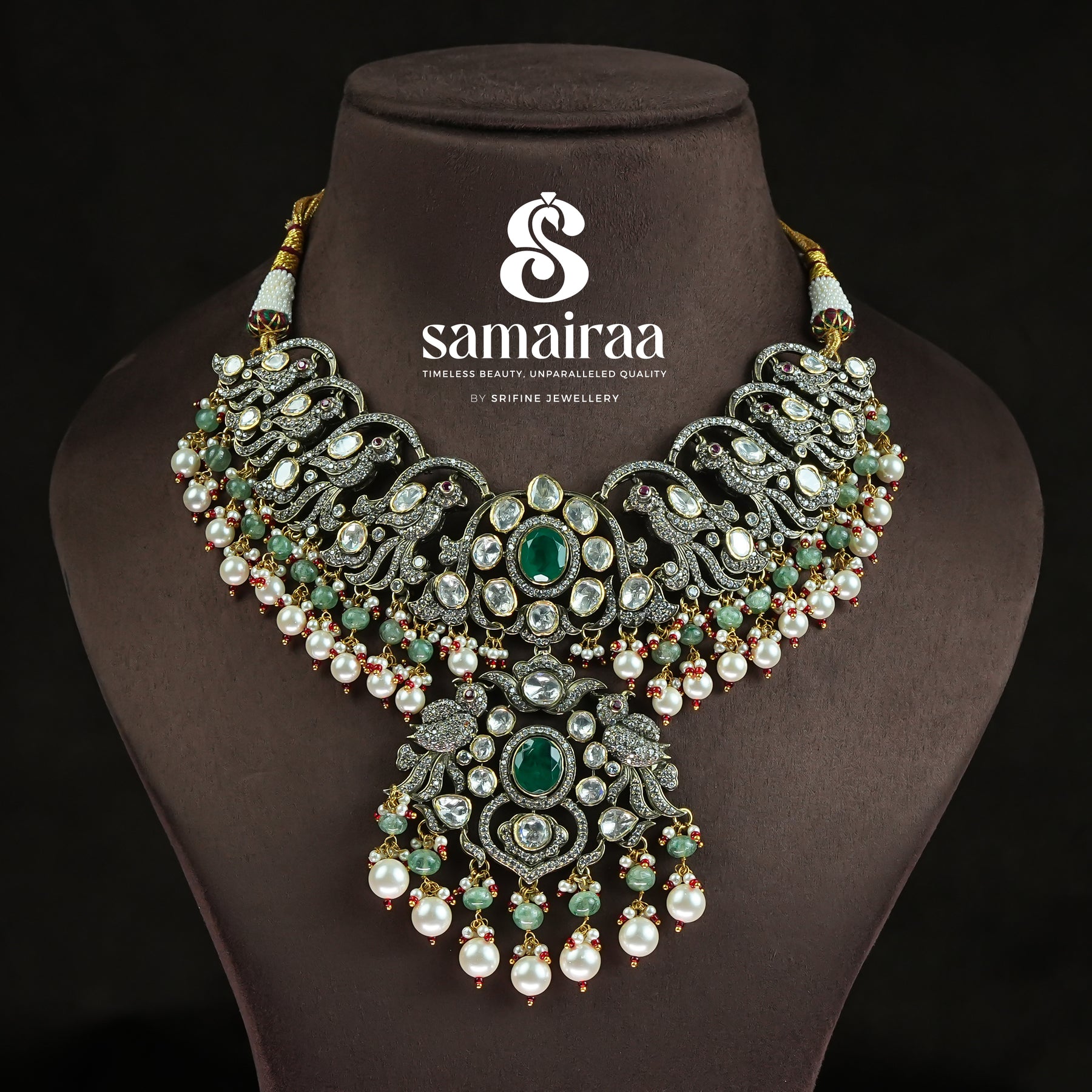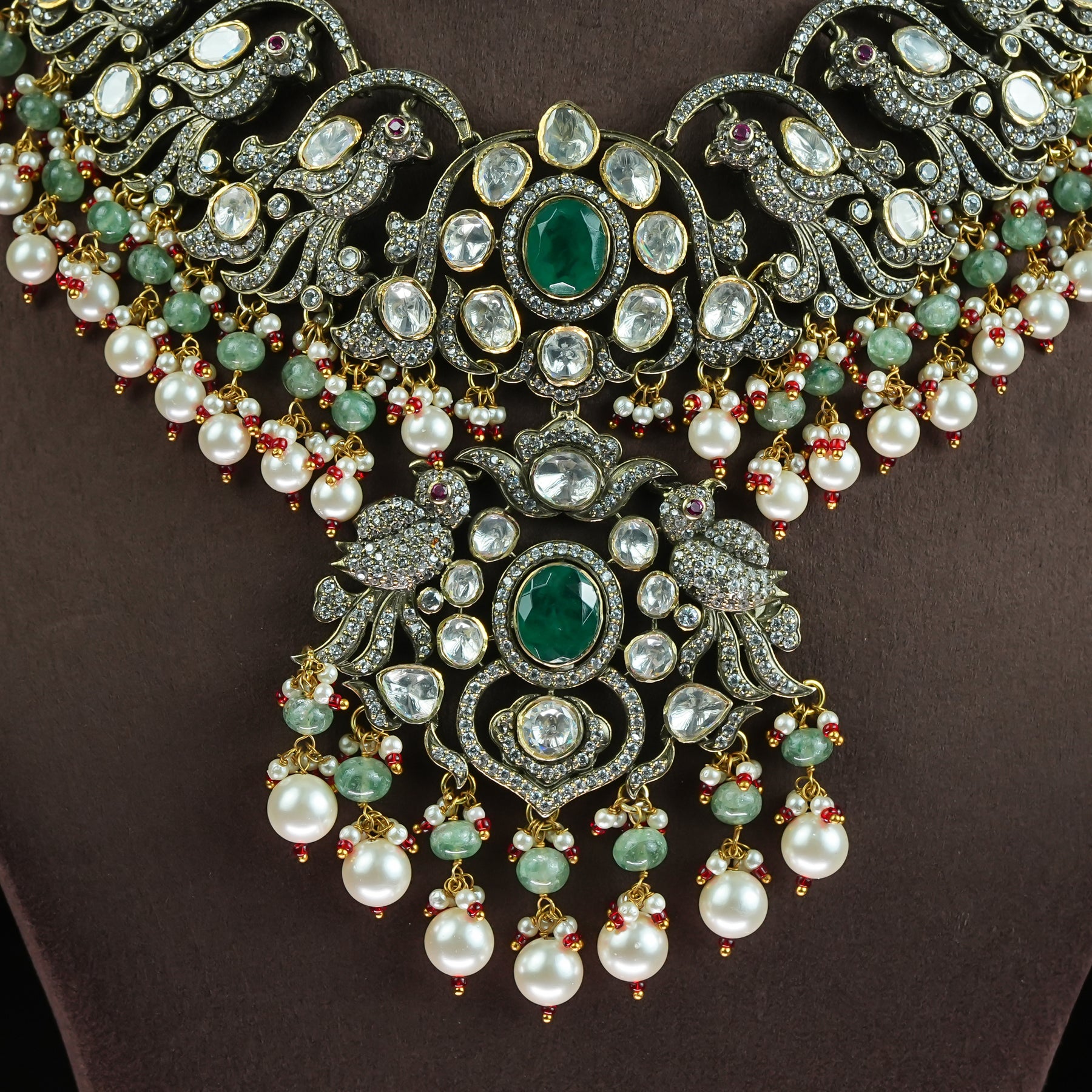 This meticulously hand-crafted 92.5 silver Victorian necklace showcases exquisite semi-precious emerald stones complemented by genuine CZ accents. The elegant design features delicate dangling pearls, creating a harmonious balance between historical inspiration and contemporary luxury. Perfect for collectors who appreciate fine craftsmanship and timeless sophistication.