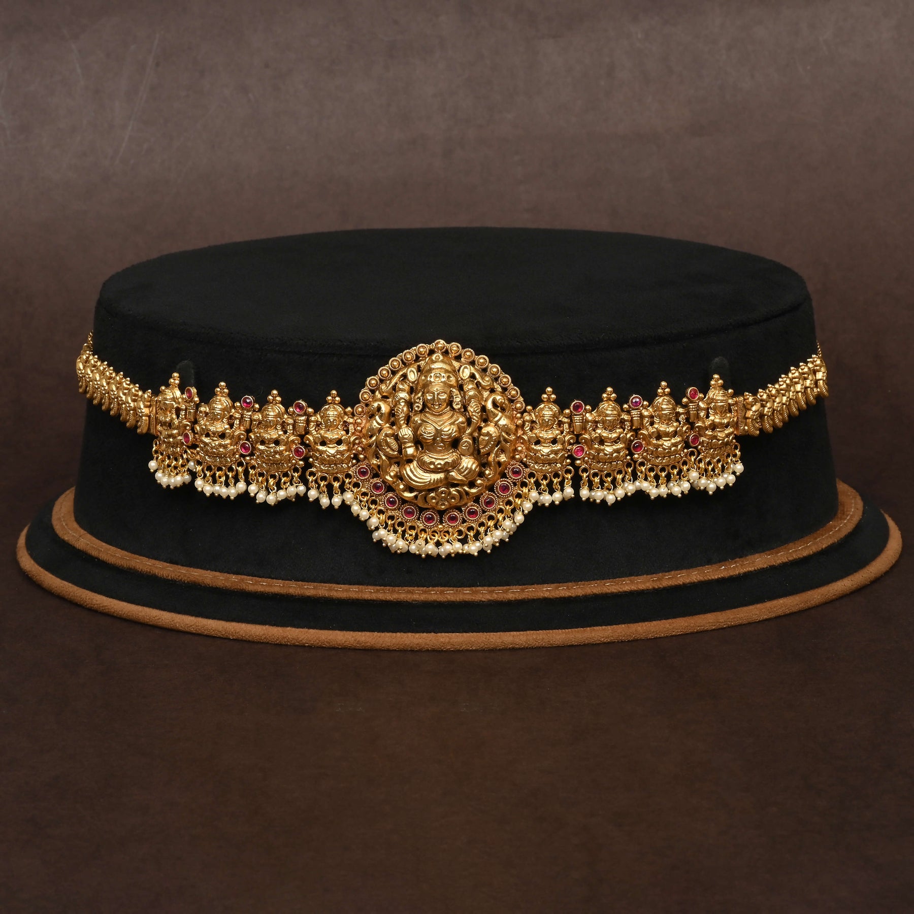 Elevate your traditional attire with this exquisite Temple Chain Vaddanam, a handcrafted masterpiece inspired by divine aesthetics. Featuring an authentic gold-like finish that captures the radiance of precious metal, this one-of-a-kind design showcases intricate detailing reminiscent of Goddess Lakshmi's grace. Each piece is meticulously crafted by skilled artisans, ensuring superior quality and timeless elegance. Perfect for festivals, weddings, or special occasions, this vaddanam seamlessly blends spiritual significance with contemporary craftsmanship, making it an essential addition to your jewellery collection.