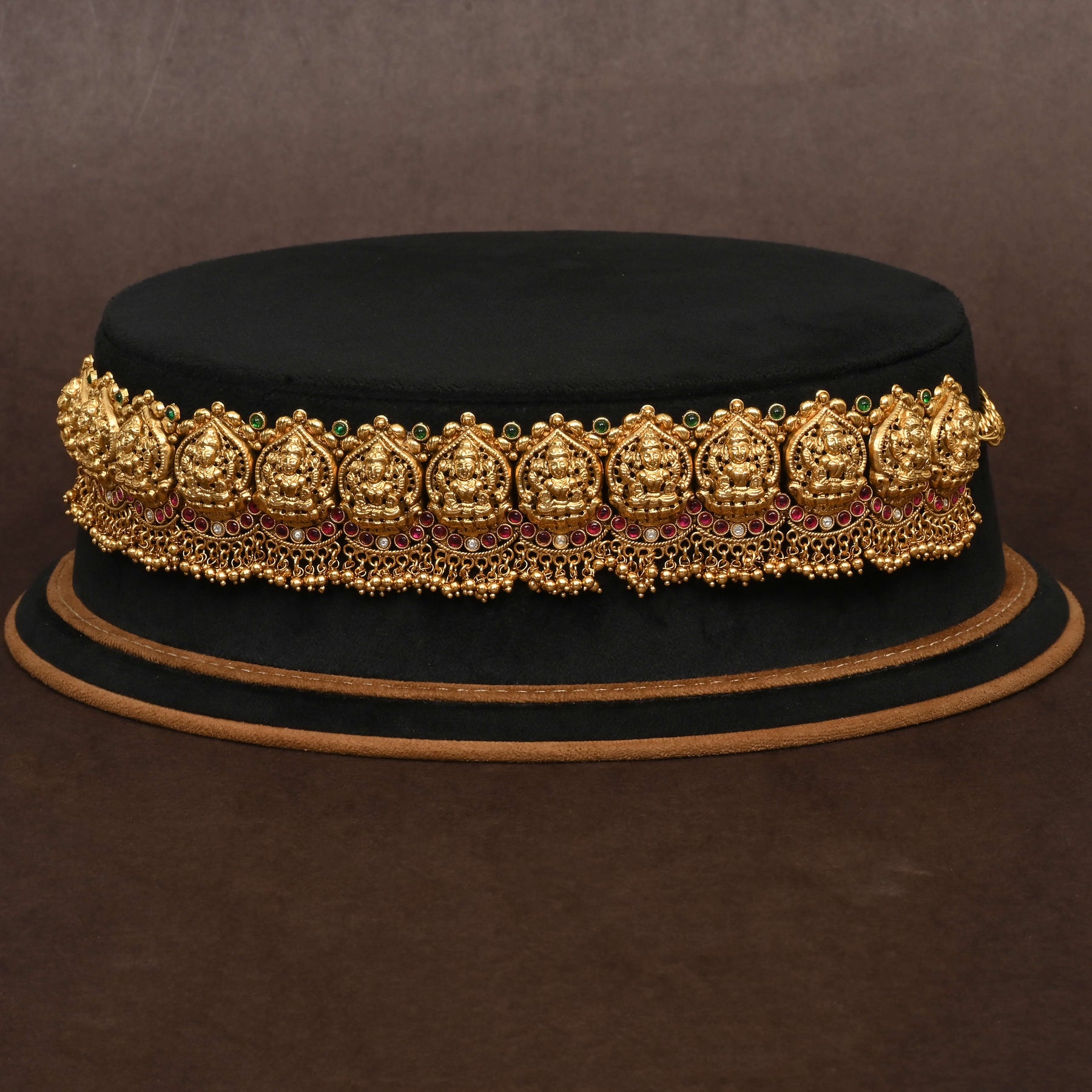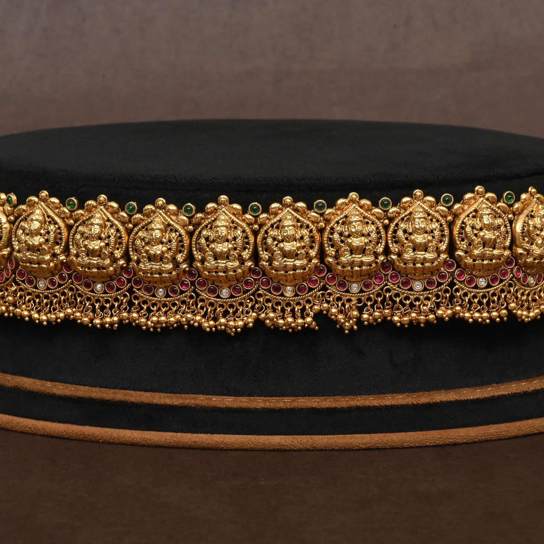 Elevate your traditional attire with this exquisite Temple Chain Vaddanam, a handcrafted masterpiece inspired by divine aesthetics. Featuring an authentic gold-like finish that captures the radiance of precious metal, this one-of-a-kind design showcases intricate detailing reminiscent of Goddess Lakshmi's grace. Each piece is meticulously crafted by skilled artisans, ensuring superior quality and timeless elegance. Perfect for festivals, weddings, or special occasions, this vaddanam seamlessly blends spiritual significance with contemporary craftsmanship, making it an essential addition to your jewellery collection.