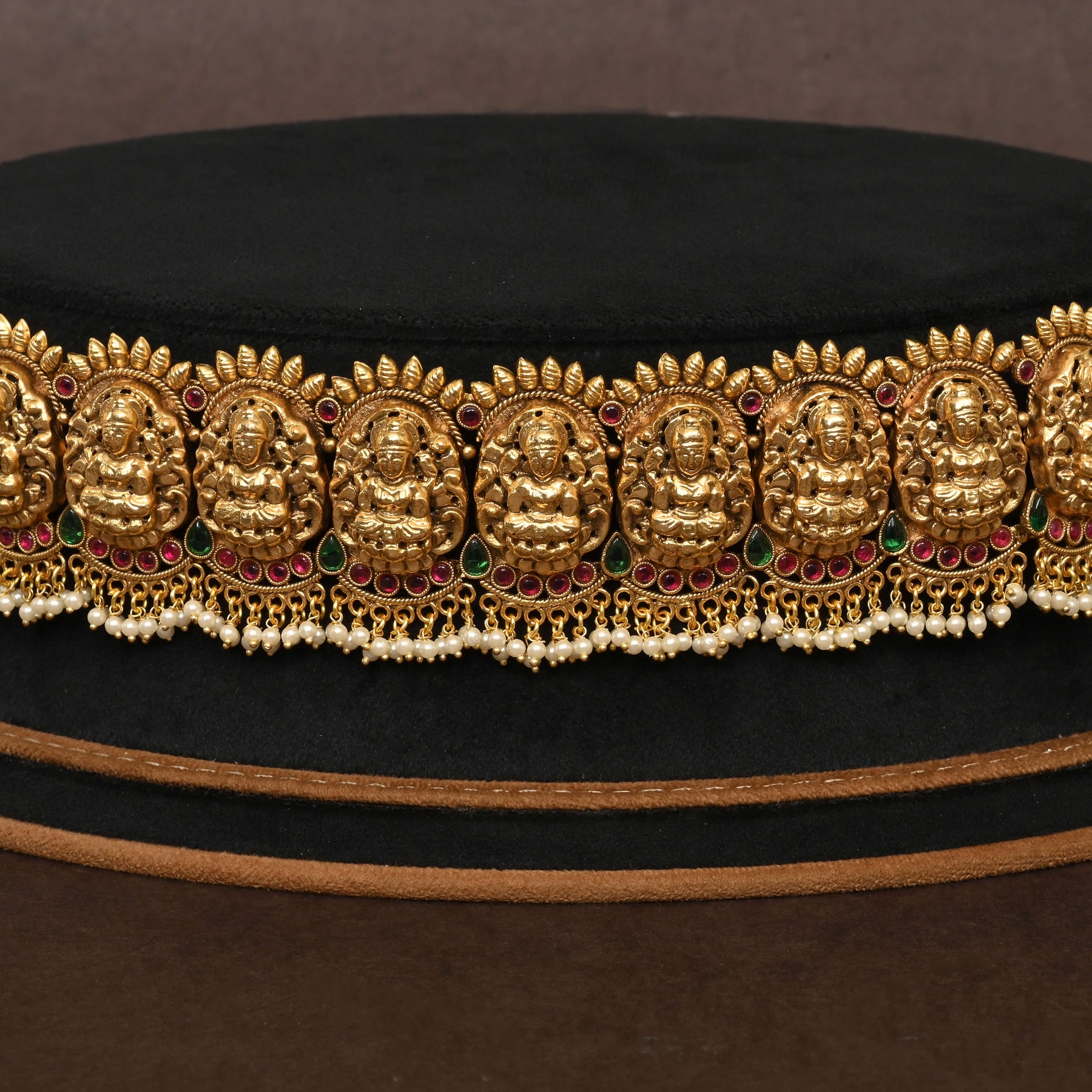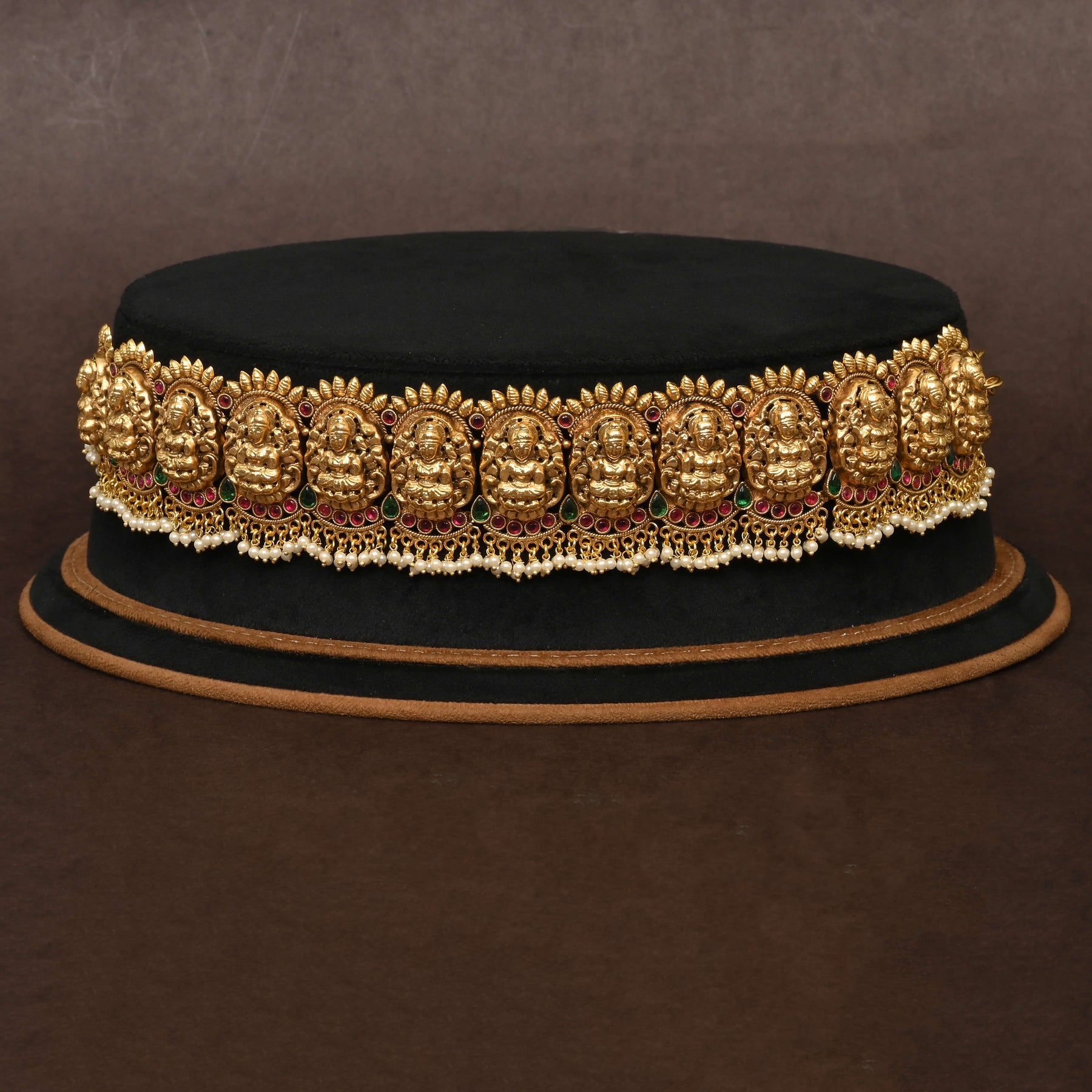 Elevate your traditional attire with this exquisite Temple Chain Vaddanam, a handcrafted masterpiece inspired by divine aesthetics. Featuring an authentic gold-like finish that captures the radiance of precious metal, this one-of-a-kind design showcases intricate detailing reminiscent of Goddess Lakshmi's grace. Each piece is meticulously crafted by skilled artisans, ensuring superior quality and timeless elegance. Perfect for festivals, weddings, or special occasions, this vaddanam seamlessly blends spiritual significance with contemporary craftsmanship, making it an essential addition to your jewellery collection.