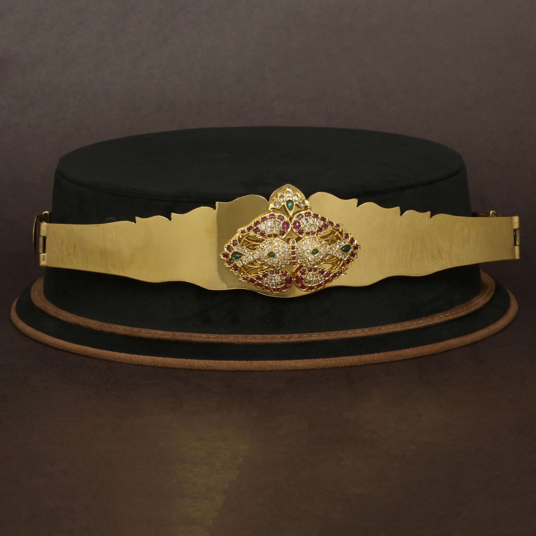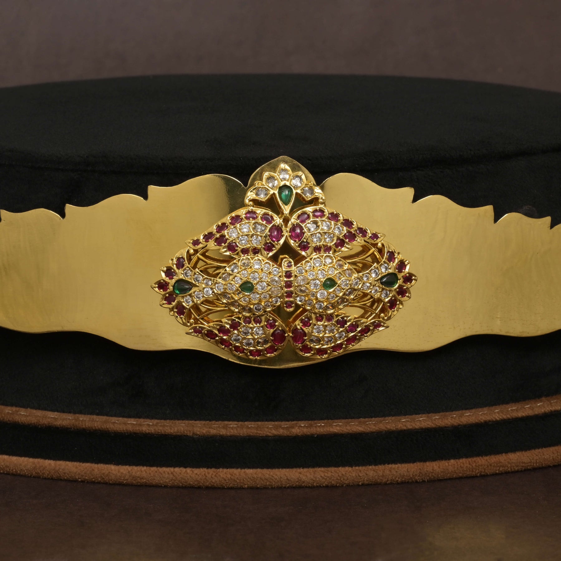 This handcrafted Temple Vaddanam features a unique, one-of-a-kind design with a stunning gold finish that closely resembles pure gold. Expertly crafted to enhance traditional attire, it offers timeless elegance and a distinctive charm that sets it apart. Ideal for special occasions, this piece reflects exquisite craftsmanship and cultural heritage.