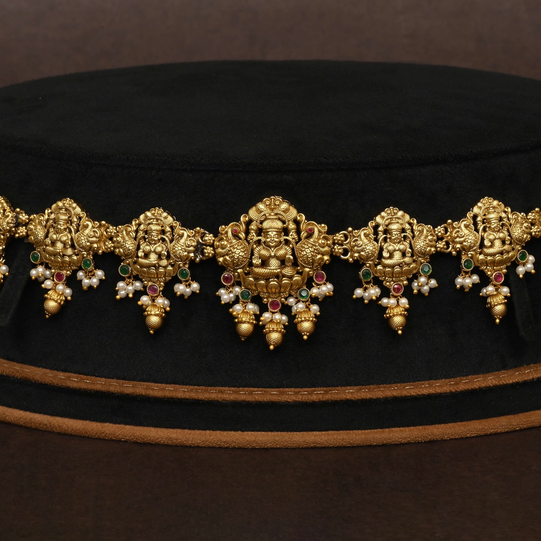 Temple Vaddanam featuring an exquisite Lakshmi Goddess motif, meticulously handcrafted to capture authentic divine elegance. This one-of-a-kind waist ornament showcases a lustrous gold finish that mirrors the richness of traditional temple jewelry. Each piece is individually crafted with meticulous attention to detail, making it a distinctive addition to your festive and ceremonial collection. Perfect for those seeking genuine artisanal craftsmanship with spiritual significance.