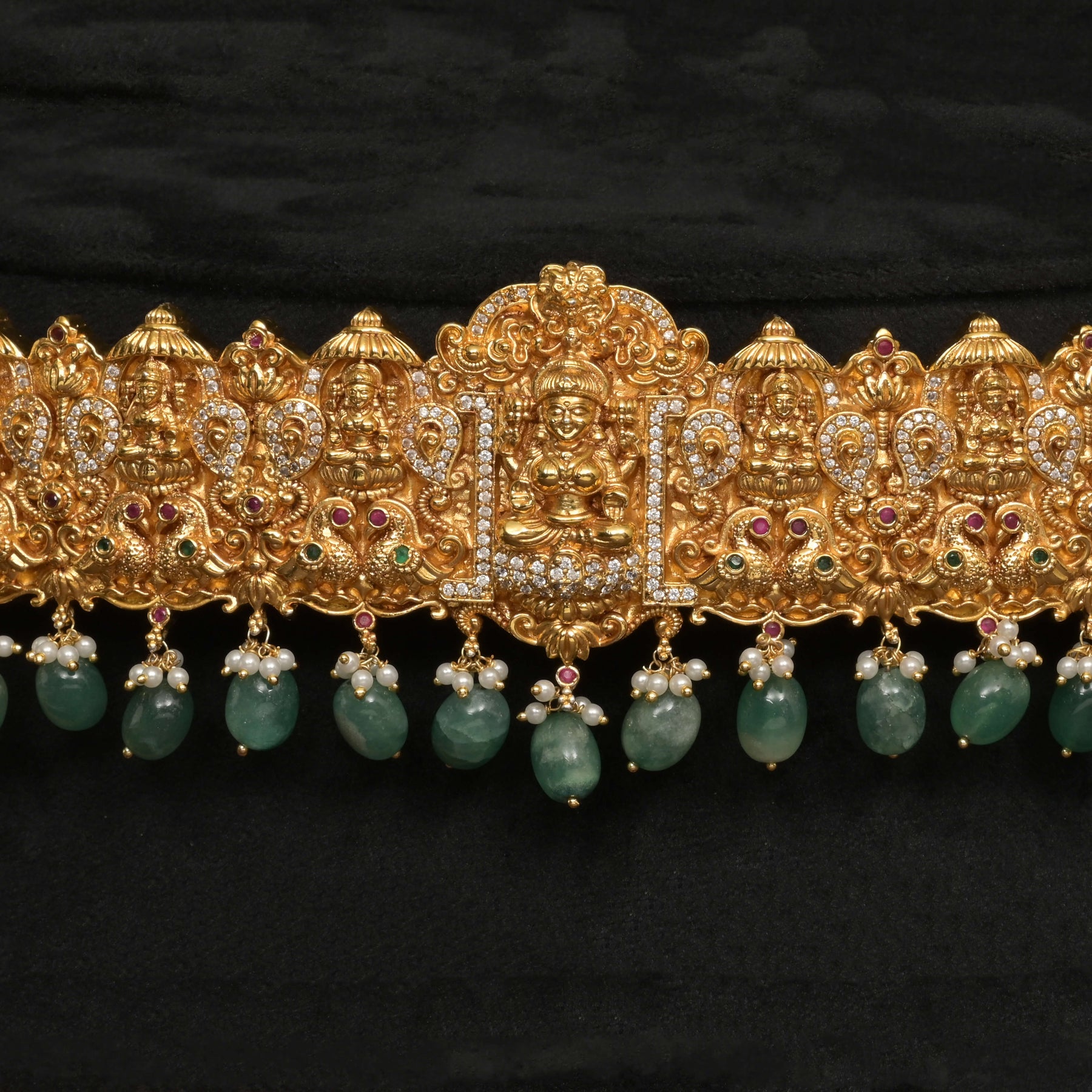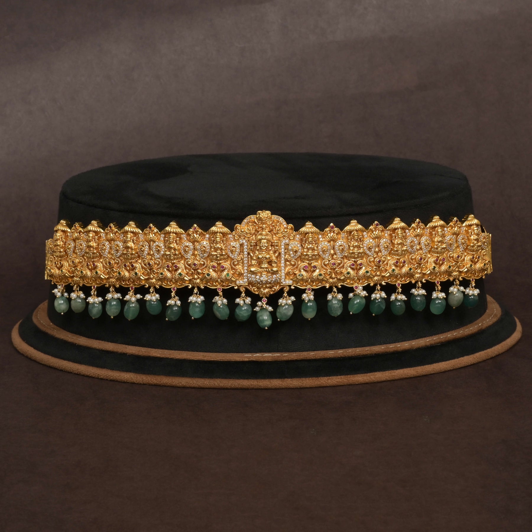 Experience the elegance of the Temple Vaddanam, meticulously handcrafted to showcase a one-of-a-kind design. Featuring genuine CZ stones with a radiant gold finish, this piece beautifully captures the divine essence of Goddess Lakshmi. Its authentic gold-like appearance enhances traditional attire while offering lasting shine and durability. Ideal for those seeking expert craftsmanship combined with cultural heritage.