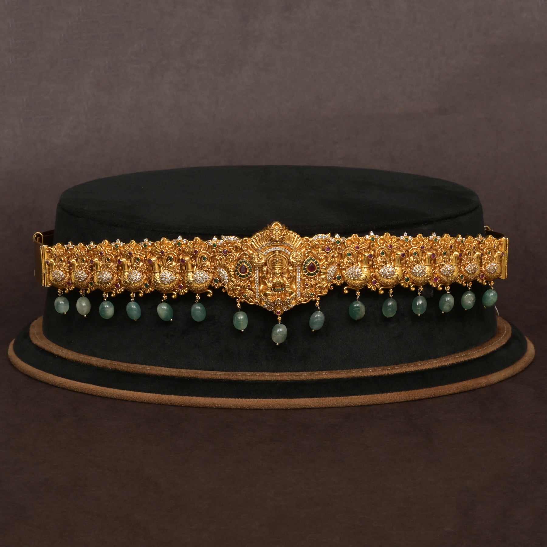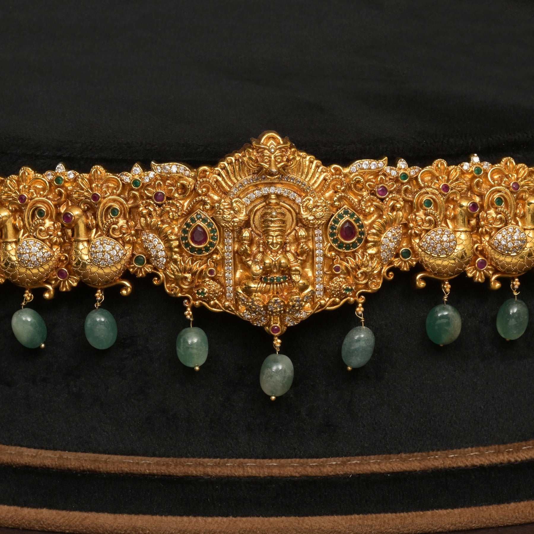 The Temple Vaddanam showcases expert craftsmanship with a gold-finish base, accentuated by genuine CZ stones that add brilliance. Featuring an intricate Lakshmi Goddess motif and delicate green pearls dangling gracefully, this piece combines traditional symbolism with elegant artistry. Handcrafted to ensure a unique, one-of-a-kind design, it radiates the timeless charm of temple jewelry with a rich, golden appearance.