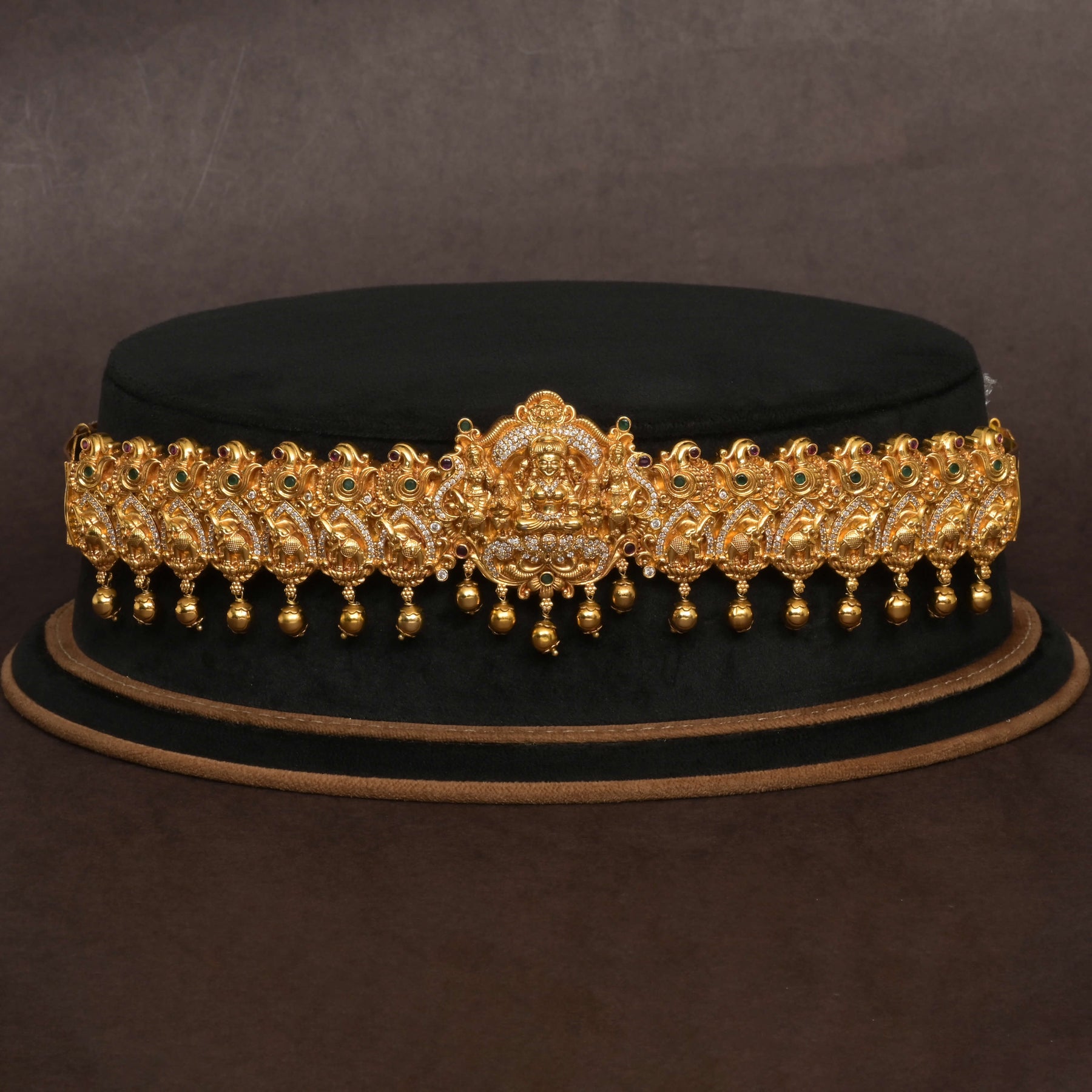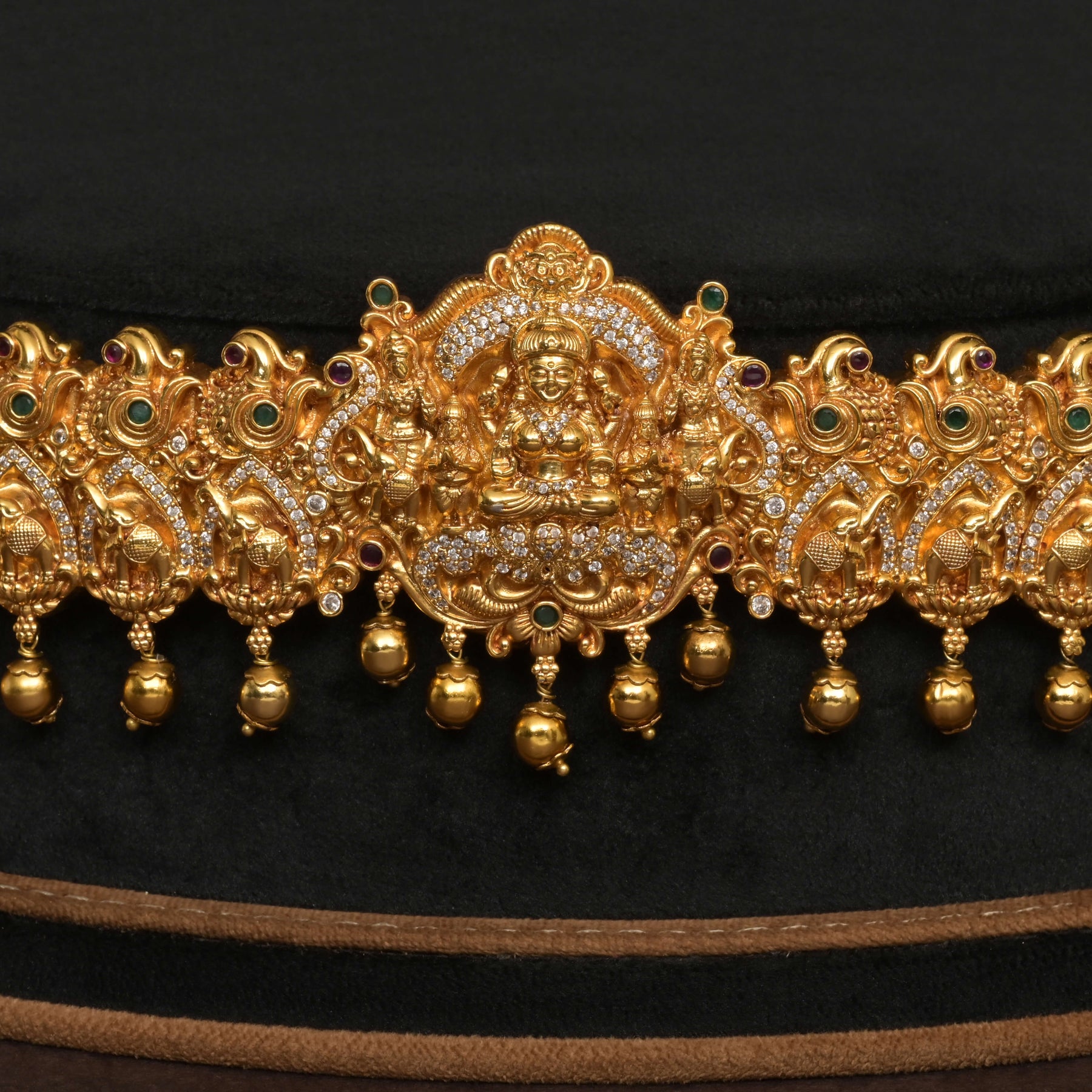 Experience the elegance of the Temple Vaddanam, meticulously handcrafted to resemble pure gold with a rich finish. Adorned with genuine CZ stones and featuring the revered Goddess Lakshmi, this unique piece blends traditional artistry with a luxurious look. Its one-of-a-kind design ensures you stand out with a timeless accessory that celebrates heritage and craftsmanship.