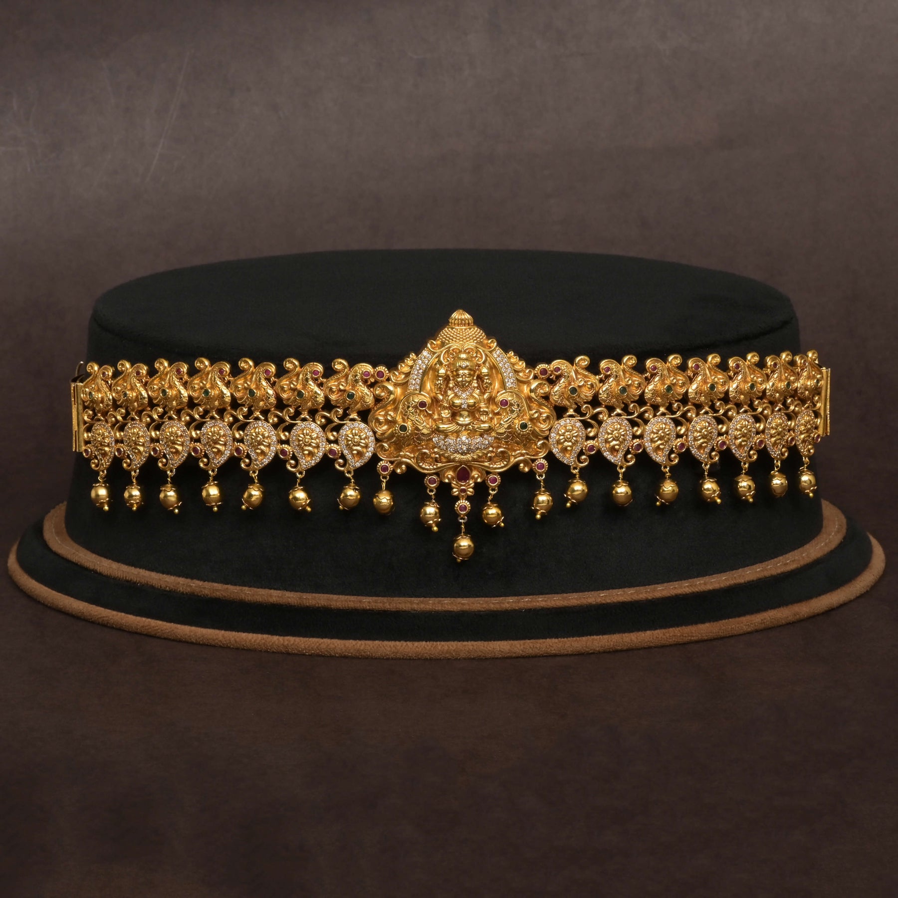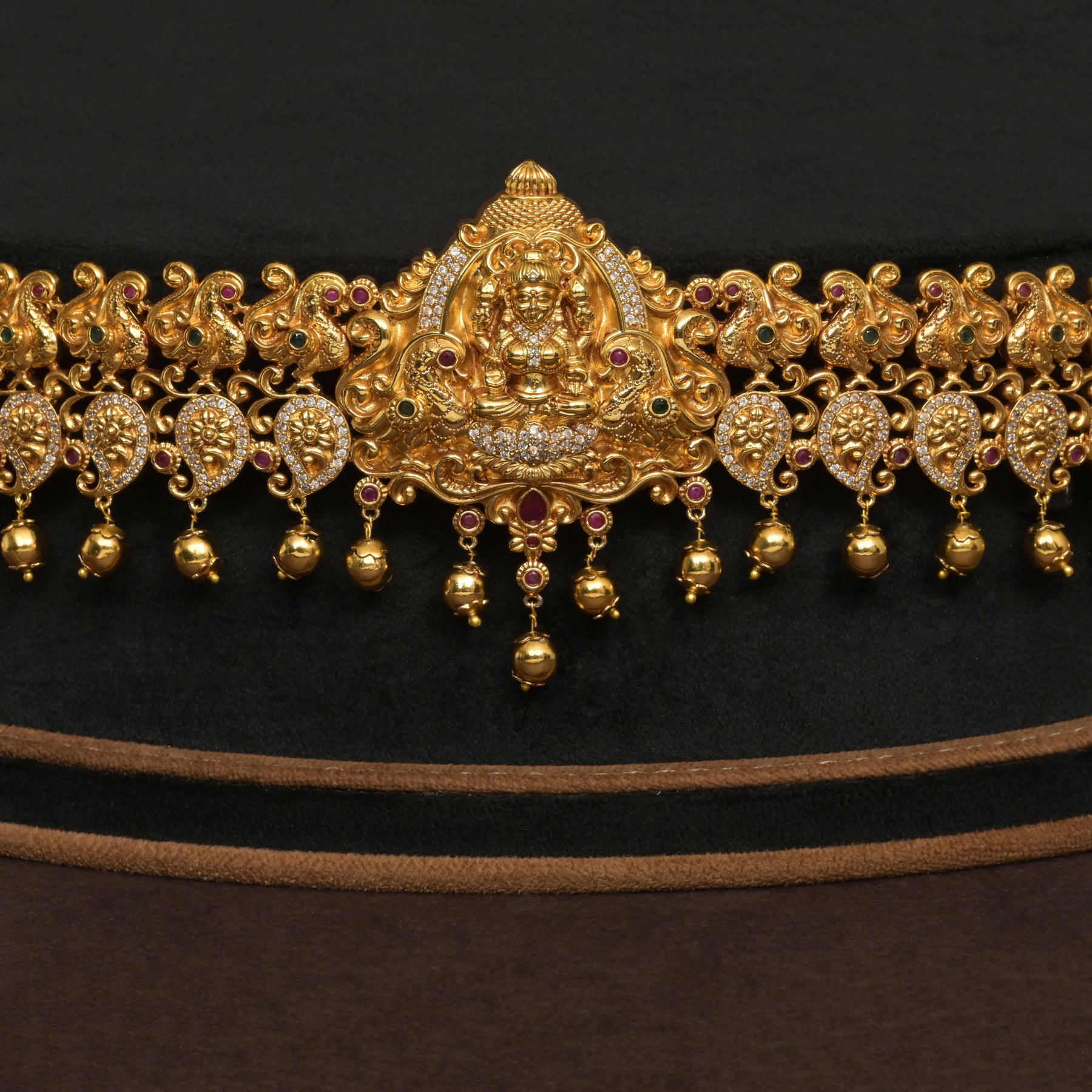 This Temple Vaddanam features a stunning gold finish with authentic CZ stones, expertly handcrafted to showcase intricate detailing. Designed with the revered Lakshmi Goddess motif, it offers a rich, gold-like appearance that enhances its traditional elegance. Each piece is unique, reflecting exceptional craftsmanship and a one-of-a-kind design, making it a distinguished addition to your jewelry collection.