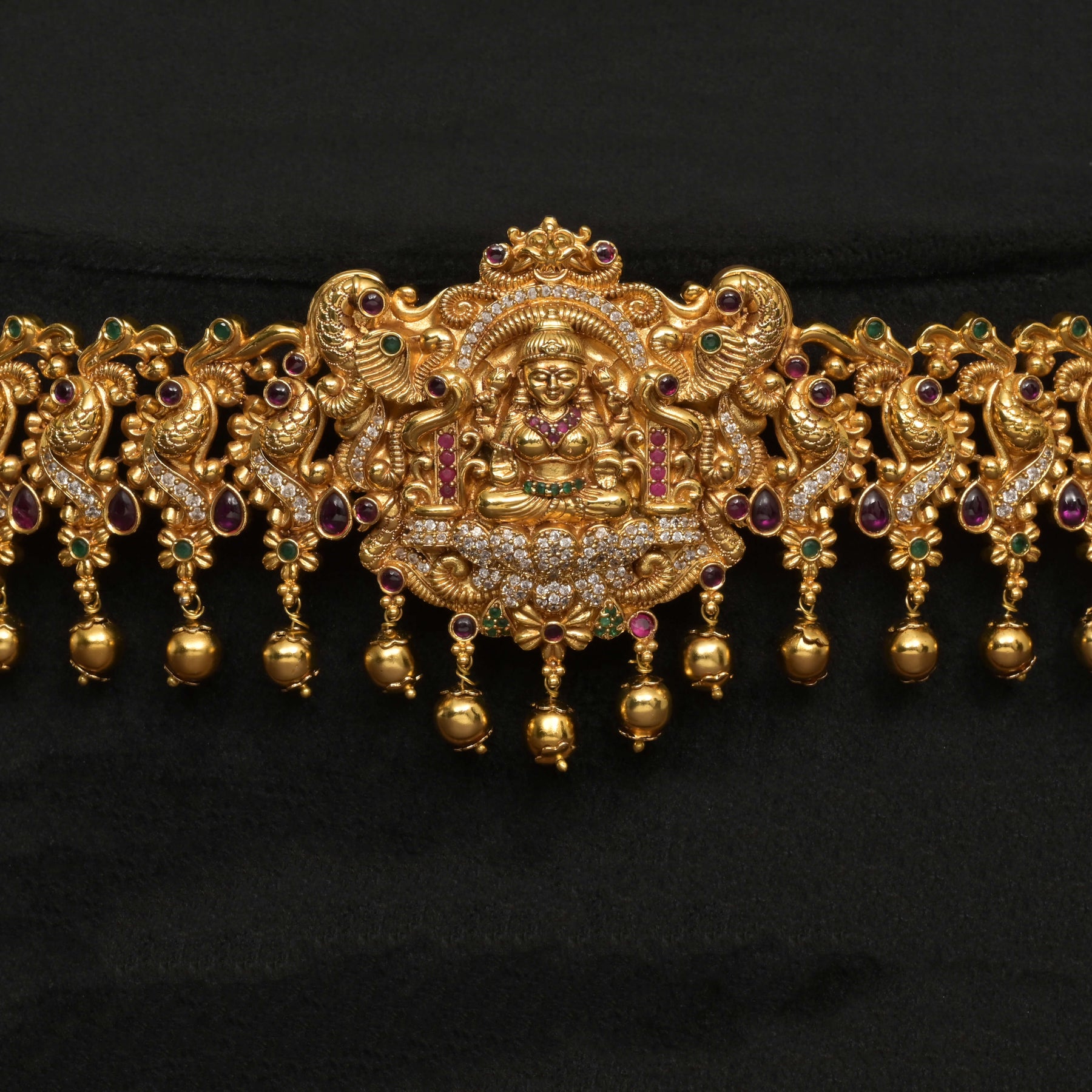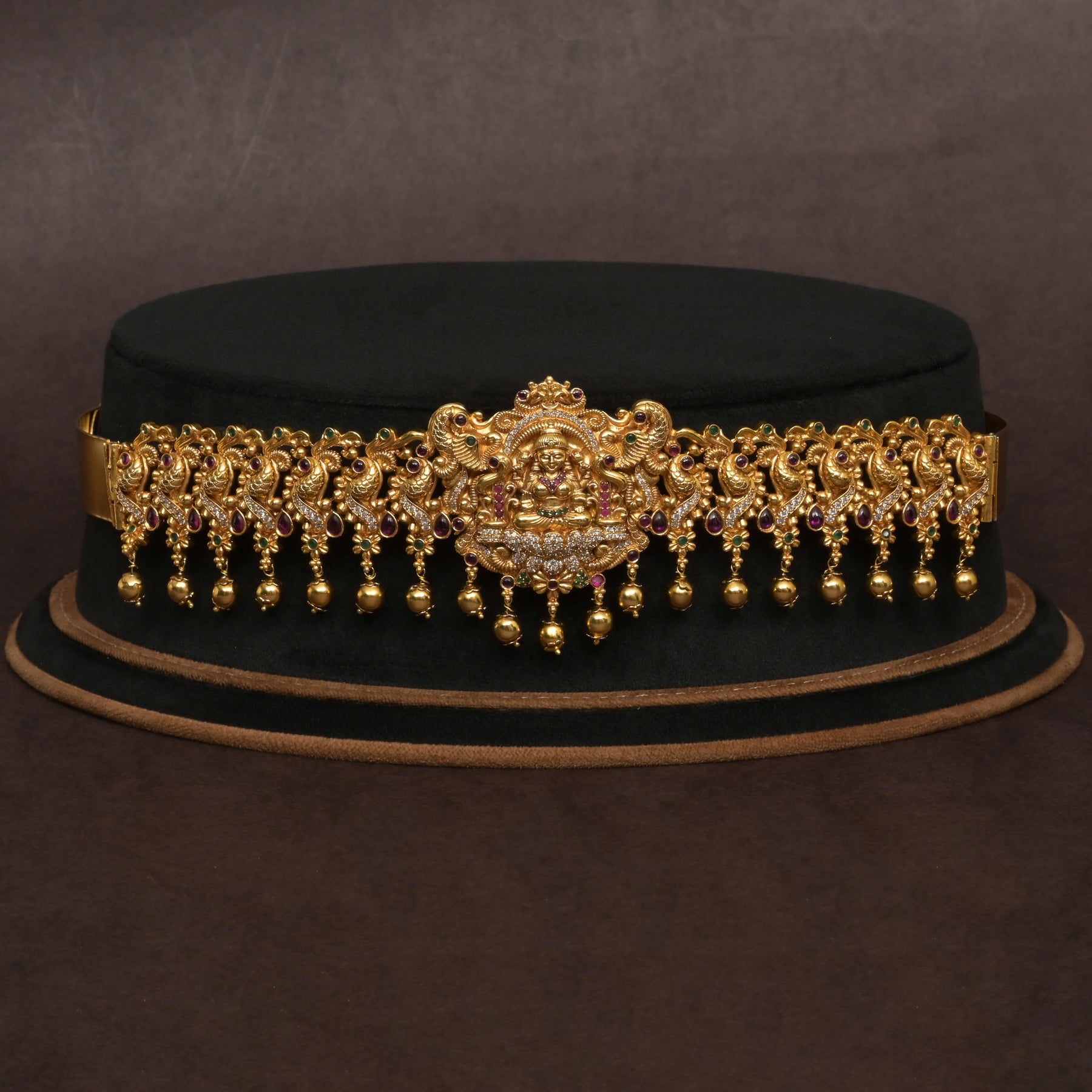 This Temple Vaddanam features a stunning gold finish with authentic cubic zirconia stones, creating the appearance of real gold jewelry. Meticulously handcrafted, it showcases a detailed depiction of Goddess Lakshmi, symbolizing prosperity and fortune. Its unique, one-of-a-kind design adds a traditional yet elegant touch to any attire, making it a remarkable piece for special occasions.