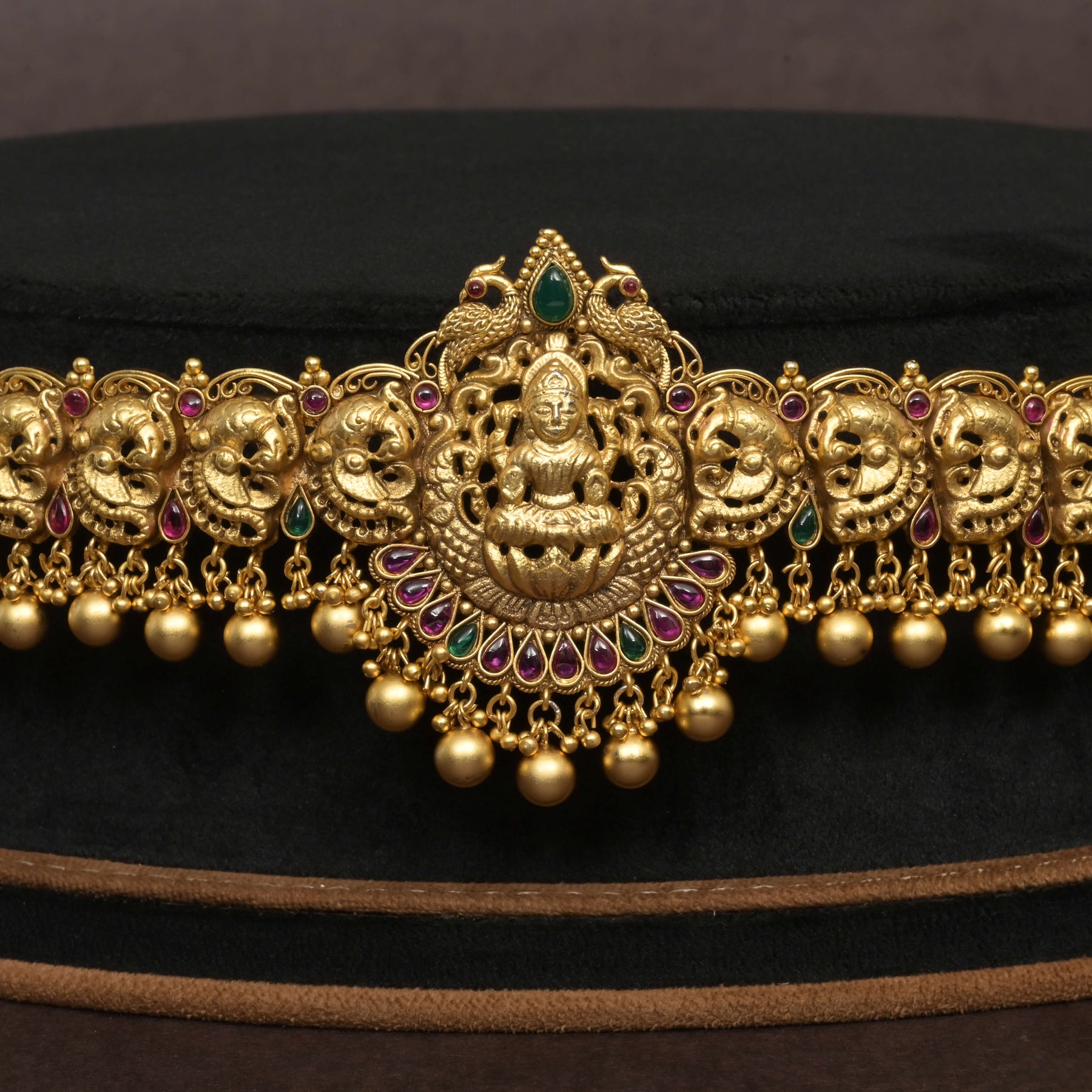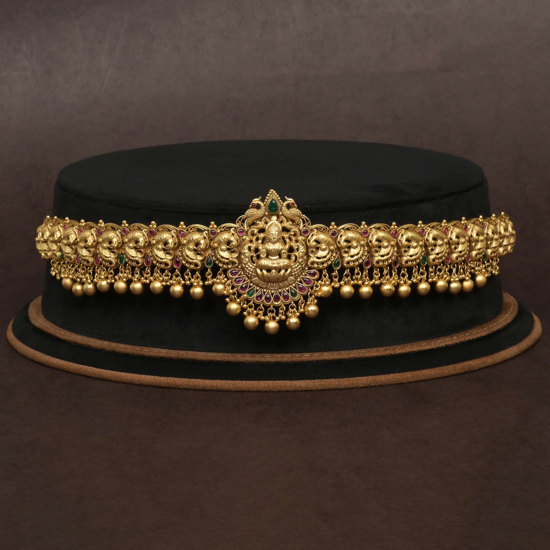 Experience the exquisite artistry of the Temple Vaddanam, featuring a radiant gold finish that mimics the richness of real gold. Adorned with authentic CZ stones, this handcrafted piece showcases the revered Lakshmi Goddess, embodying prosperity and grace. Each Vaddanam is a unique creation, blending traditional motifs with one-of-a-kind design elements, making it a distinguished addition to your collection. Perfect for elevating ceremonial attire with timeless elegance.