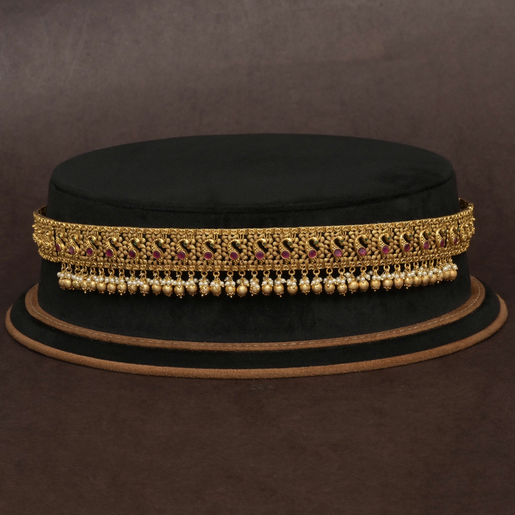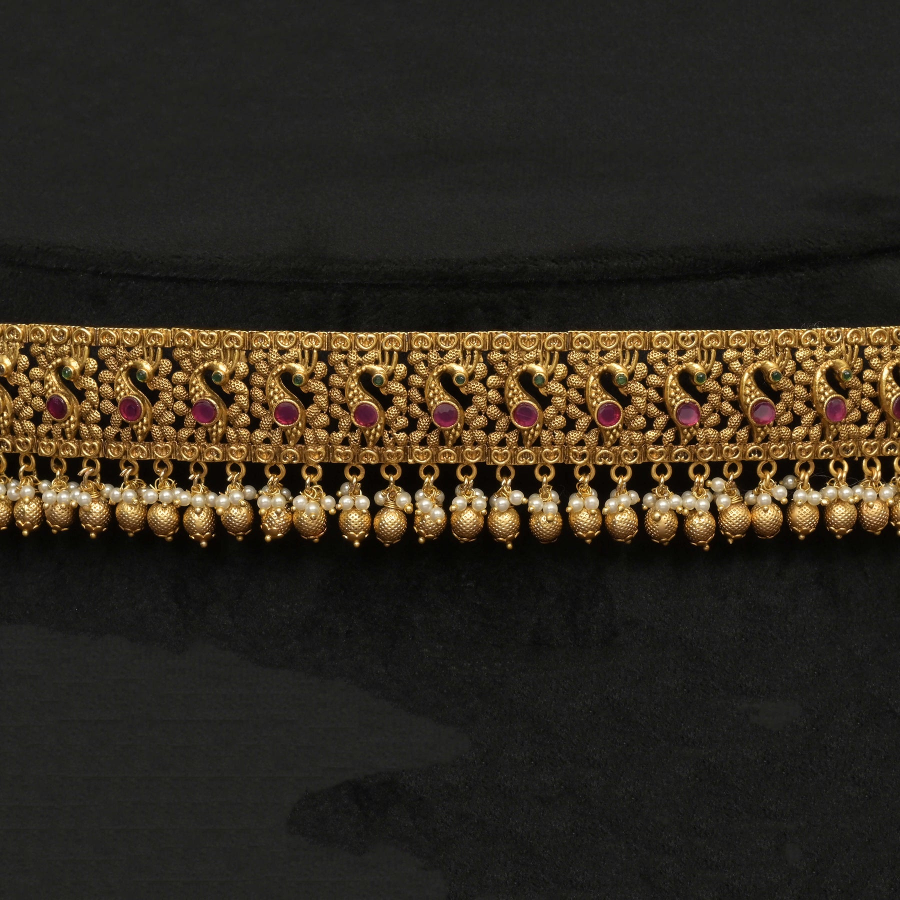 Elevate your traditional attire with the Temple Vaddanam, expertly handcrafted to showcase a stunning peacock design adorned with genuine CZ stones. This one-of-a-kind piece offers the rich appearance of gold finish while maintaining durability and elegance. Perfectly balancing intricate artistry and timeless appeal, it enhances any festive or ceremonial ensemble with a regal touch.