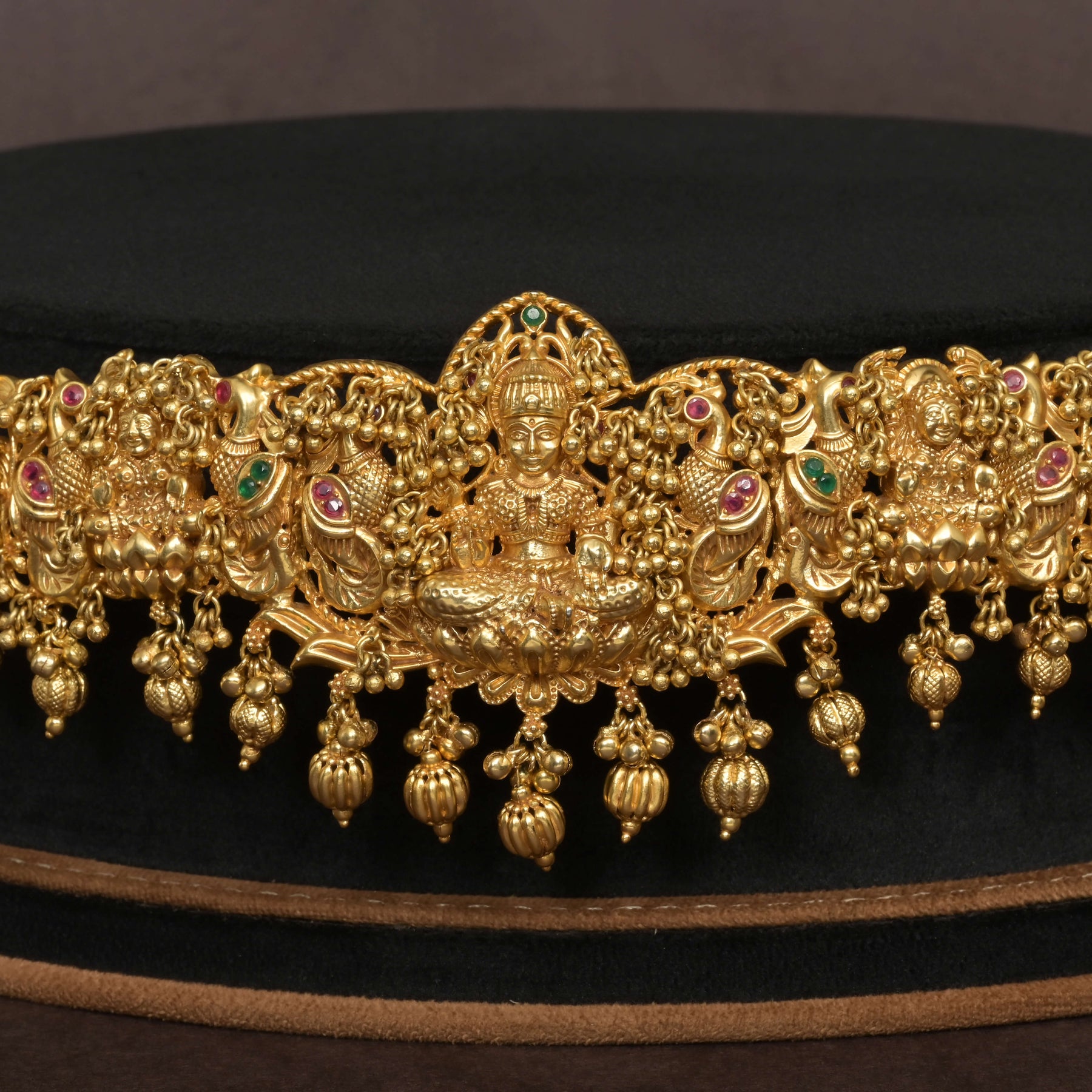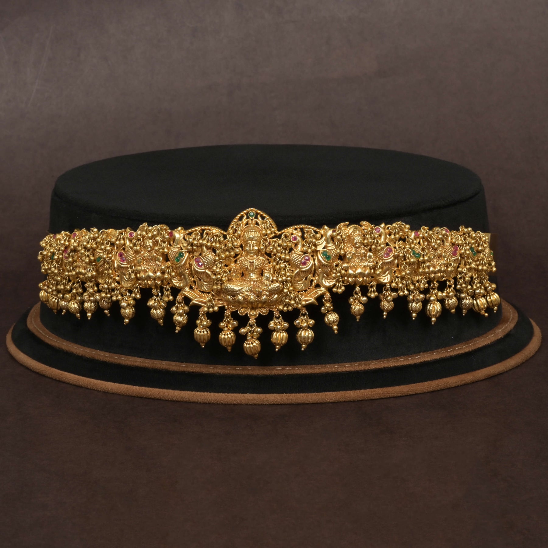This Temple Vaddanam showcases a meticulous handcrafted design inspired by Goddess Lakshmi, symbolizing prosperity and beauty. Featuring a gold finish that closely resembles pure gold, it is adorned with genuine cubic zirconia stones that add brilliance and elegance. Each piece is uniquely crafted, ensuring a one-of-a-kind accessory that complements traditional attire with an authentic temple jewelry appeal. Ideal for those seeking timeless elegance with expert craftsmanship.