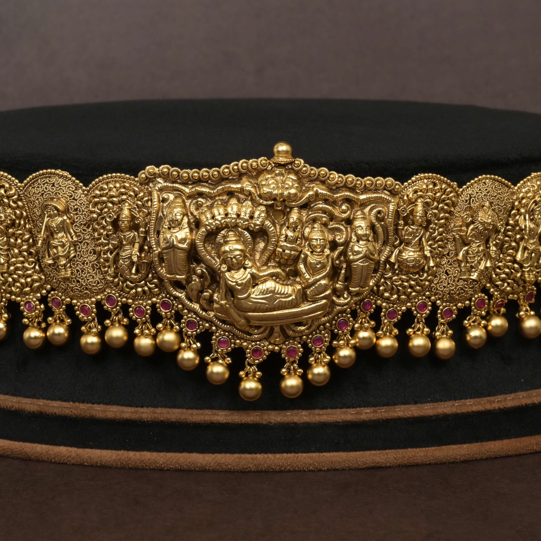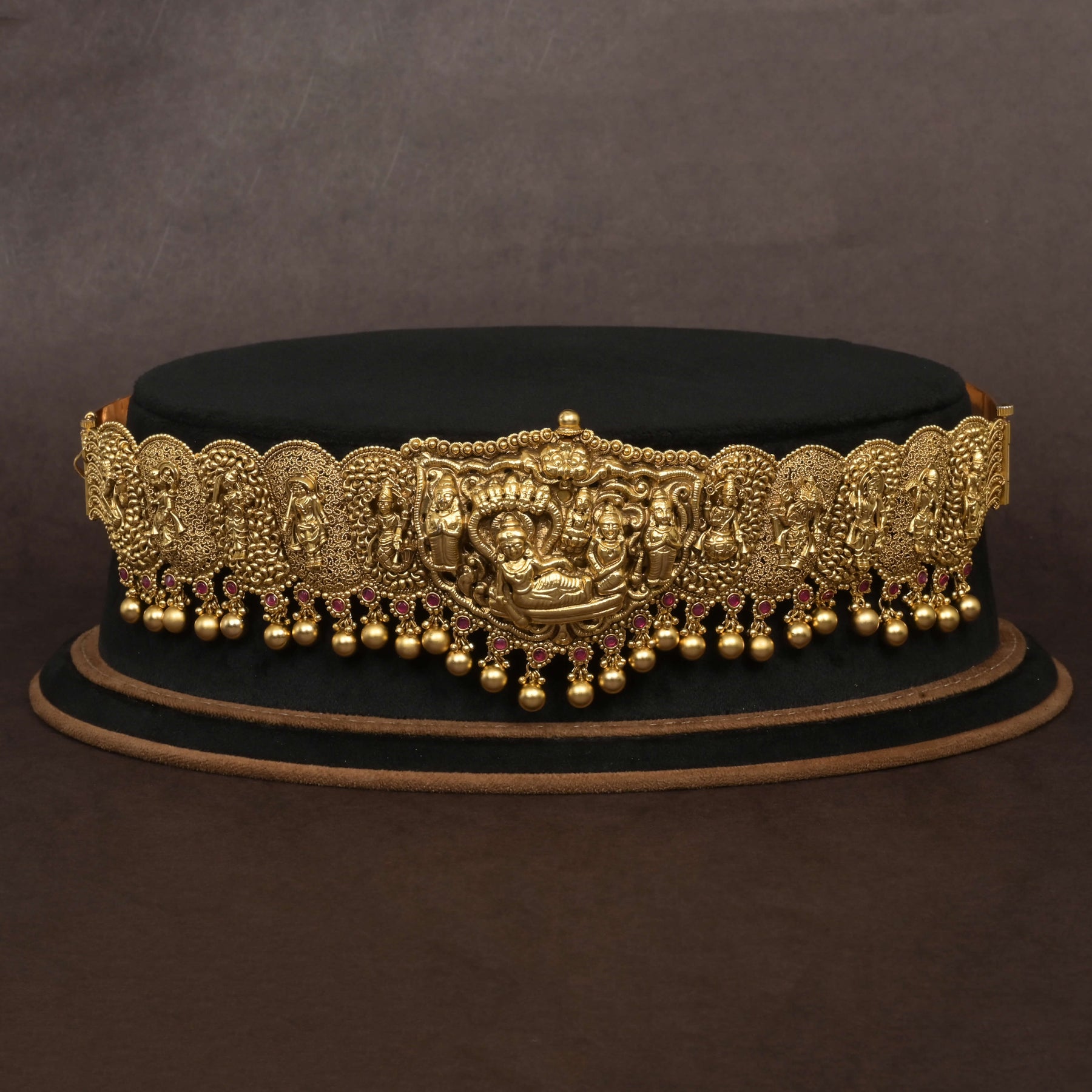 This handcrafted Temple Vaddanam features a deity-inspired design with a rich gold finish, expertly crafted to emulate the elegance of pure gold. Each piece is uniquely designed, reflecting traditional artistry and making it a one-of-a-kind accessory that enhances any ethnic ensemble with timeless charm and sophistication.
