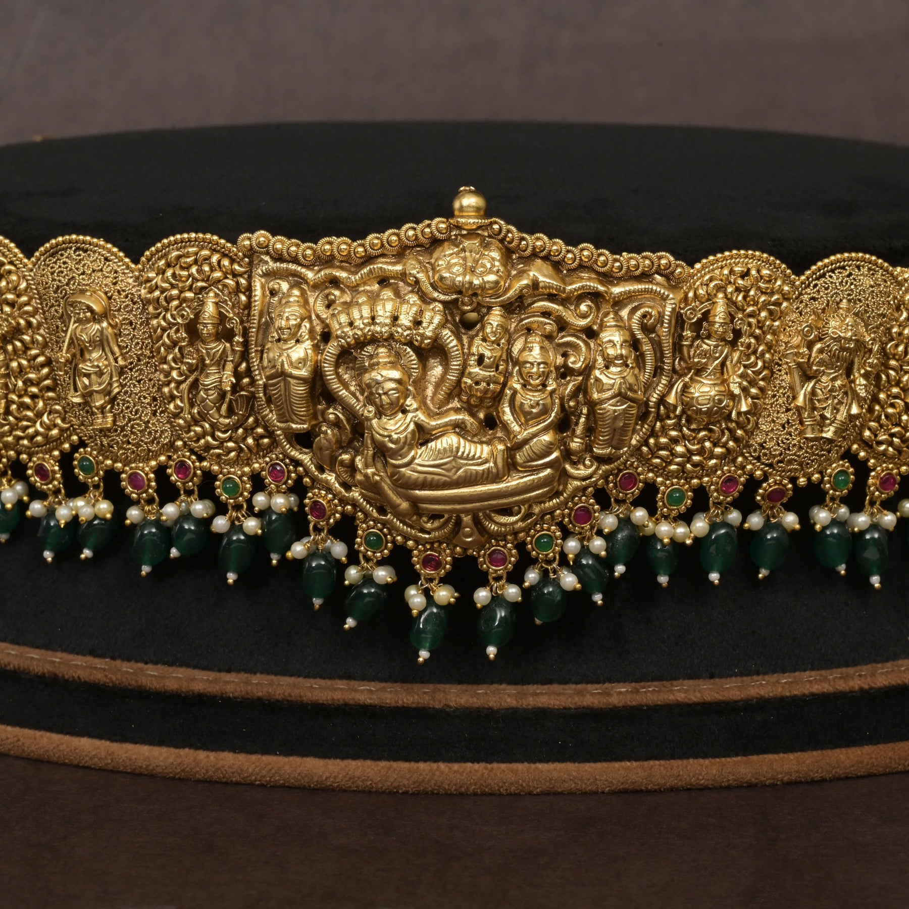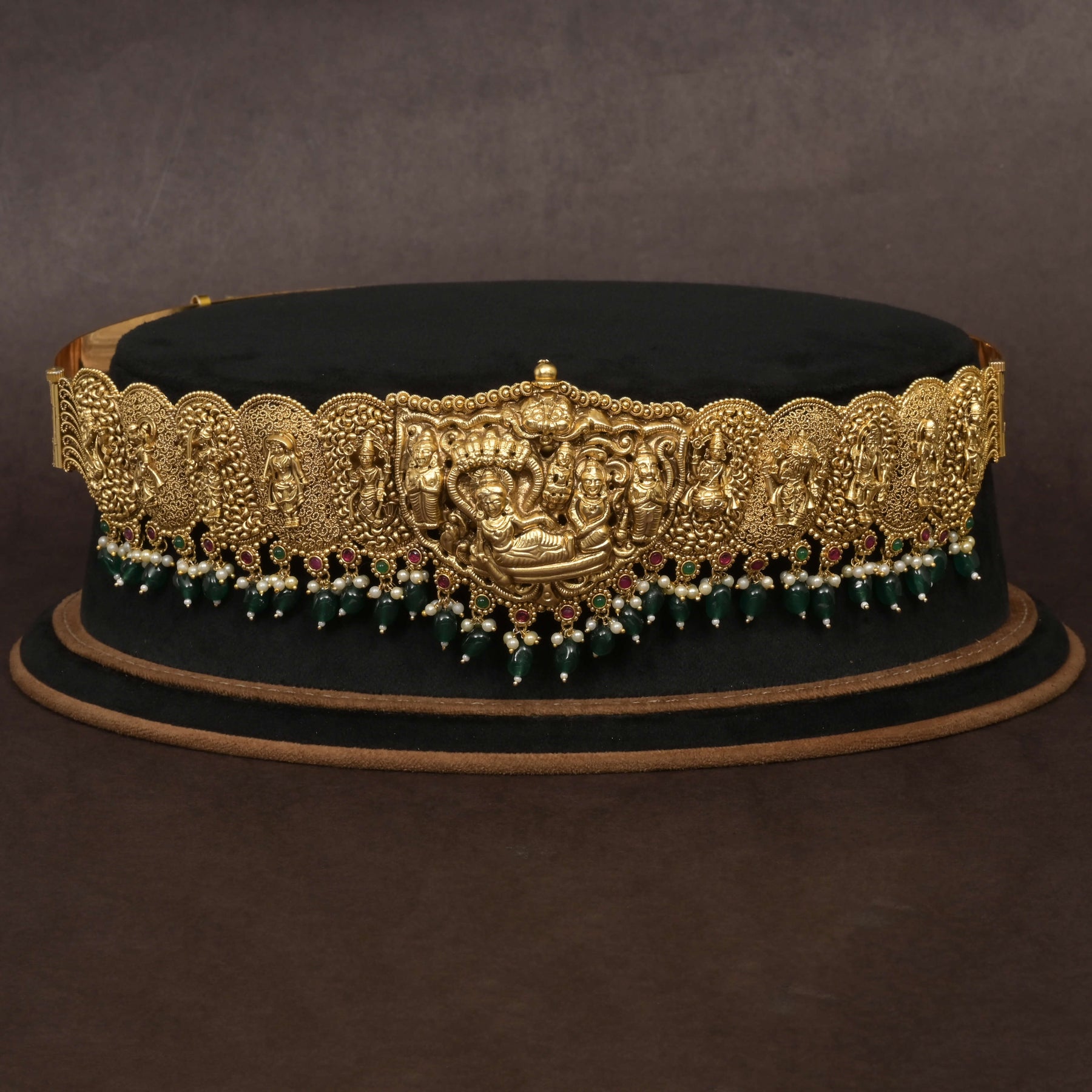 This Temple Vaddanam showcases expert craftsmanship with its intricately handcrafted deity design, symbolizing tradition and artistry. Featuring a rich gold finish that beautifully mimics genuine gold, it is adorned with elegant green pearls that dangle gracefully, adding a touch of vibrant sophistication. Each piece is a unique creation, ensuring you wear a one-of-a-kind accessory that elevates your traditional attire with timeless charm.