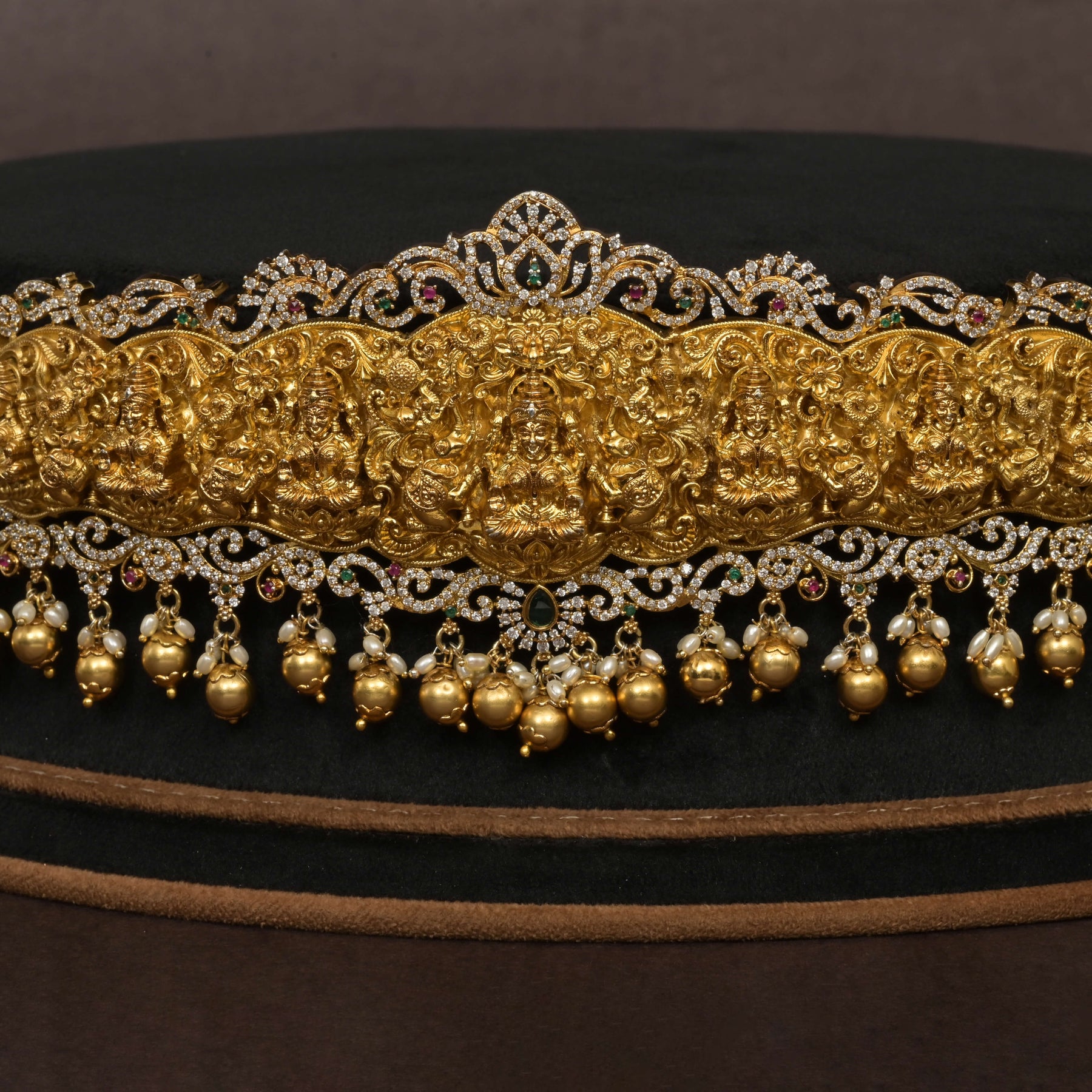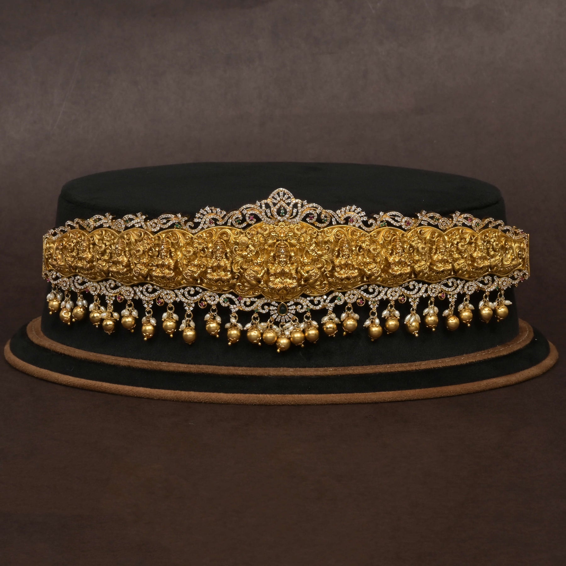 This handcrafted Temple Vaddanam features a gold-finish design that beautifully emulates real gold. Adorned with sparkling CZ stones, it showcases a detailed goddess Lakshmi motif, symbolizing prosperity and grace. Each piece is uniquely crafted, ensuring an exclusive, one-of-a-kind accessory that elevates traditional attire with expert artistry and timeless elegance.