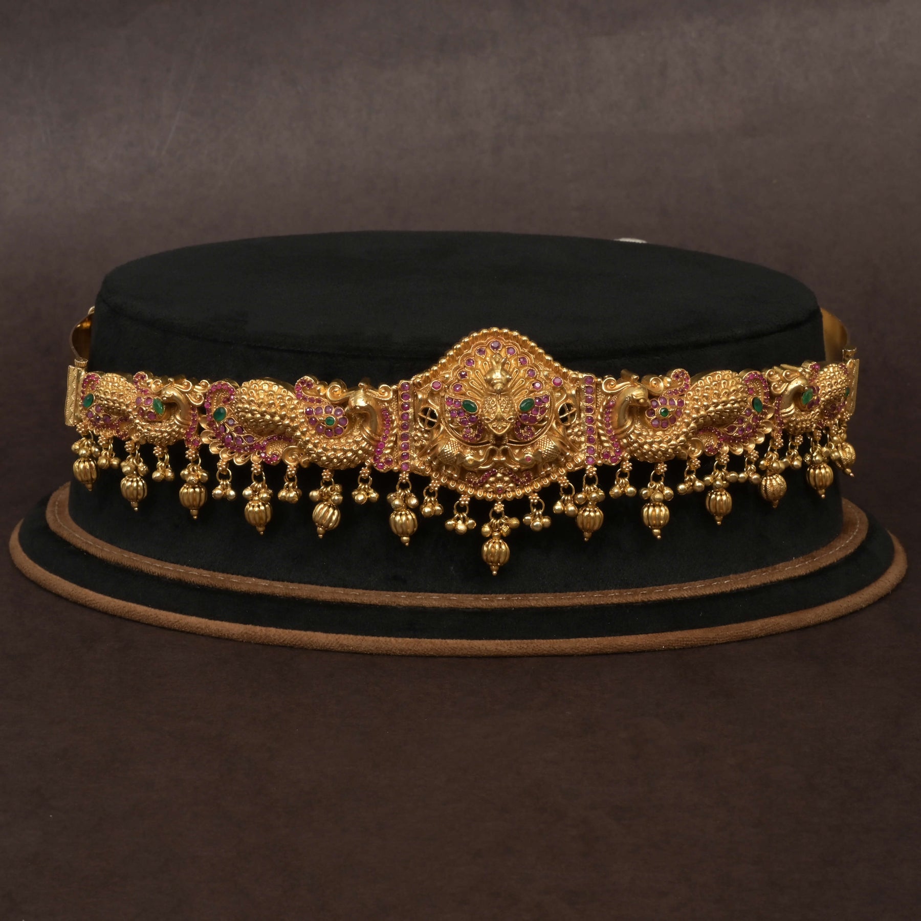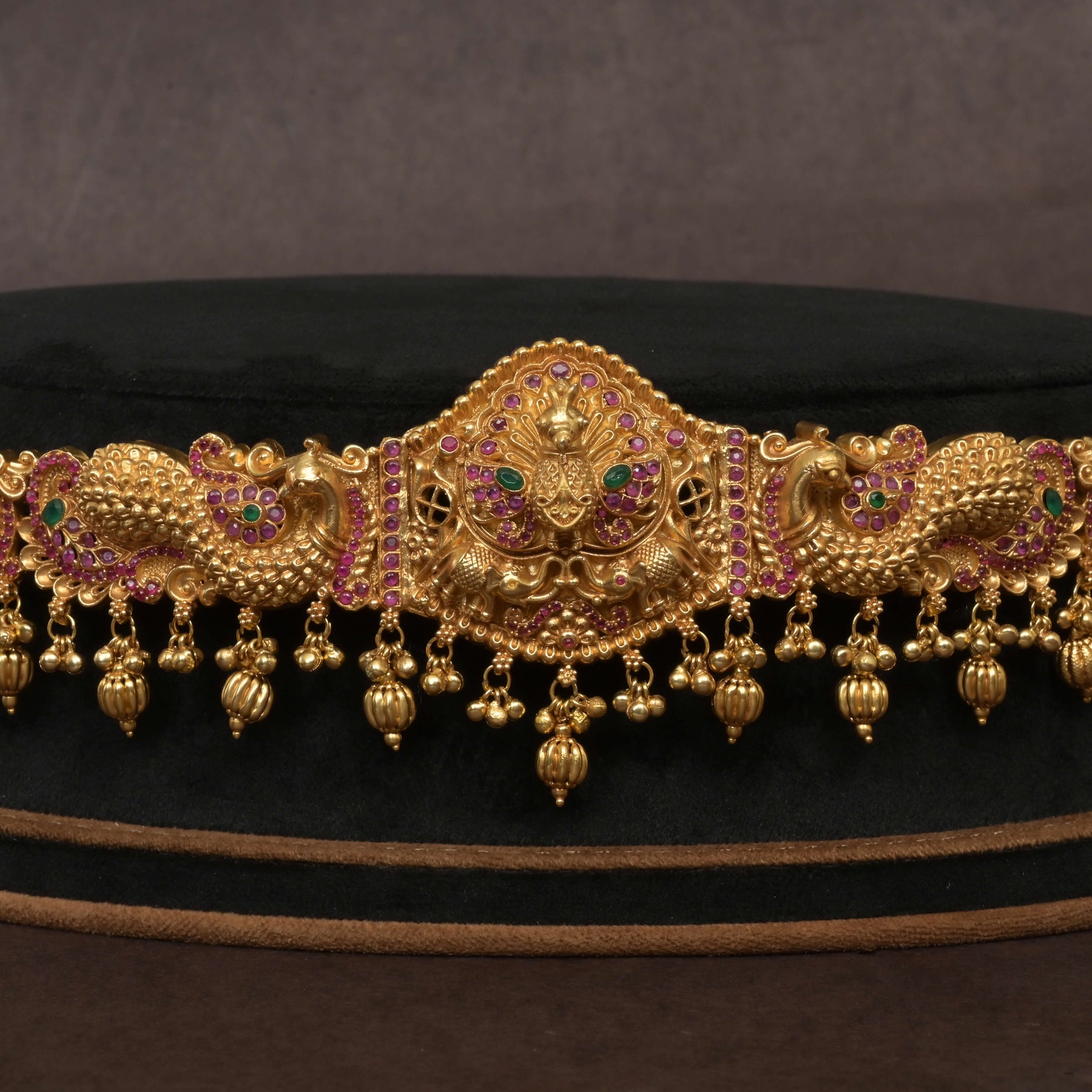 This Temple Vaddanam features a stunning gold finish that replicates the rich look of traditional gold jewelry. Handcrafted with meticulous attention to detail, its one-of-a-kind design celebrates timeless cultural artistry. Ideal for special occasions, this piece enhances your ensemble with authentic elegance and heritage-inspired charm.