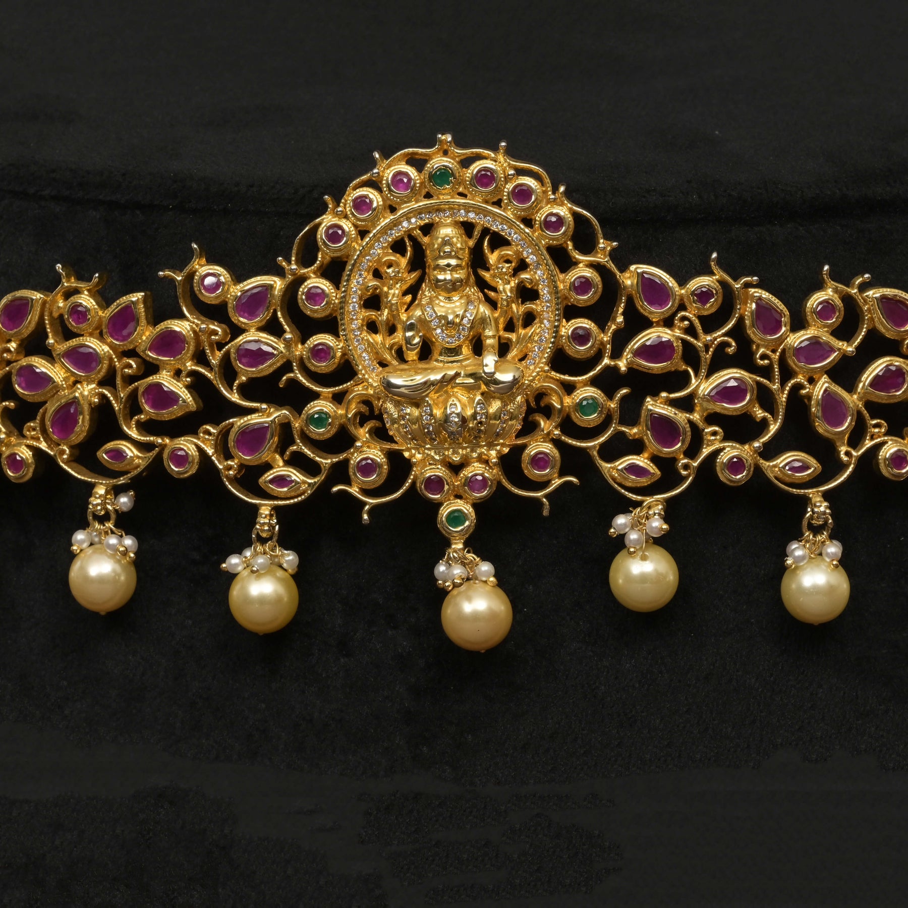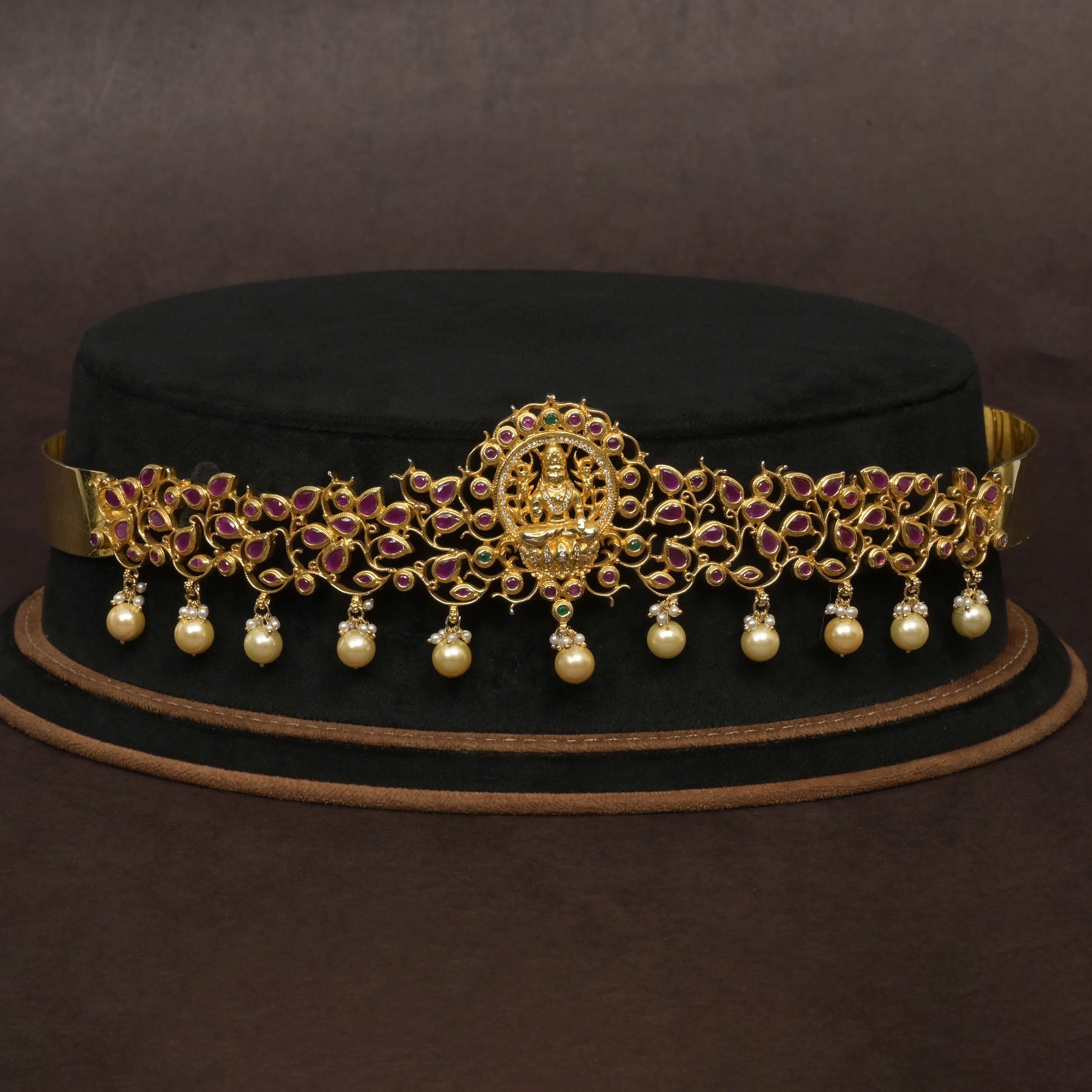 This Temple Vaddanam features a stunning gold finish that beautifully mimics authentic gold, adorned with semi-precious ruby stones for a vibrant touch. Handcrafted with meticulous care, its unique design showcases the revered Lakshmi Goddess, symbolizing prosperity and grace. Each piece is one of a kind, combining traditional artistry with elegant craftsmanship to elevate your festive and bridal ensembles with timeless charm.