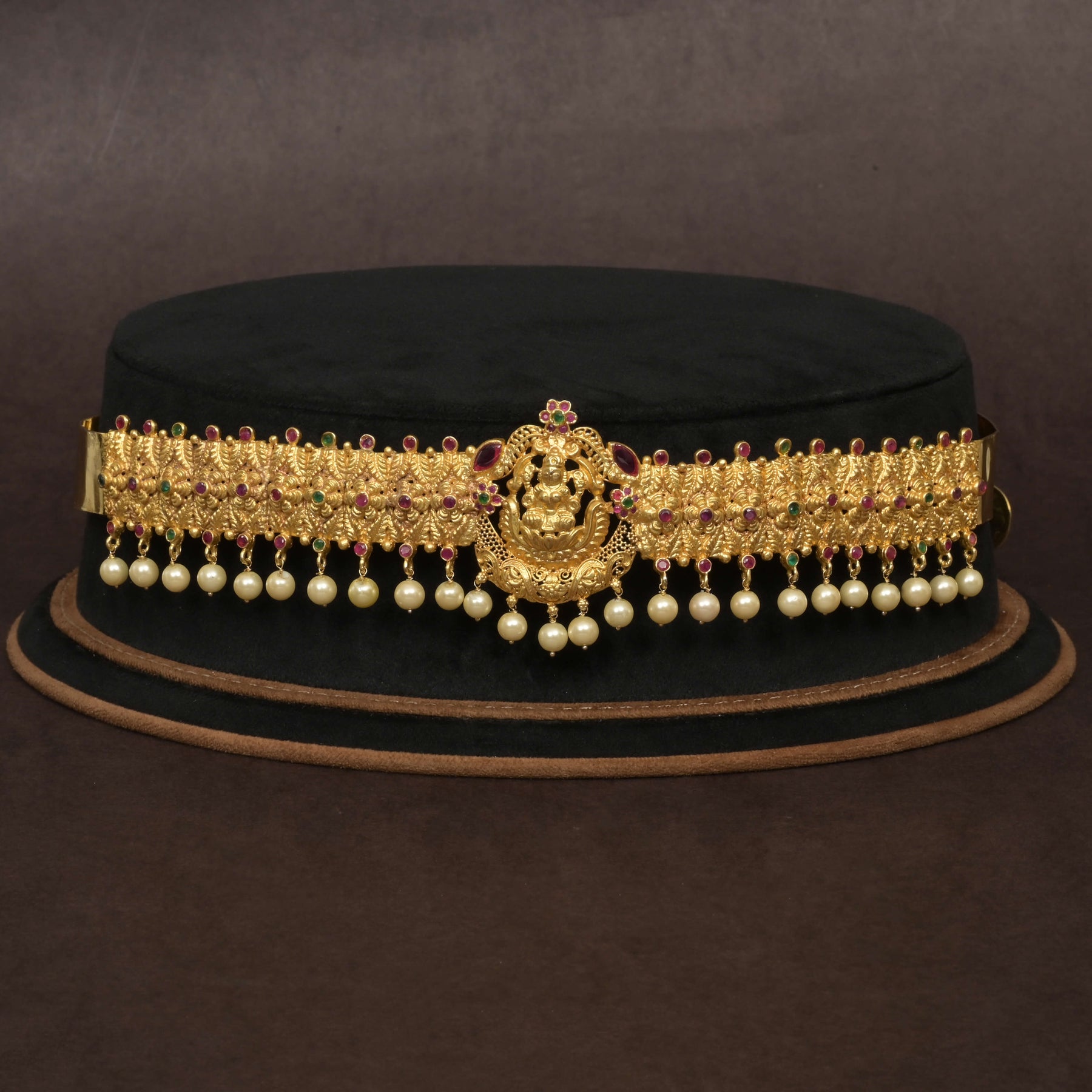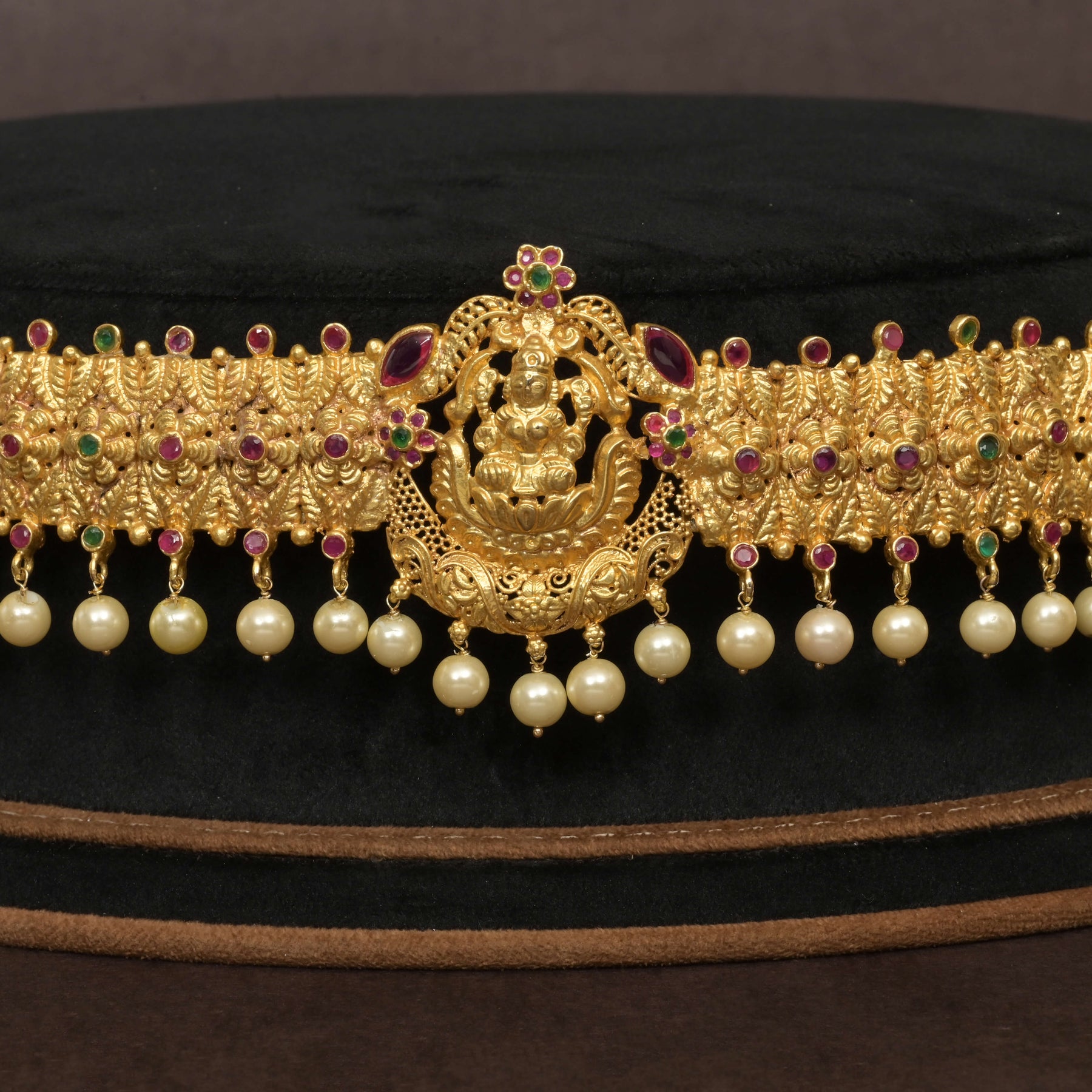 This handcrafted Temple Vaddanam showcases an exquisite gold finish that captures the traditional allure of classic jewelry. Featuring an intricate design centered around Goddess Lakshmi, the piece is elegantly adorned with delicate pearls that dangle gracefully, enhancing its regal appeal. The gold-like finish offers the luxurious look of pure gold while maintaining uniqueness through its one-of-a-kind craftsmanship, making it a timeless statement for special occasions.