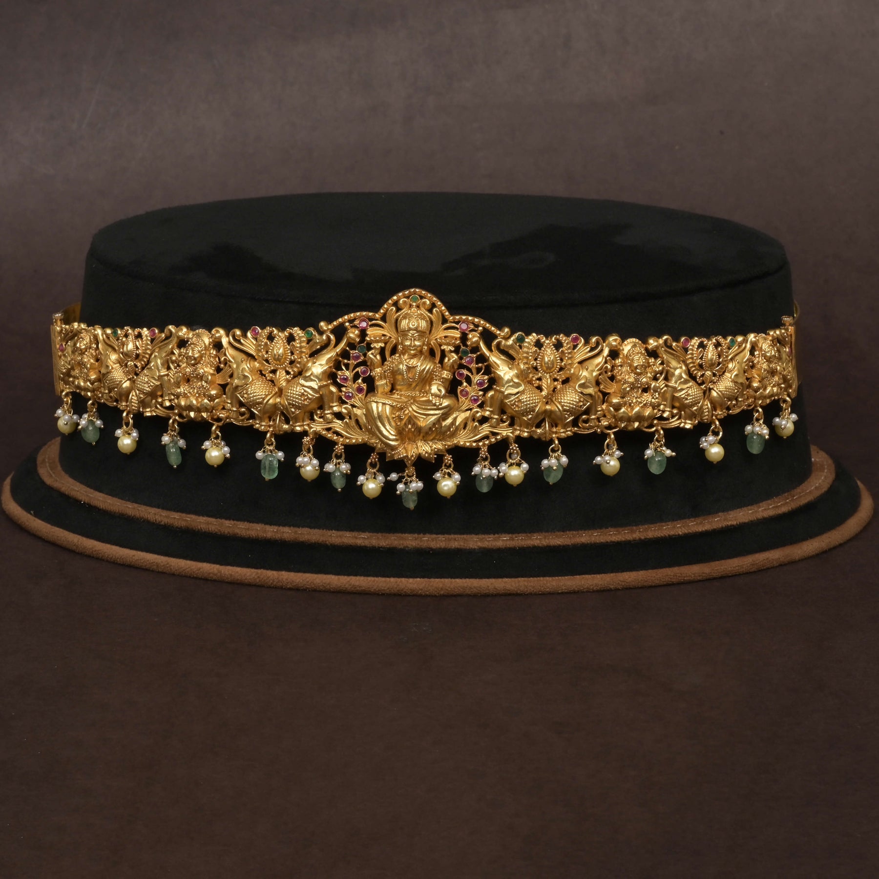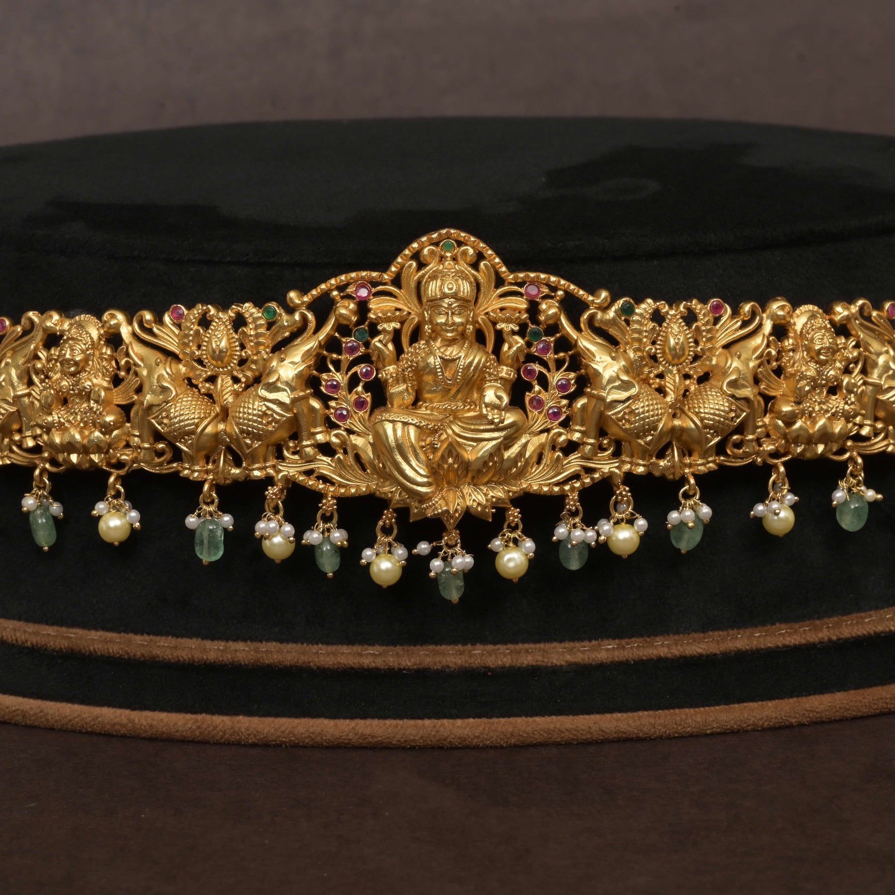 This handcrafted Temple Vaddanam features a traditional Goddess Gaja Lakshmi design with a luxurious gold finish. Its intricate detailing offers the timeless elegance of gold jewelry with a distinctive, one-of-a-kind artistry. Perfect for special occasions, this statement piece combines cultural heritage with refined craftsmanship.