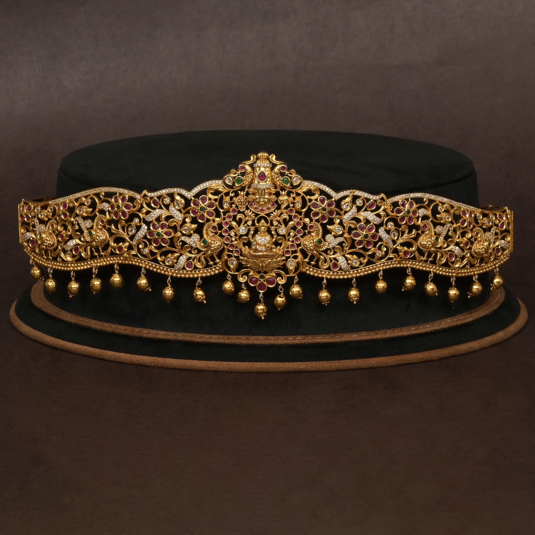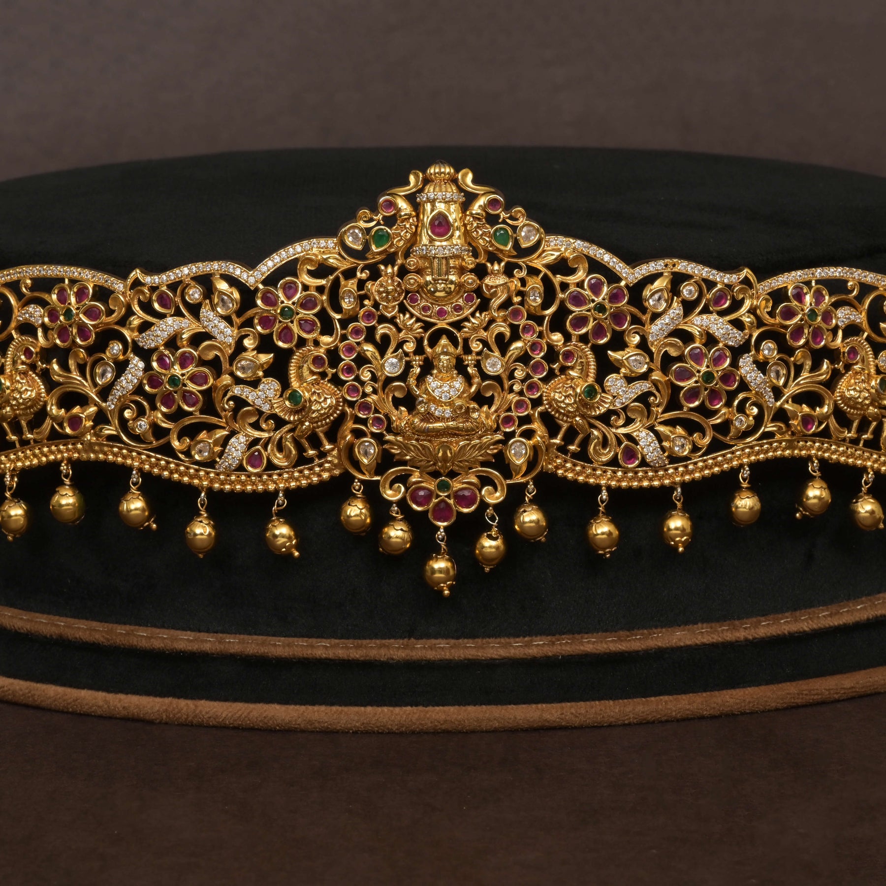 The Temple Vaddanam showcases a lustrous gold finish that captures the authentic look of pure gold. Handcrafted with precision, it features a traditional Goddess Lakshmi design embellished with sparkling real CZ stones. This one-of-a-kind piece combines timeless cultural artistry with modern craftsmanship, offering a unique statement accessory that epitomizes elegance and heritage.