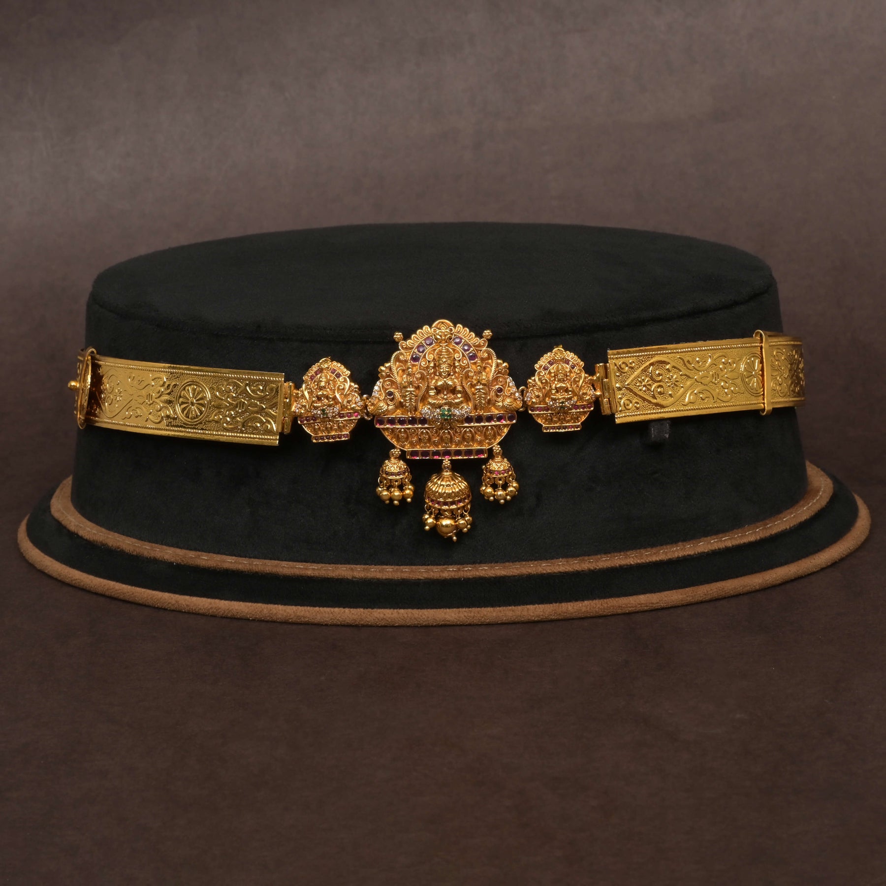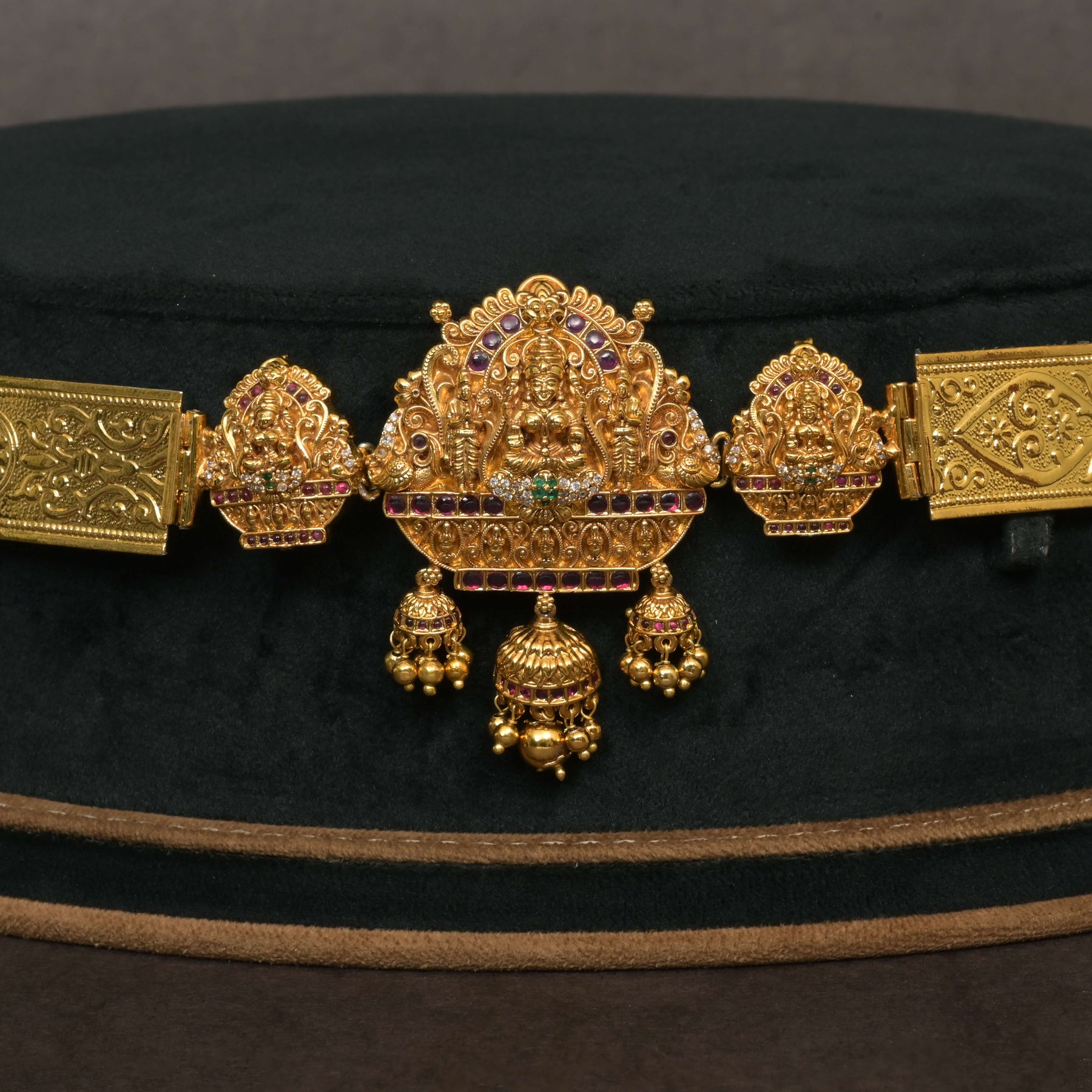 This handcrafted Temple Vaddanam features a traditional Goddess Lakshmi design, exquisitely detailed to capture divine elegance. Finished in a rich gold tone, it beautifully mimics the look of pure gold while being adorned with sparkling, high-quality CZ stones for a realistic shine. A one-of-a-kind piece, it combines timeless cultural artistry with expert craftsmanship, making it a prestigious accessory for special occasions and traditional celebrations.