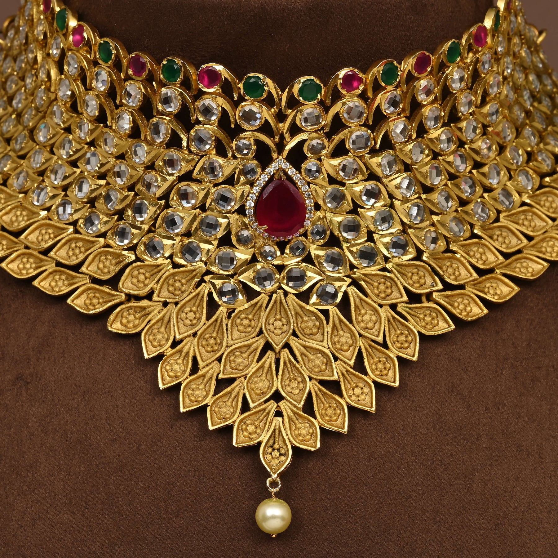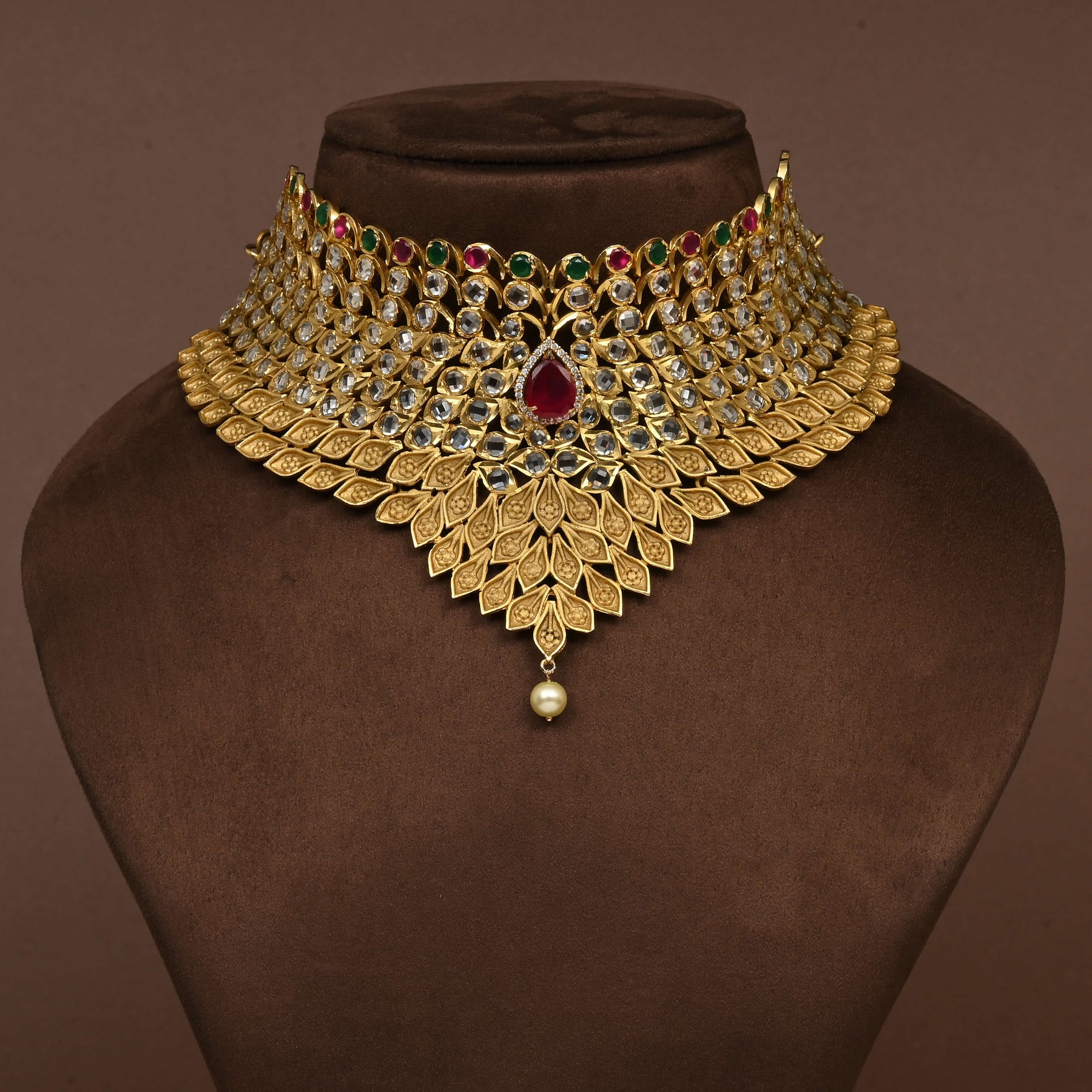 Embrace timeless elegance with this handcrafted Uncut Polki Choker Set, featuring authentic semi-precious polki stones set in a luxurious gold finish. Each piece is meticulously crafted using traditional techniques, celebrating the raw beauty of uncut gemstones. The intricate design showcases the natural brilliance of polki stones, creating a truly one-of-a-kind accessory that blends heritage craftsmanship with contemporary style. Perfect for special occasions or adding a touch of sophisticated glamour to your everyday ensemble.