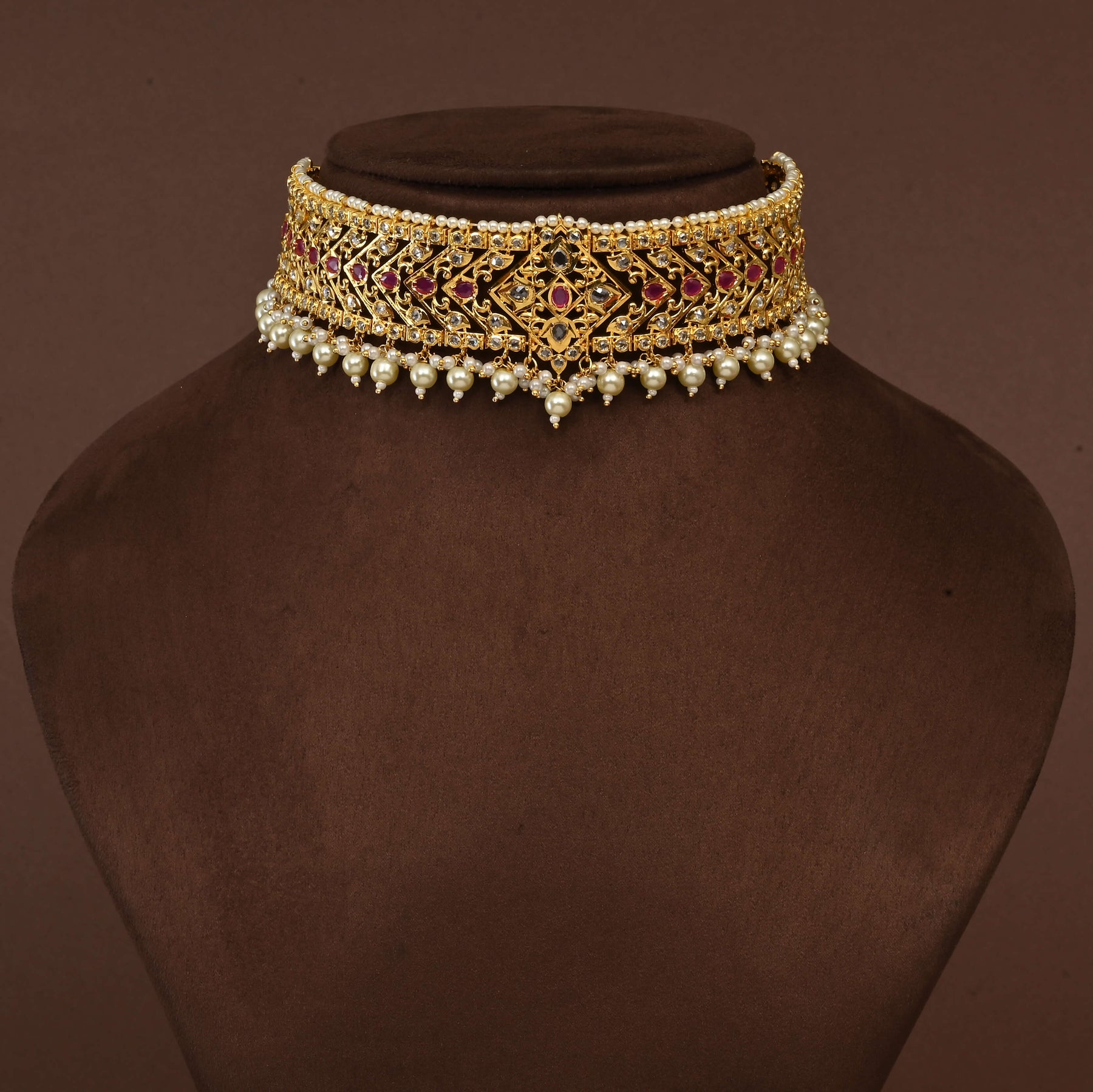This exquisite uncut polki choker set showcases the timeless elegance of traditional Indian craftsmanship. Each piece features authentic semi-precious polki stones set in a lustrous gold finish, creating a striking contrast that highlights the raw beauty of the gemstones. Handcrafted with meticulous attention to detail, this one-of-a-kind choker combines heritage artistry with contemporary appeal. The irregular facets of uncut polki stones catch light beautifully, making it an ideal choice for special occasions or as a statement piece that celebrates authentic jewelry artistry.