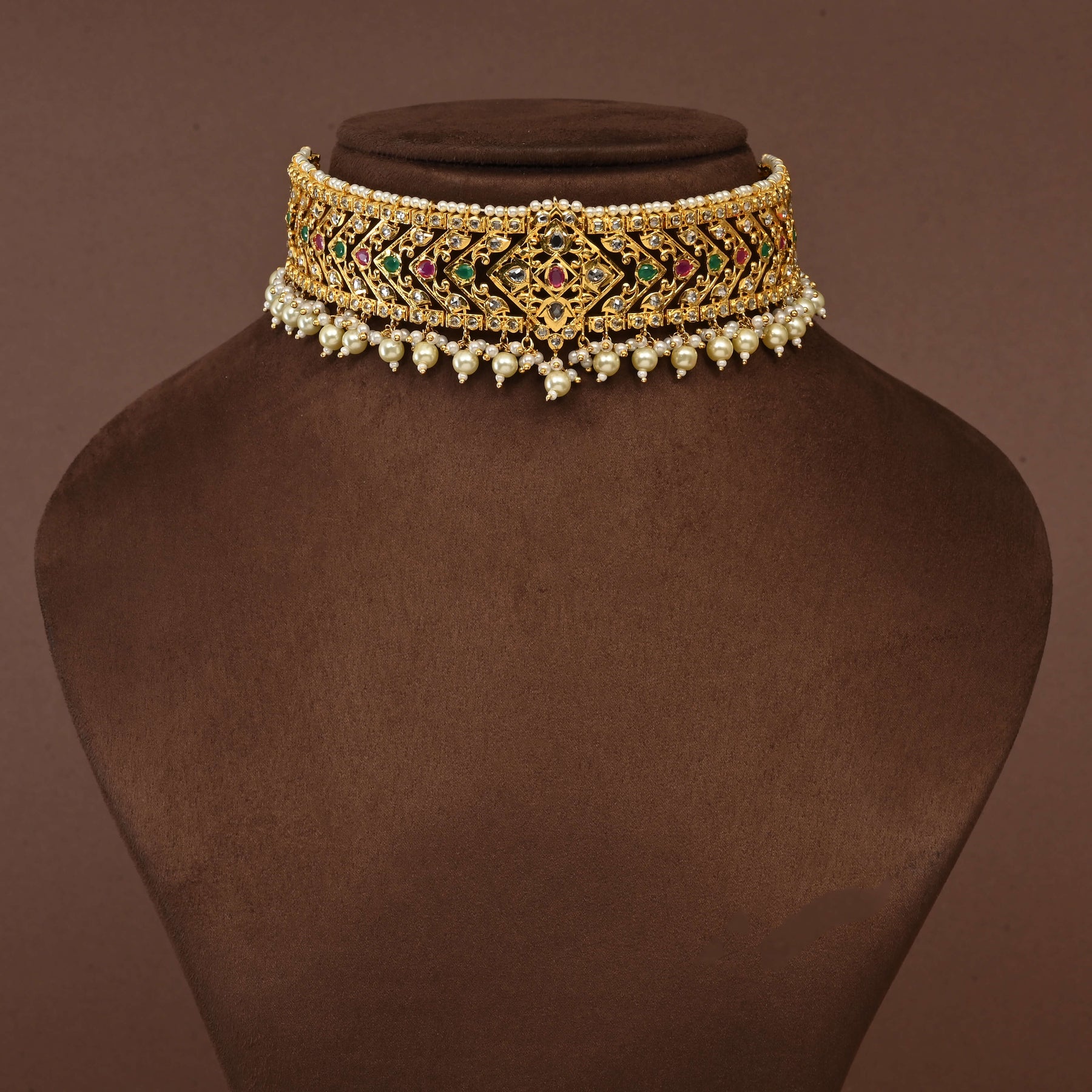 Elevate your traditional ensemble with this exquisite uncut polki choker set, meticulously handcrafted to showcase the raw beauty of semi-precious polki stones. Each piece features an authentic gold finish that captures the warmth and lustre of fine jewellery, while the irregular cuts of the stones create a distinctive, one-of-a-kind character. The choker's traditional design makes it an ideal choice for weddings, festivals, and special occasions where timeless elegance is paramount. Crafted with expert attention to detail, this artisanal set celebrates the heritage of Indian jewellery-making, offering you a unique accessory that stands apart from mass-produced alternatives.