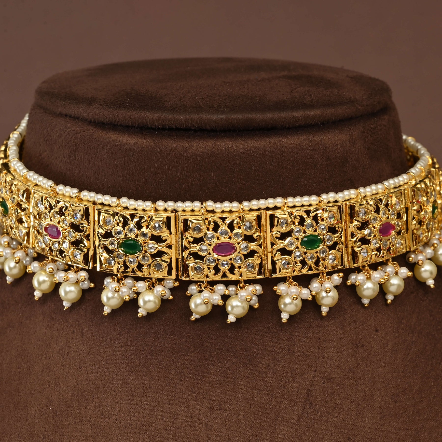 Elevate your traditional ensemble with this exquisite uncut polki choker set, meticulously handcrafted to showcase the raw beauty of semi-precious polki stones. Each piece features an authentic gold finish that captures the warmth and elegance of fine jewelry, while the irregular cuts of the stones create a distinctive, one-of-a-kind character. The choker's traditional design celebrates artisanal craftsmanship, making it an ideal choice for weddings, festivals, and special occasions where timeless sophistication matters.
