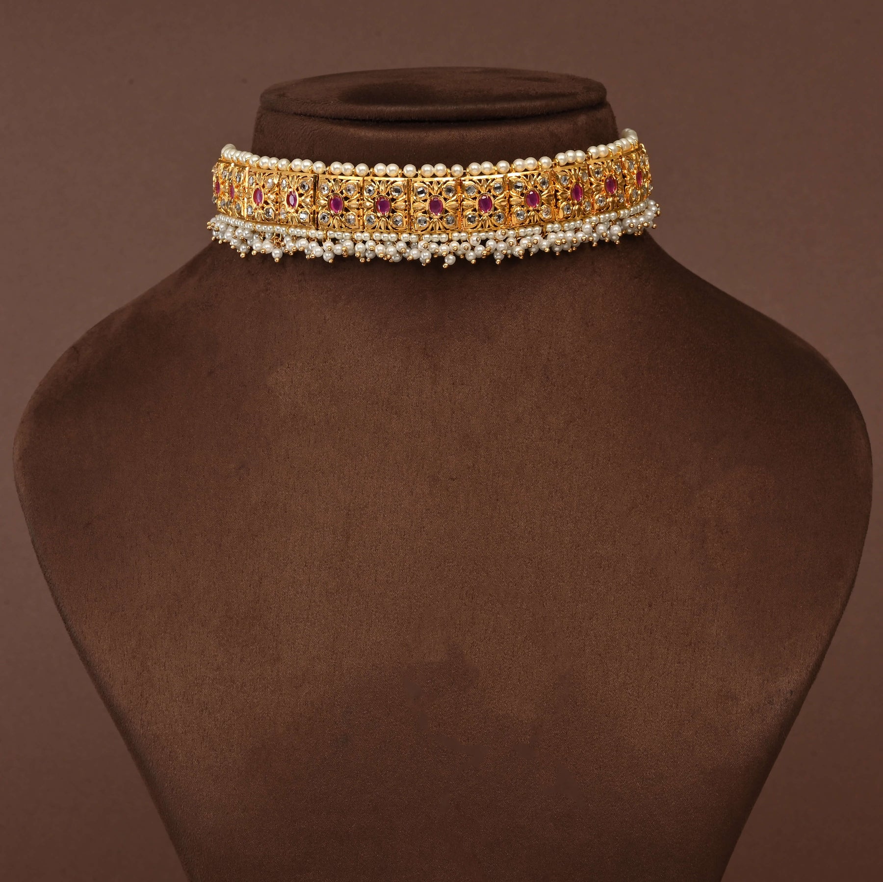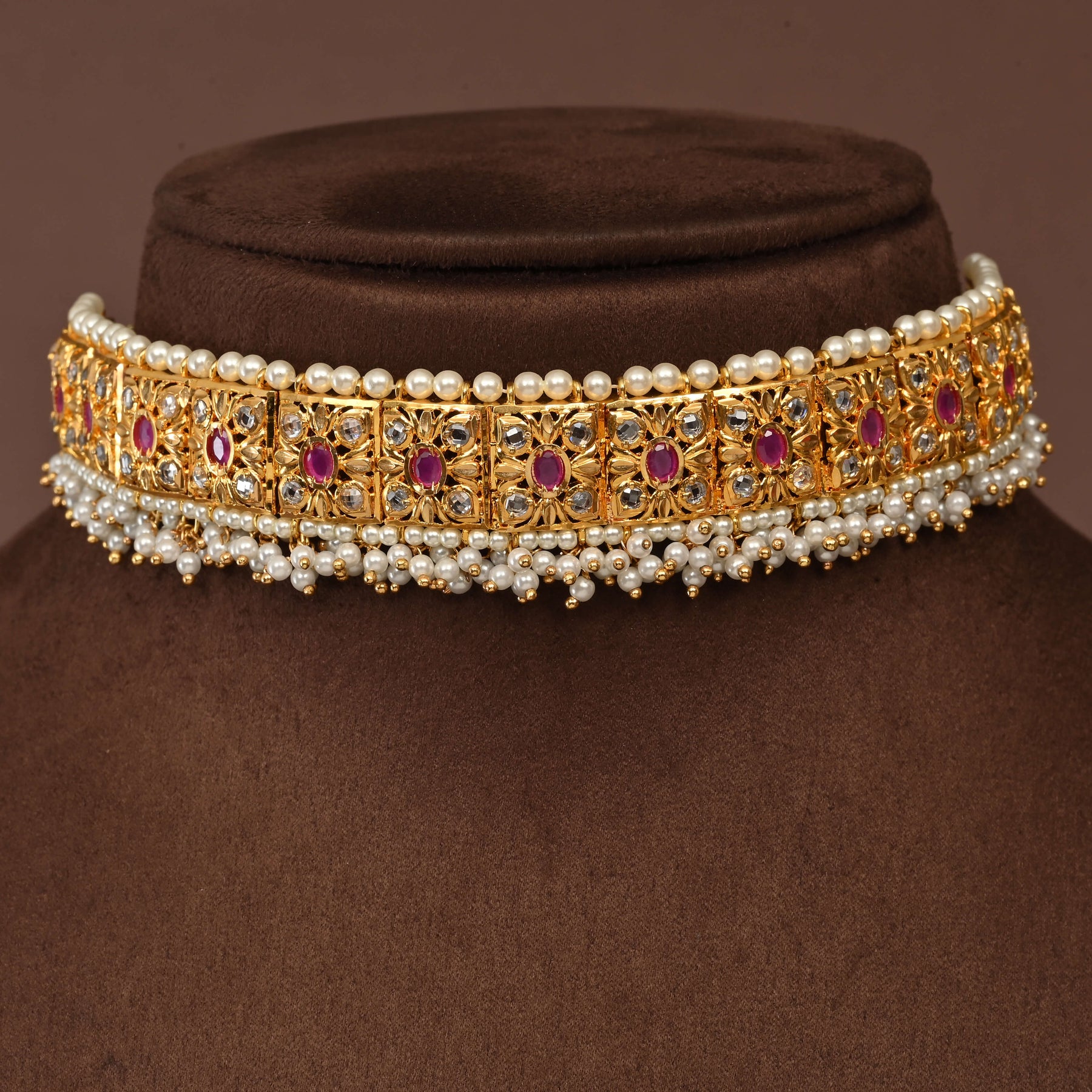 Embrace timeless elegance with this handcrafted Uncut Polki Choker Set, featuring authentic semi-precious polki stones set in a luxurious gold finish. Each piece is meticulously crafted using traditional techniques, celebrating the raw beauty of uncut gemstones. The intricate design showcases the artisan's expertise, making this a truly one-of-a-kind treasure. Perfect for special occasions or adding sophistication to your everyday collection, this choker effortlessly blends heritage craftsmanship with contemporary style.