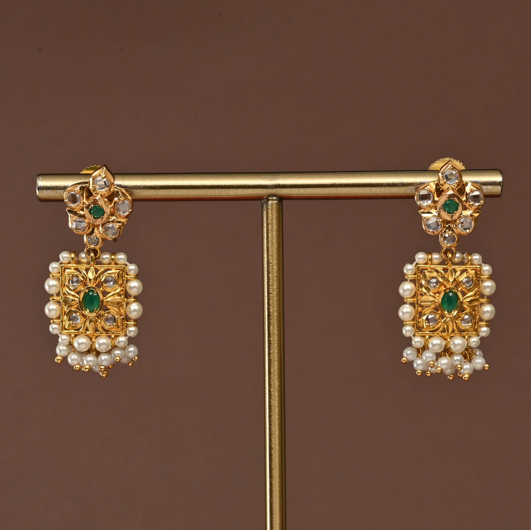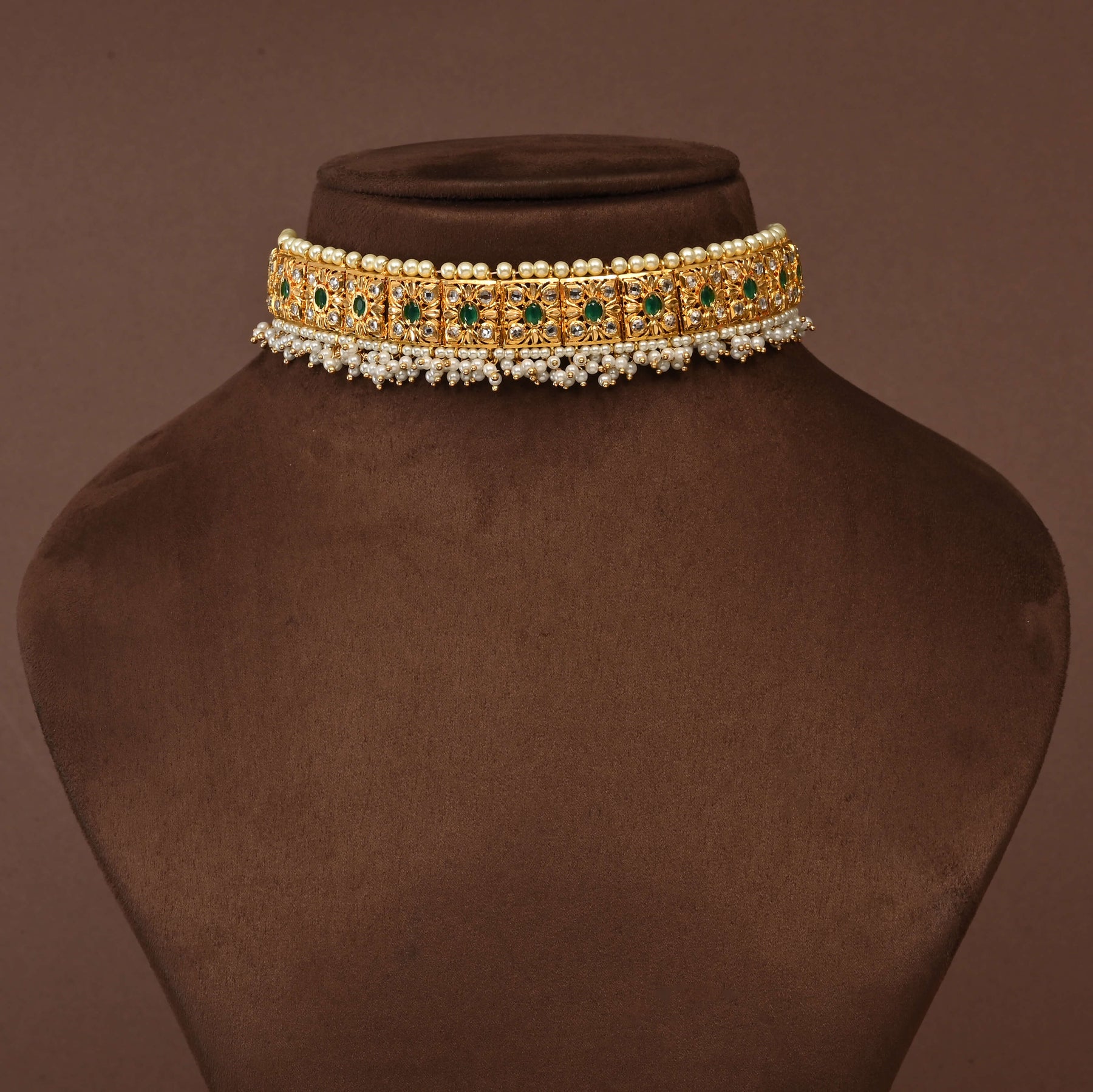 Embrace timeless elegance with this handcrafted Uncut Polki Choker Set, featuring authentic semi-precious polki stones set in a luxurious gold finish. Each piece is meticulously crafted using traditional techniques, celebrating the raw beauty of uncut gemstones. The intricate design showcases the artisan's expertise, making this a truly one-of-a-kind treasure. Perfect for special occasions or adding sophistication to your everyday collection, this choker exemplifies the finest in traditional Indian jewelry craftsmanship.