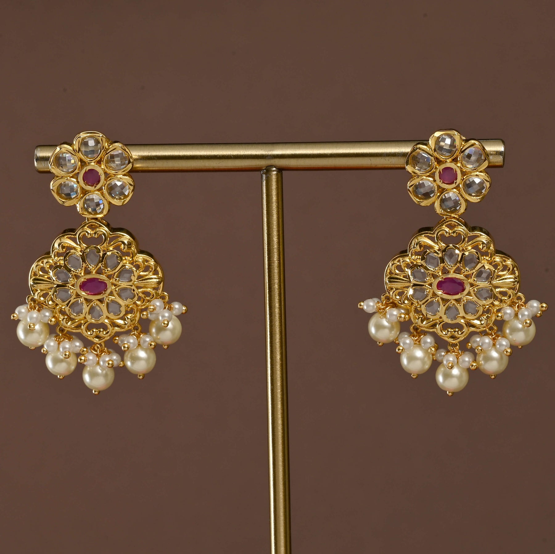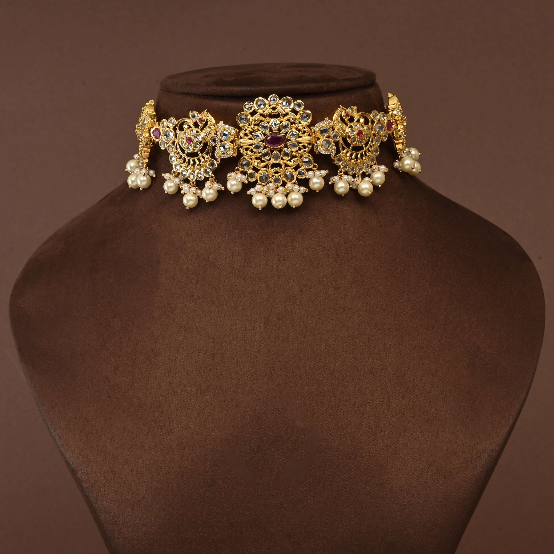 Elevate your traditional ensemble with this exquisite uncut polki choker set, meticulously handcrafted to showcase the raw beauty of semi-precious polki stones. Each piece features an authentic gold finish that captures the warmth and elegance of fine jewelry, while the irregular cuts of the stones create a distinctive, one-of-a-kind character. The artisanal craftsmanship ensures no two sets are identical, making this a truly unique addition to your collection. Perfect for weddings, festivals, and special occasions, this choker combines timeless design with contemporary appeal.