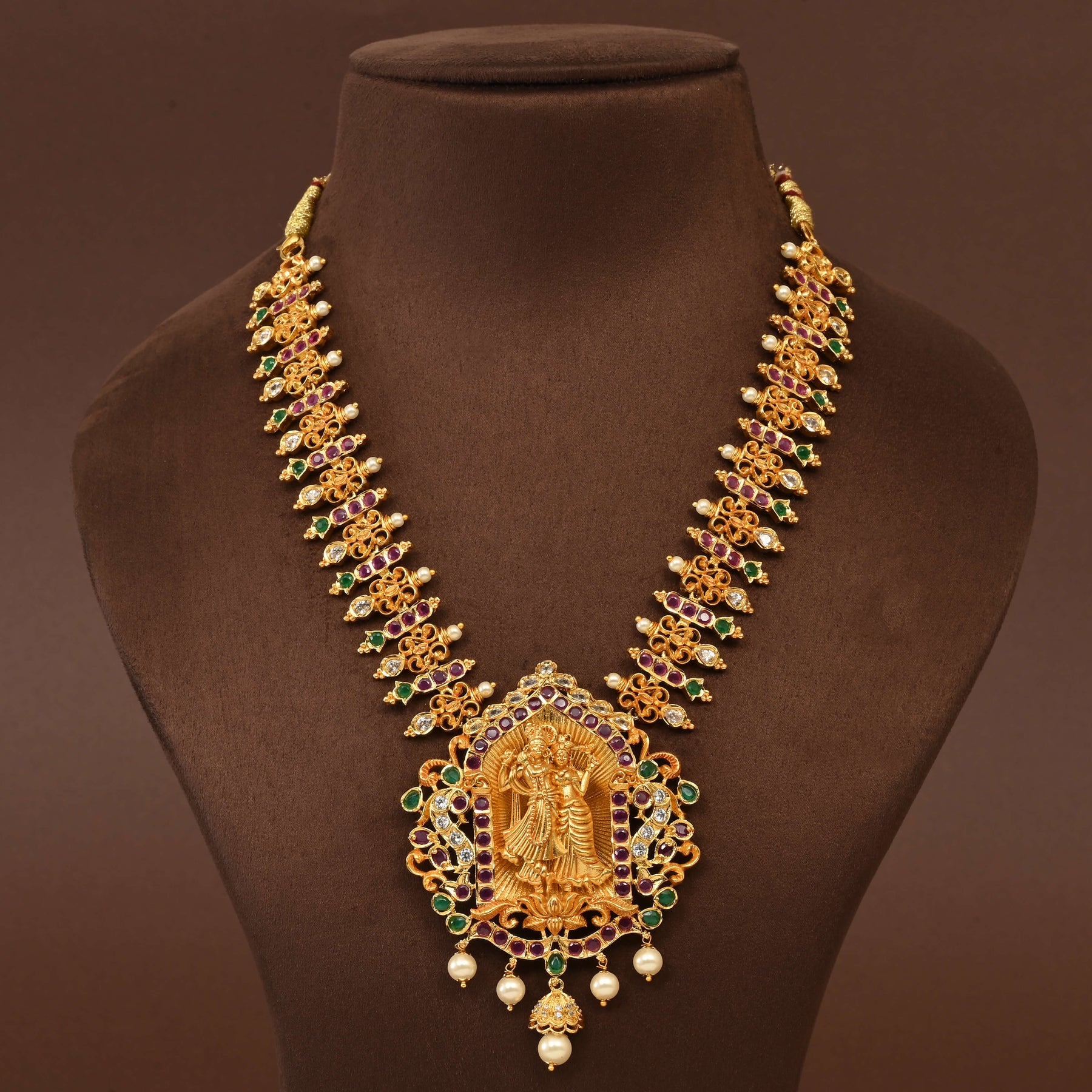 Elevate your collection with this exquisite handcrafted uncut polki necklace set, featuring an enchanting Radha Krishna design. Each piece showcases authentic semi-precious polki stones set in a lustrous gold-toned finish, capturing the timeless elegance of traditional Indian jewelry. Meticulously crafted by skilled artisans, this one-of-a-kind set celebrates the divine narrative through intricate detailing and superior craftsmanship. Perfect for festive occasions, weddings, or as a treasured heirloom, this necklace set combines spiritual significance with refined aesthetic appeal.