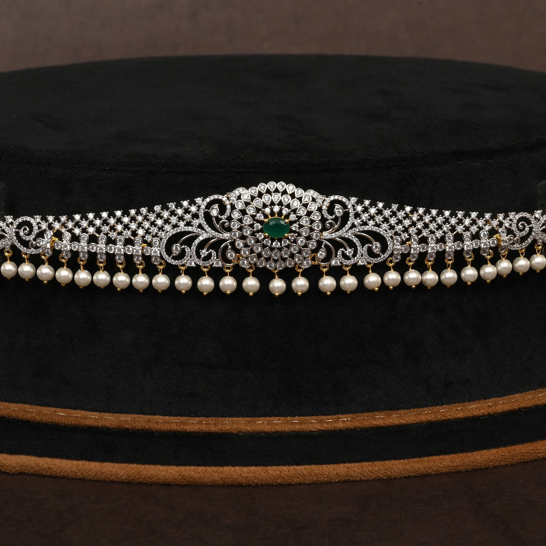 This Chain Vaddanam features a stunning diamond finish that beautifully mimics the brilliance of real diamonds. Adorned with semi-precious emerald stones, it offers a unique blend of elegance and color. Handcrafted with precision, each piece showcases a one-of-a-kind design, making it an exclusive addition to your jewelry collection. Ideal for those seeking a refined yet distinctive accessory.