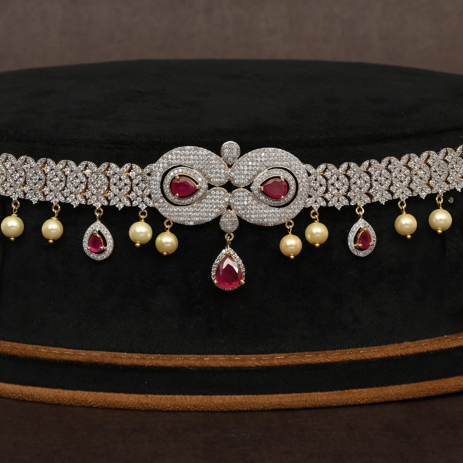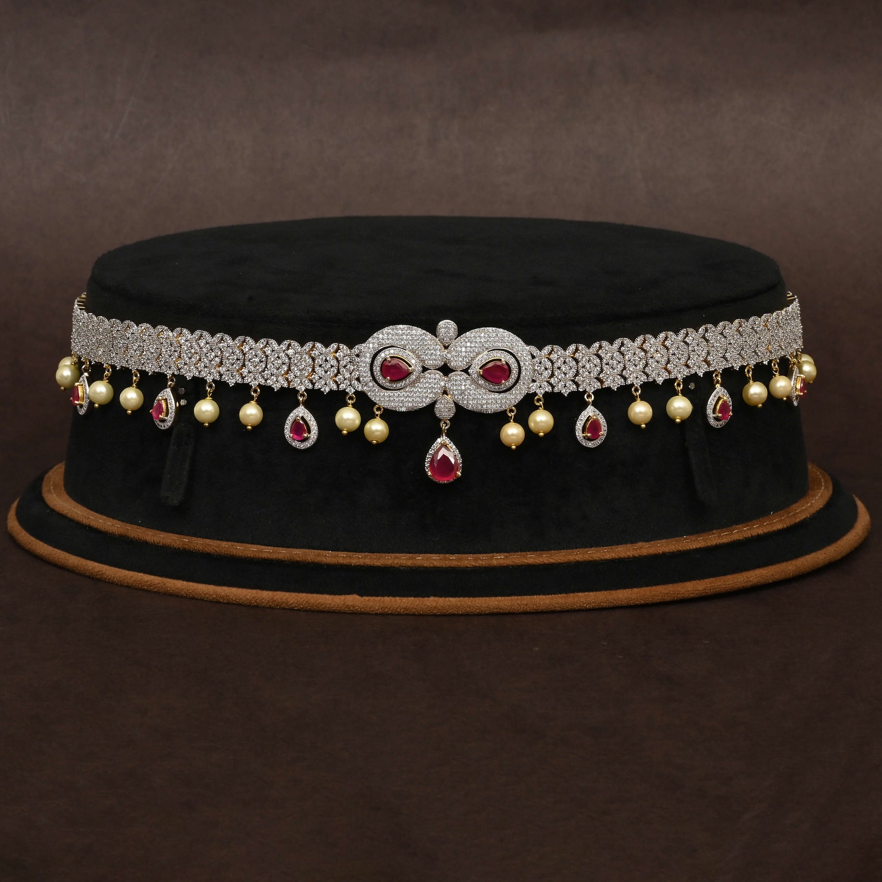 This Chain Vaddanam showcases expert craftsmanship with a stunning diamond-finish that mimics genuine diamonds, complemented by semi-precious ruby stones for a vibrant touch. Each piece is meticulously handcrafted, ensuring a unique design that elevates traditional elegance with a modern appeal. Perfect for special occasions, this one-of-a-kind accessory combines refined beauty with lasting quality.