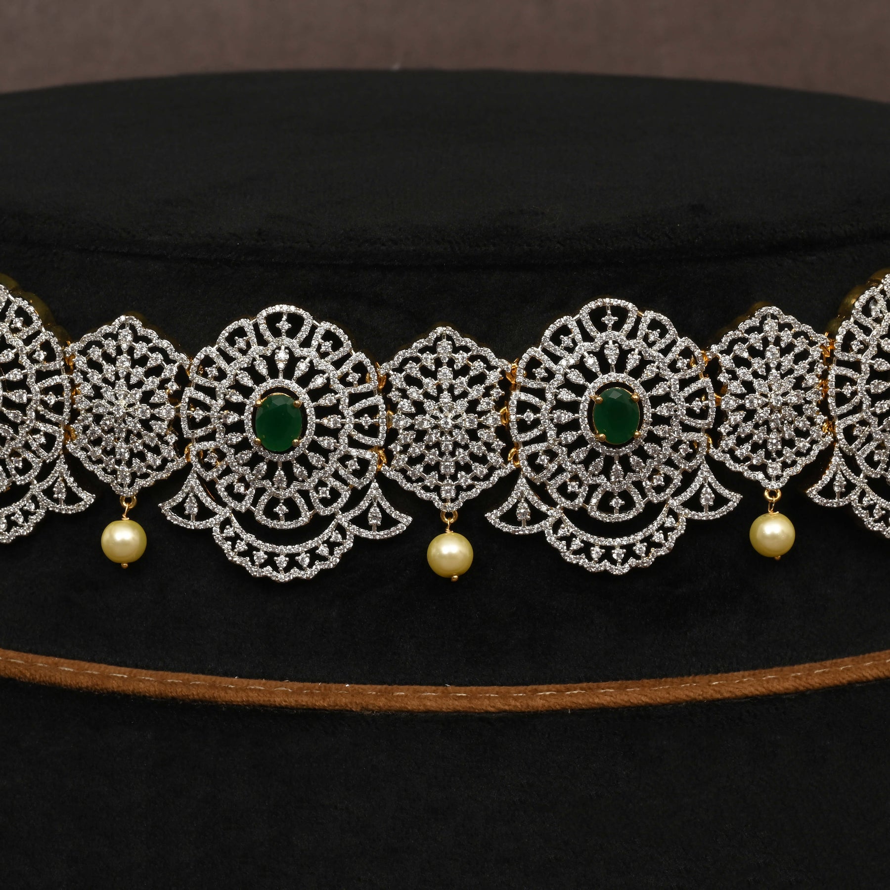 Elevate your traditional attire with this exquisite Chain Vaddanam featuring a diamond finish that mimics the brilliance of real diamonds. Handcrafted with precision, it incorporates semi-precious emerald stones that add a subtle yet striking contrast. This one-of-a-kind design offers unique elegance, perfect for those who appreciate expert craftsmanship and timeless style.