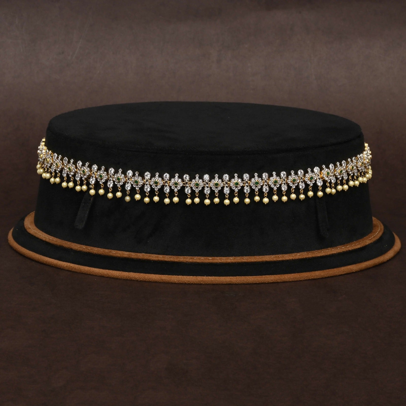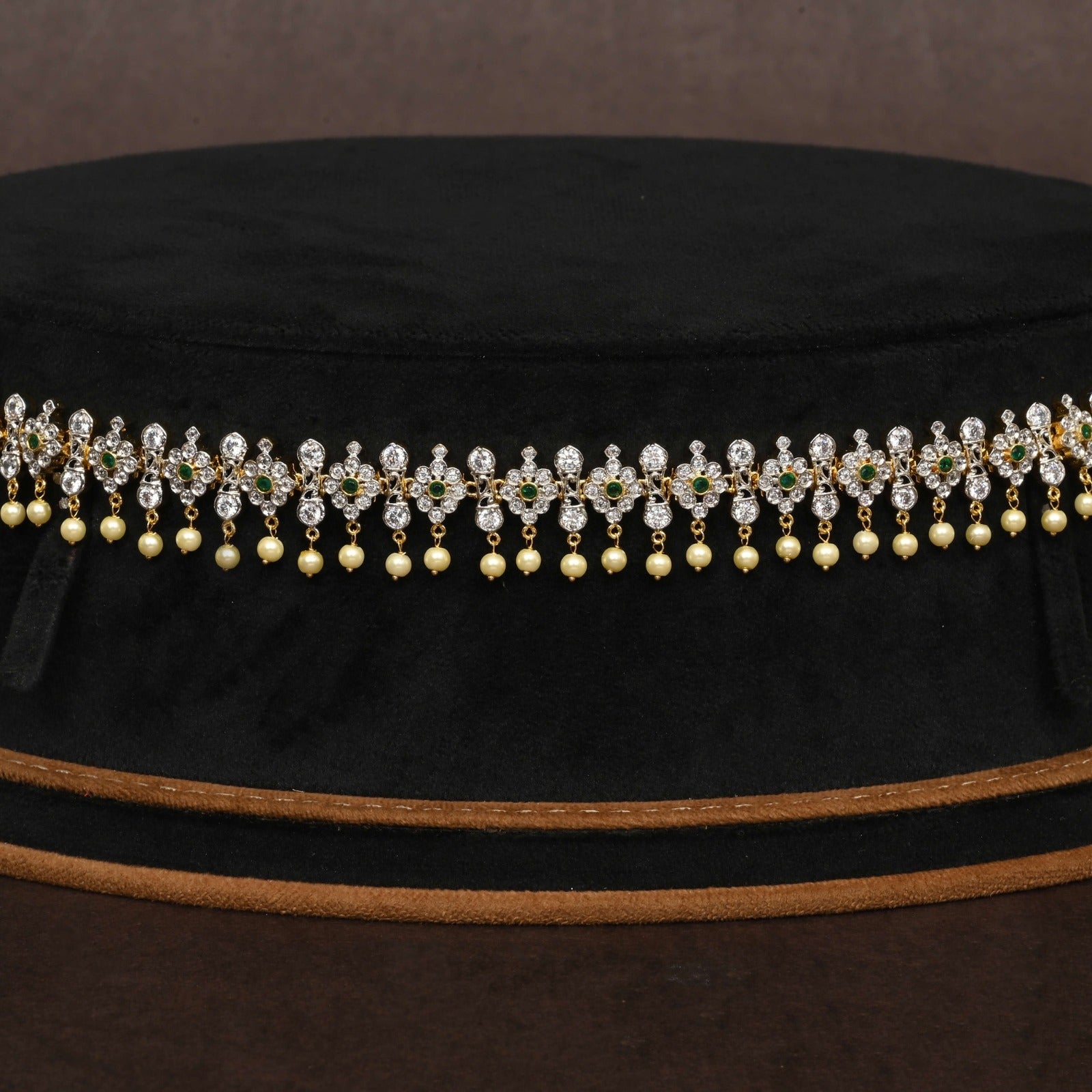 This Chain Vaddanam features a diamond-finish surface that captures the brilliance of real diamonds, complemented by delicately dangling pearls for an elegant touch. Handcrafted with precision, it combines simple elegance with intricate detailing, making it a refined accessory for traditional occasions.
