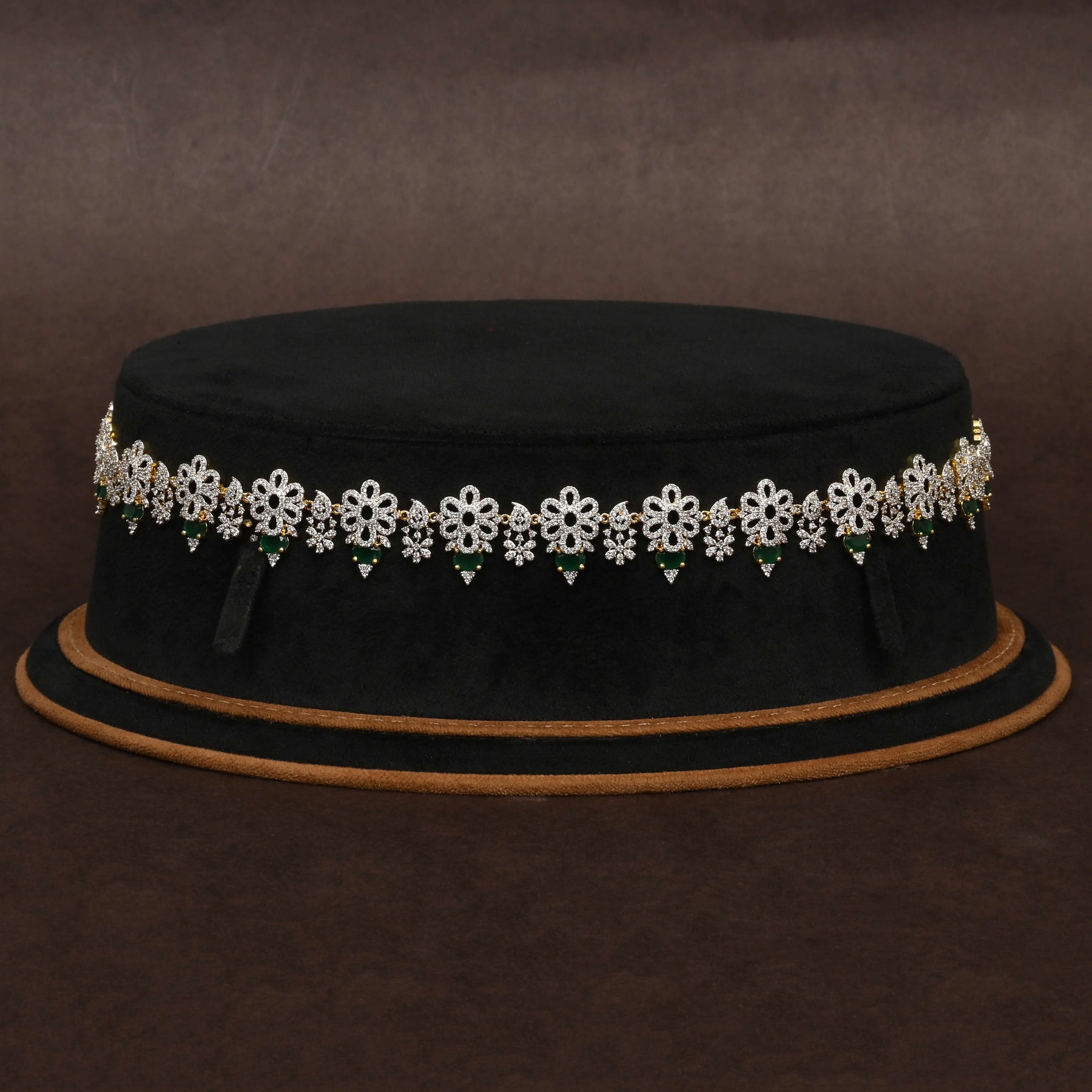 Elevate your traditional ensemble with this Chain Vaddanam, featuring a stunning diamond finish that mimics the brilliance of real diamonds. Handcrafted with meticulous attention to detail, this piece showcases a unique, one-of-a-kind design that ensures exclusivity. Combining artistry and elegance, it offers a refined look that complements any festive or ceremonial occasion.
