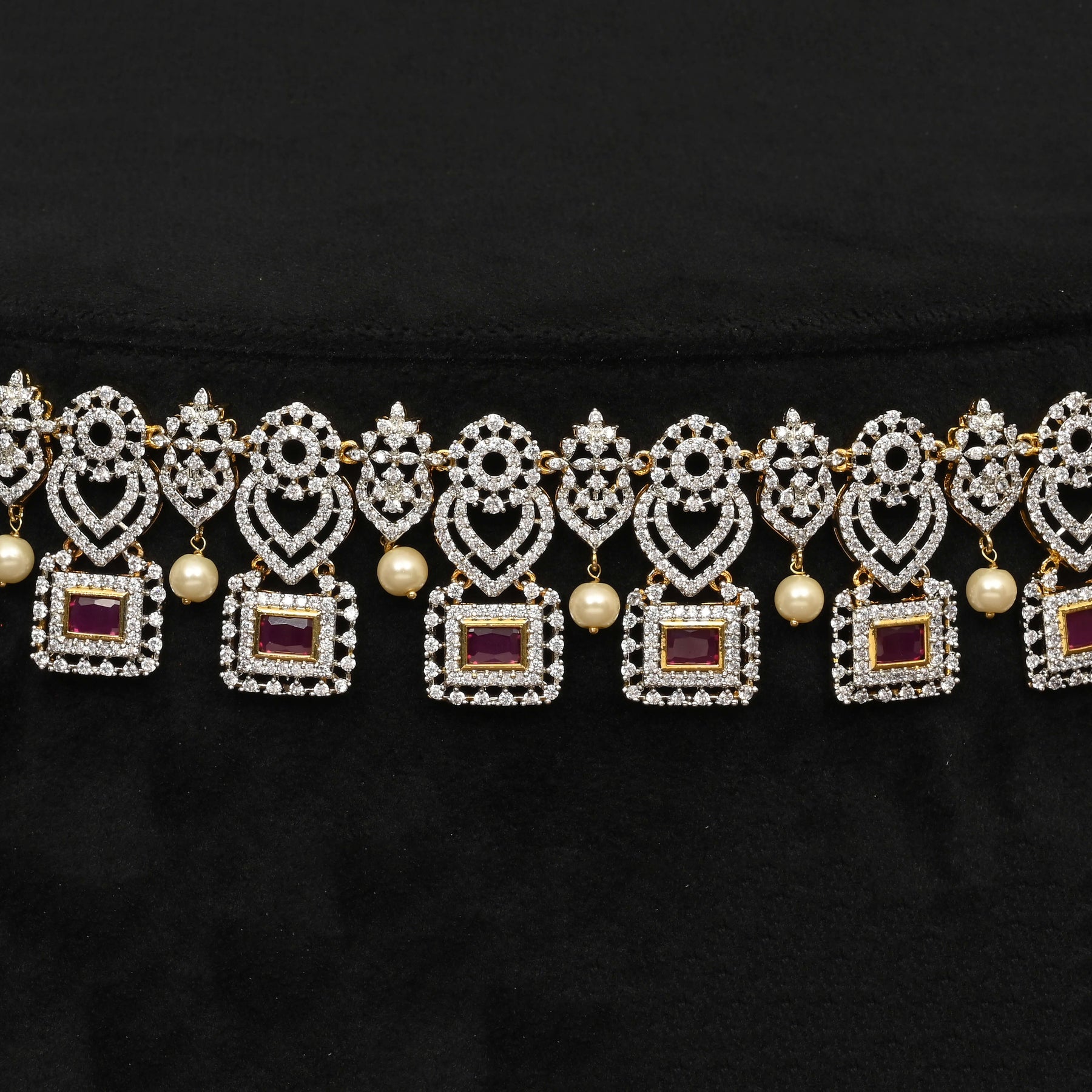 This Chain Vaddanam showcases a stunning diamond-finish that mimics the brilliance of real diamonds, enhanced with semi-precious ruby stones for a rich contrast. Meticulously handcrafted, each piece embodies a unique design, making it truly one of a kind. Perfect for those seeking elegance with expert craftsmanship and distinct style.