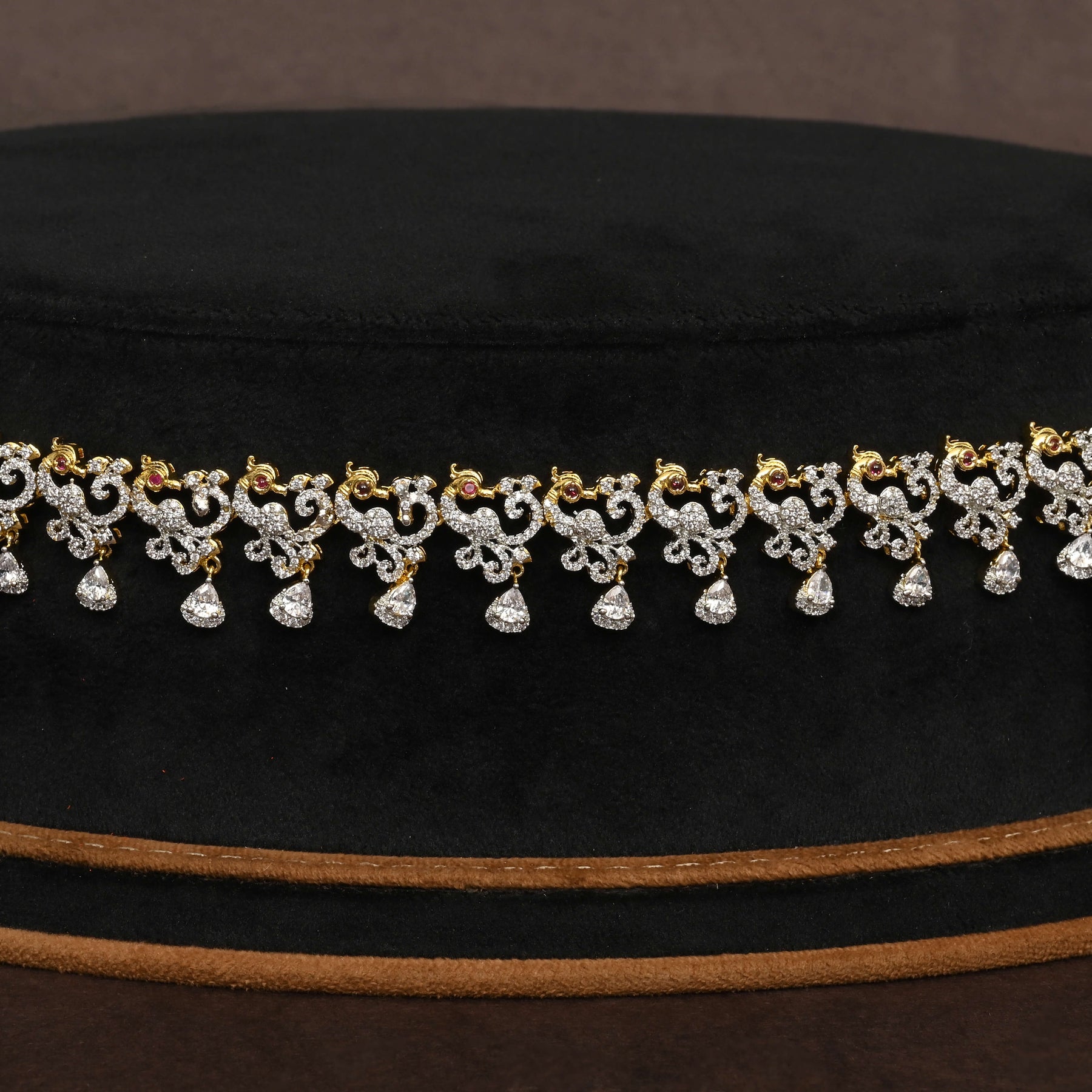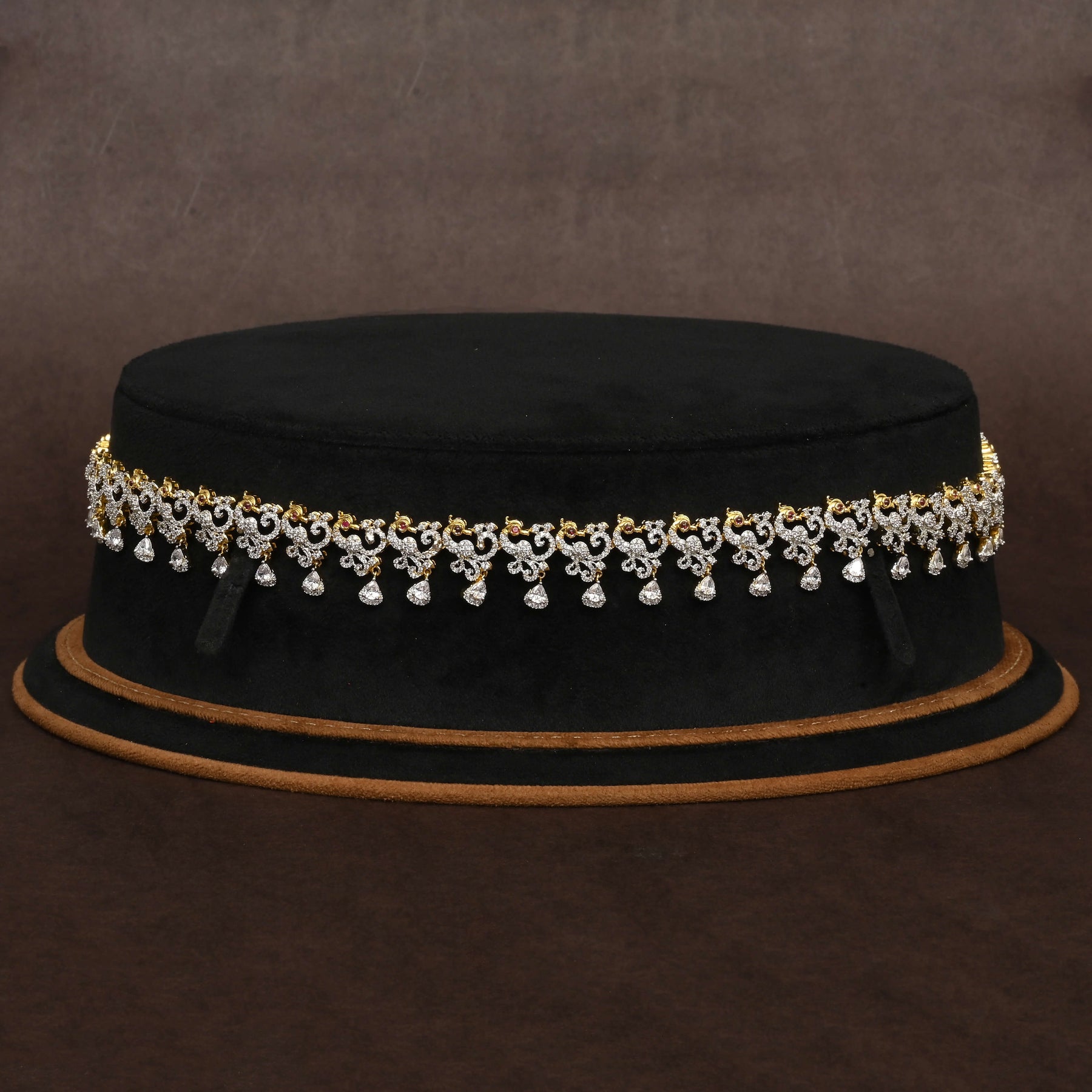This Chain Vaddanam showcases exquisite craftsmanship with a diamond-finish that closely mimics the brilliance of real diamonds. Handcrafted with precision, it features a unique, one-of-a-kind design that elevates traditional elegance with modern artistry. Perfect for those seeking a distinctive accessory that combines timeless appeal with meticulous detail.