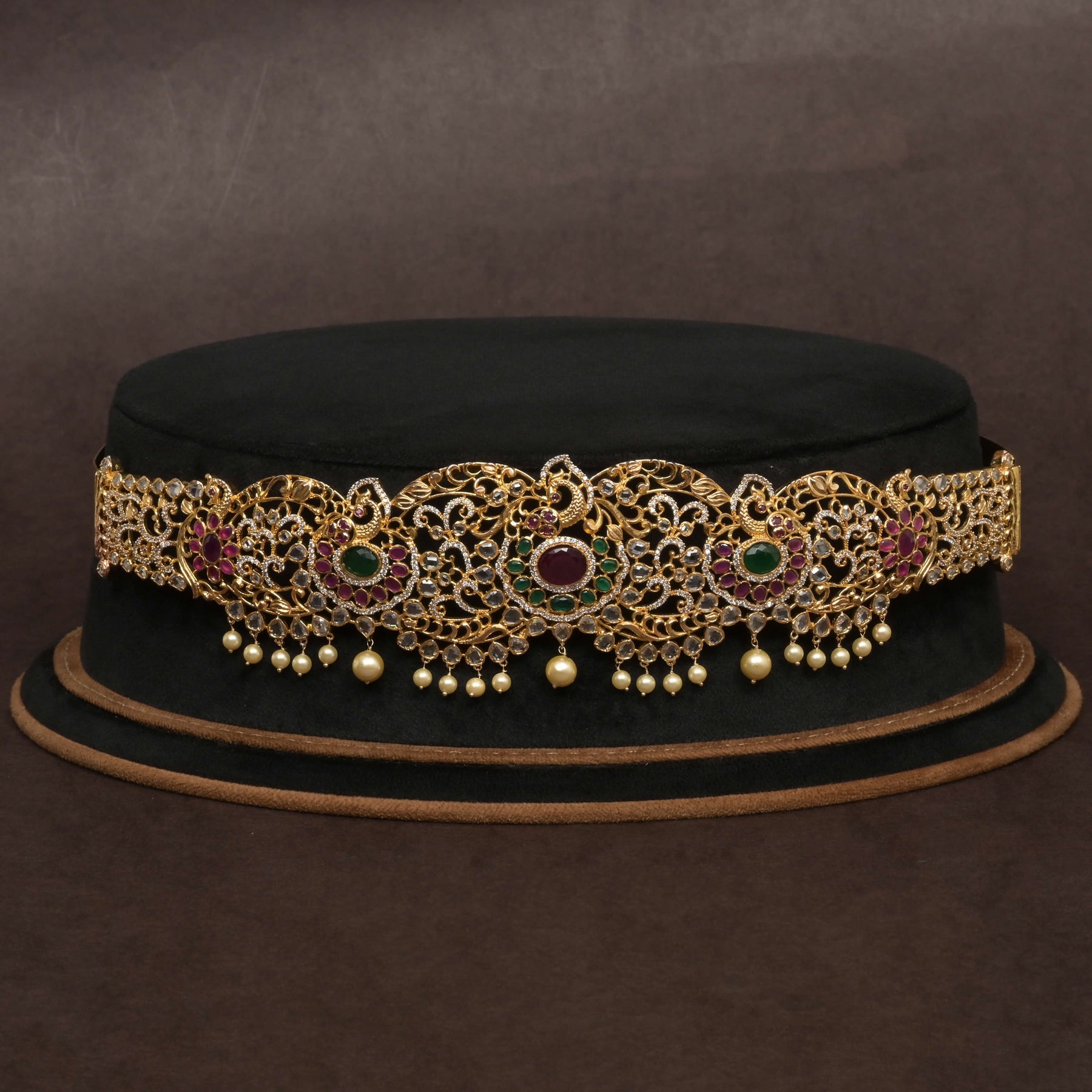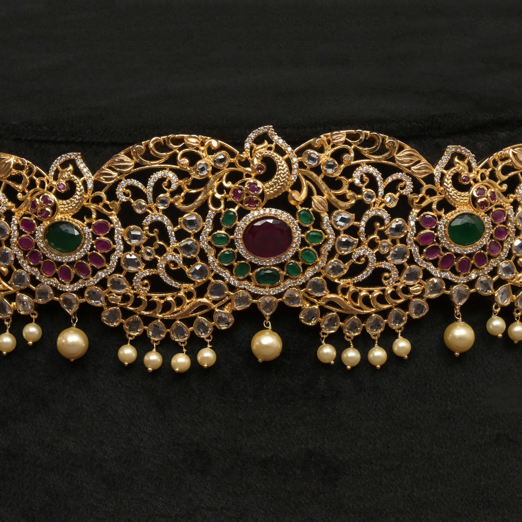 This CZ Polki Vaddanam showcases exquisite craftsmanship with a gold-finish base that radiates luxury. Adorned with genuine CZ stones alongside semi-precious emerald and ruby accents, it offers a vibrant, elegant appeal. Handcrafted to perfection, this piece features a unique, one-of-a-kind design, making it an exceptional statement accessory for traditional occasions.