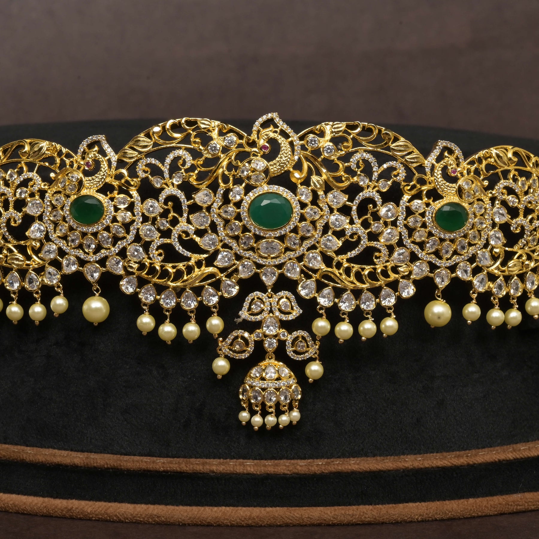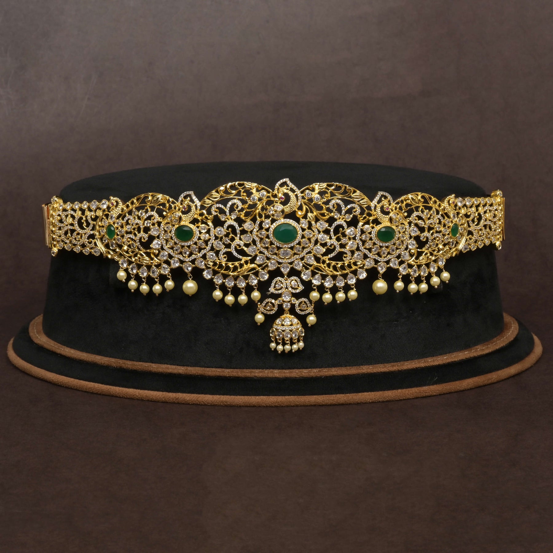 This CZ Vaddanam features a stunning gold finish that mimics the richness of real gold while offering the brilliance of genuine CZ stones. Handcrafted with meticulous attention to detail, this piece boasts a unique, one-of-a-kind design that elevates traditional elegance with modern craftsmanship. Perfect for those seeking timeless beauty with a distinctive touch.