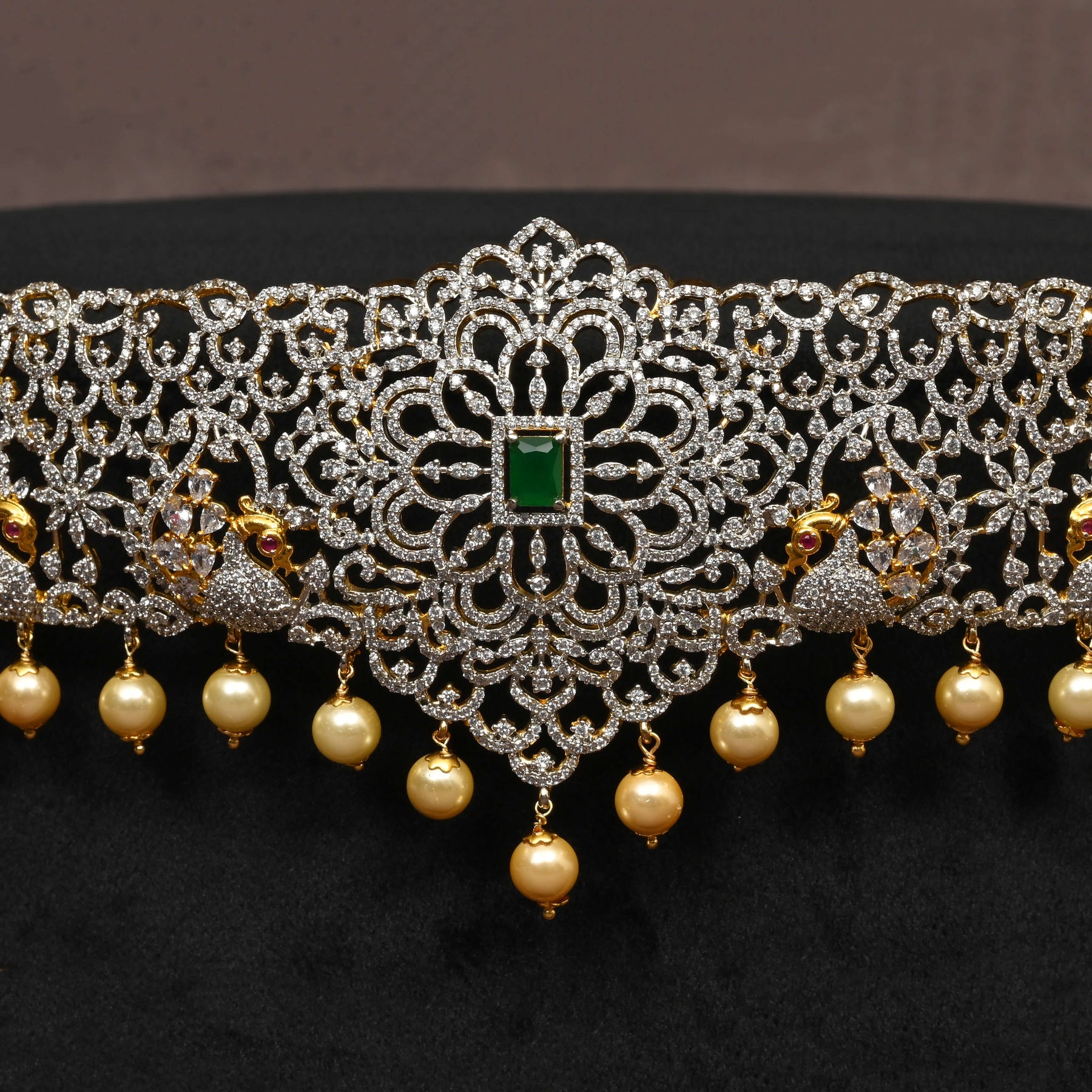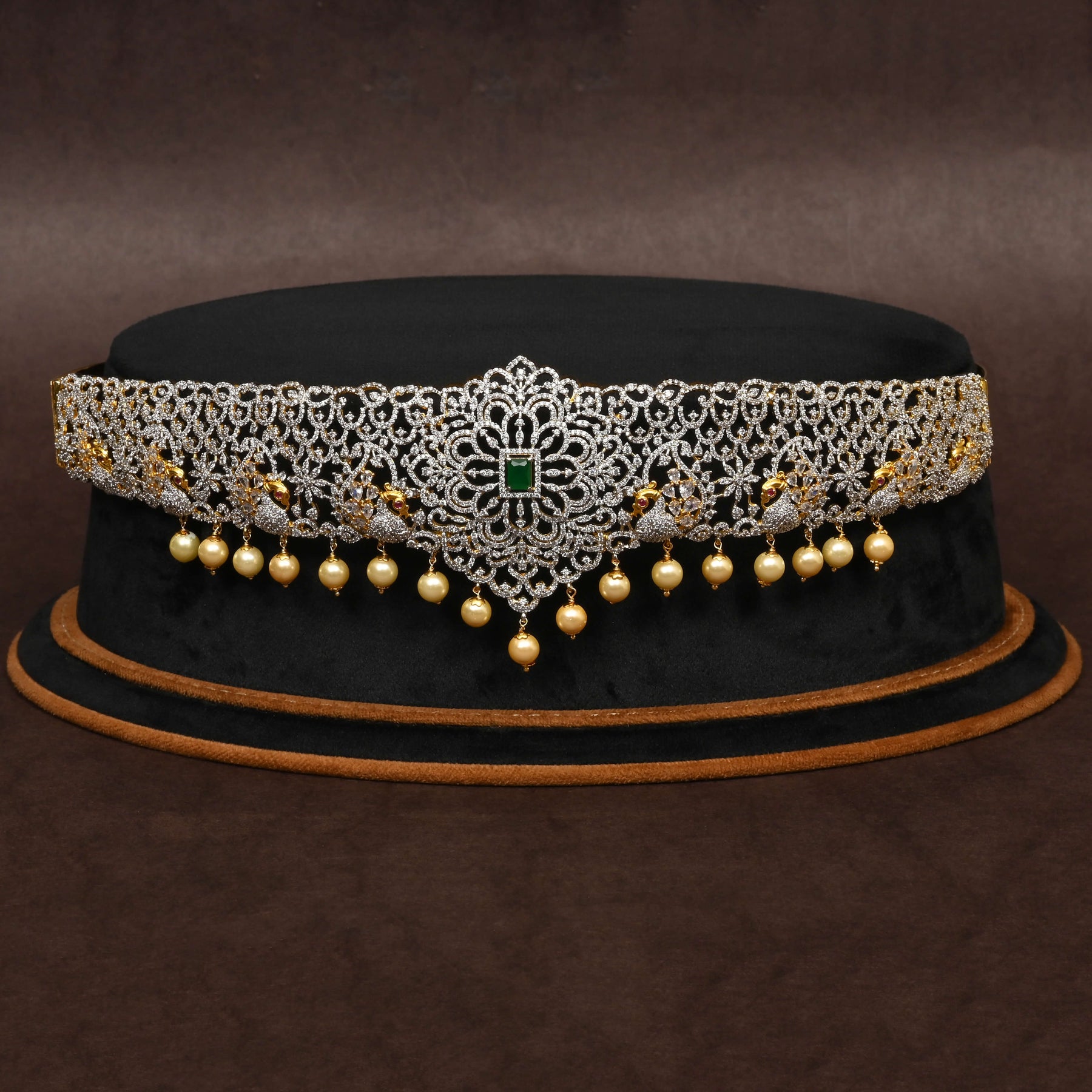 This CZ Vaddanam showcases a radiant diamond finish and is expertly handcrafted for a truly unique design. Featuring genuine CZ stones complemented by semi-precious emerald accents, it offers a sophisticated blend of brilliance and color. Perfect for elevating traditional ensembles, this one-of-a-kind piece reflects exceptional craftsmanship and enduring elegance.