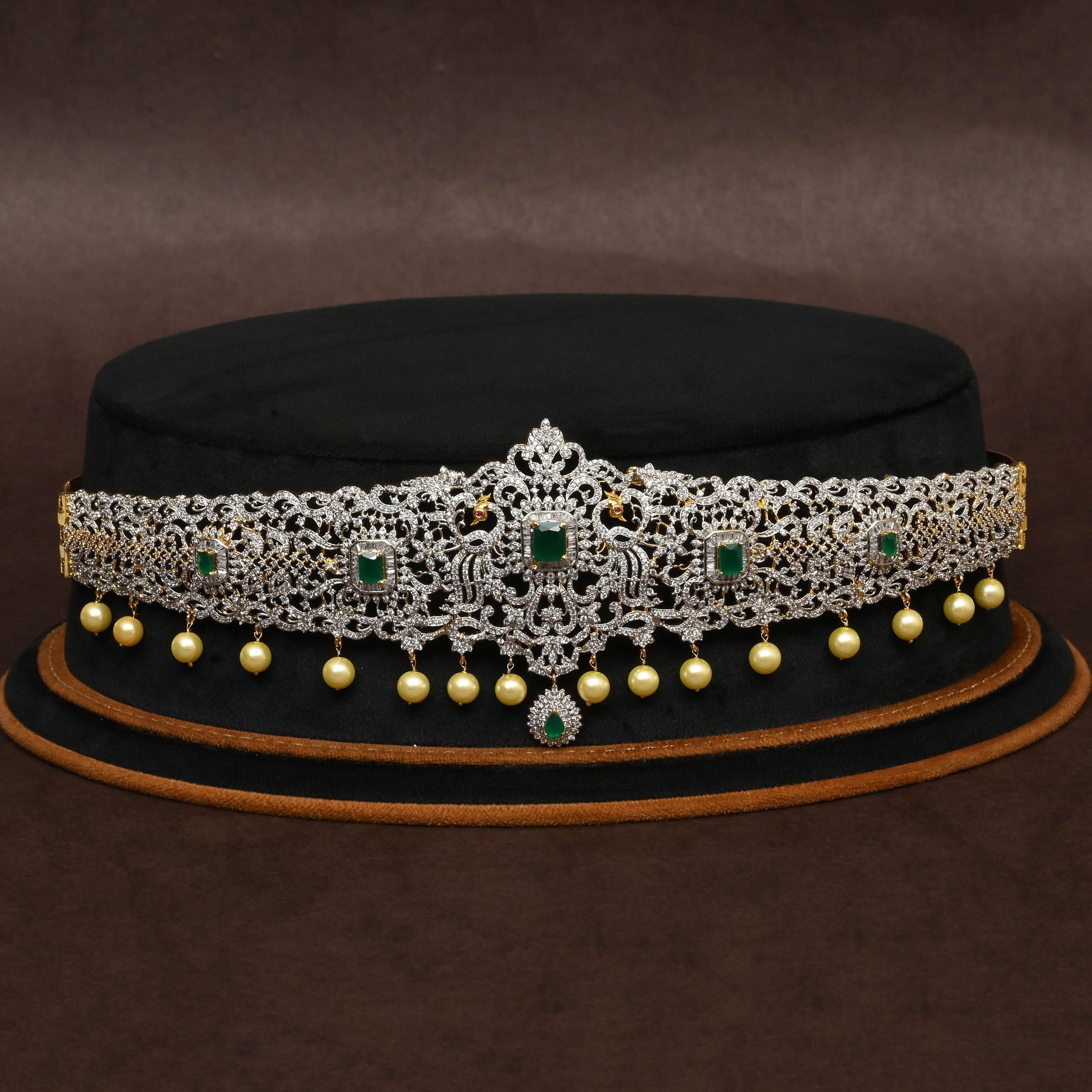 This exquisite CZ Vaddanam features a sophisticated diamond finish that enhances its luxurious appeal. Adorned with genuine CZ stones and a stunning semi-precious emerald centerpiece, this handcrafted piece stands as a testament to exceptional craftsmanship. Each Vaddanam is uniquely designed, ensuring you own a one-of-a-kind treasure perfect for special occasions and traditional celebrations.