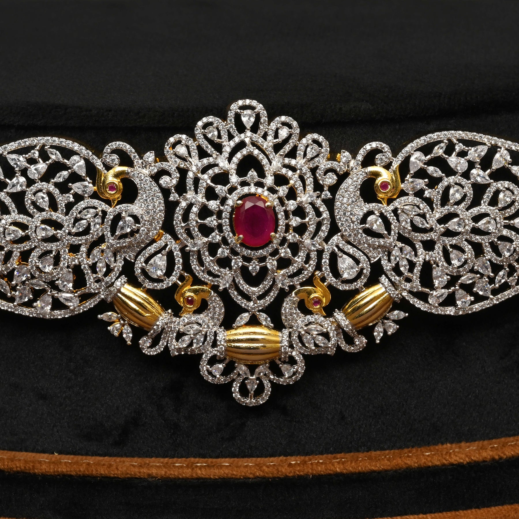 This exquisite CZ Vaddanam features a diamond-finish craftsmanship adorned with genuine cubic zirconia stones, offering the brilliance of diamonds with enduring sparkle. Accented by semi-precious ruby stones, this handcrafted piece showcases a unique, one-of-a-kind design that blends traditional artistry with refined elegance, perfect for enhancing your special occasions with timeless sophistication.