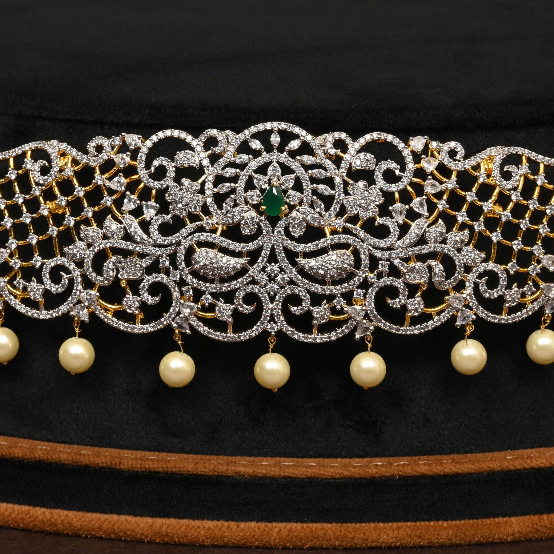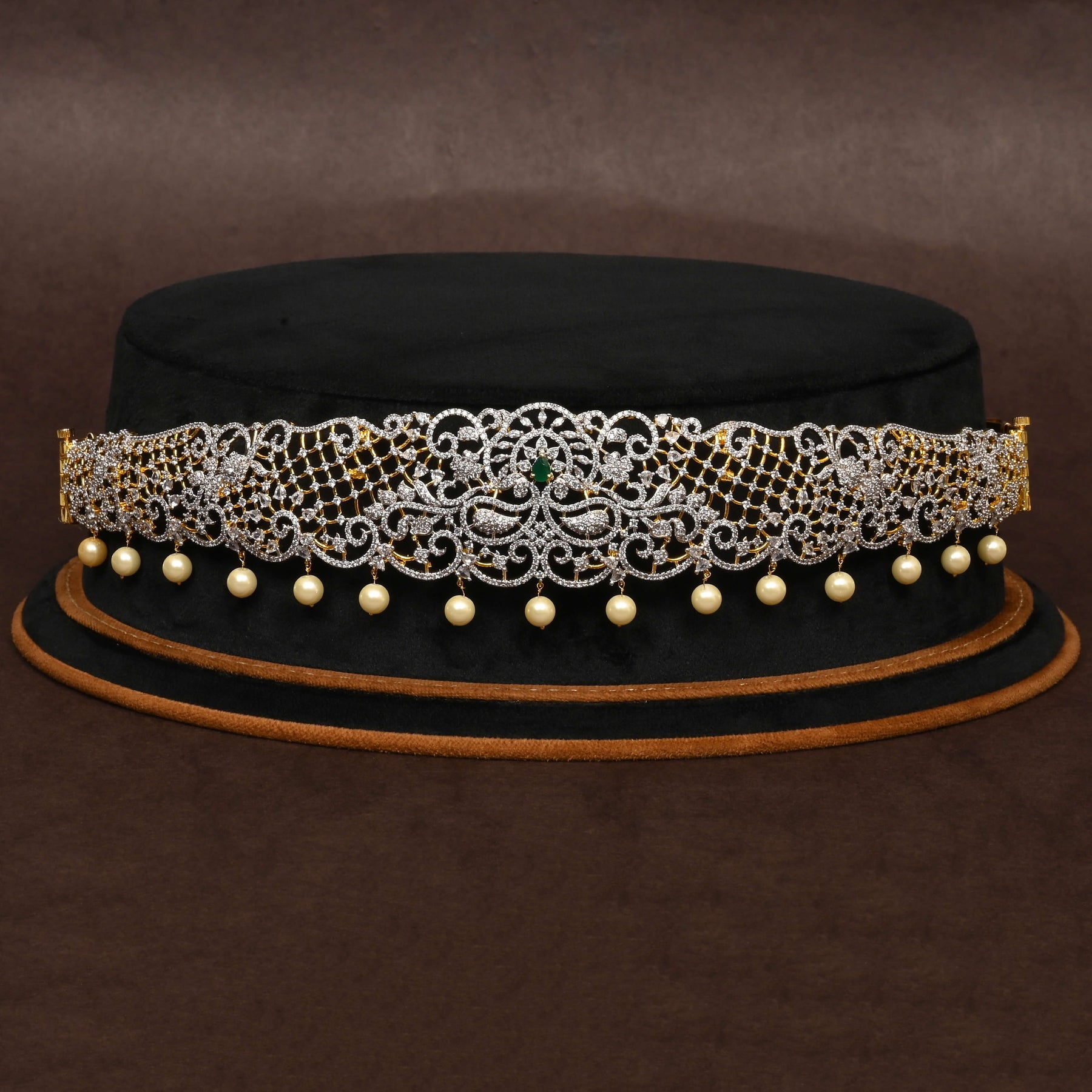 This CZ Vaddanam features a stunning diamond finish, expertly crafted by hand to highlight its unique design. Adorned with genuine CZ stones and a semi-precious emerald centerpiece, it offers a perfect blend of elegance and sophistication. Each piece is one of a kind, making it an exceptional choice for those seeking distinctive, high-quality traditional jewelry.